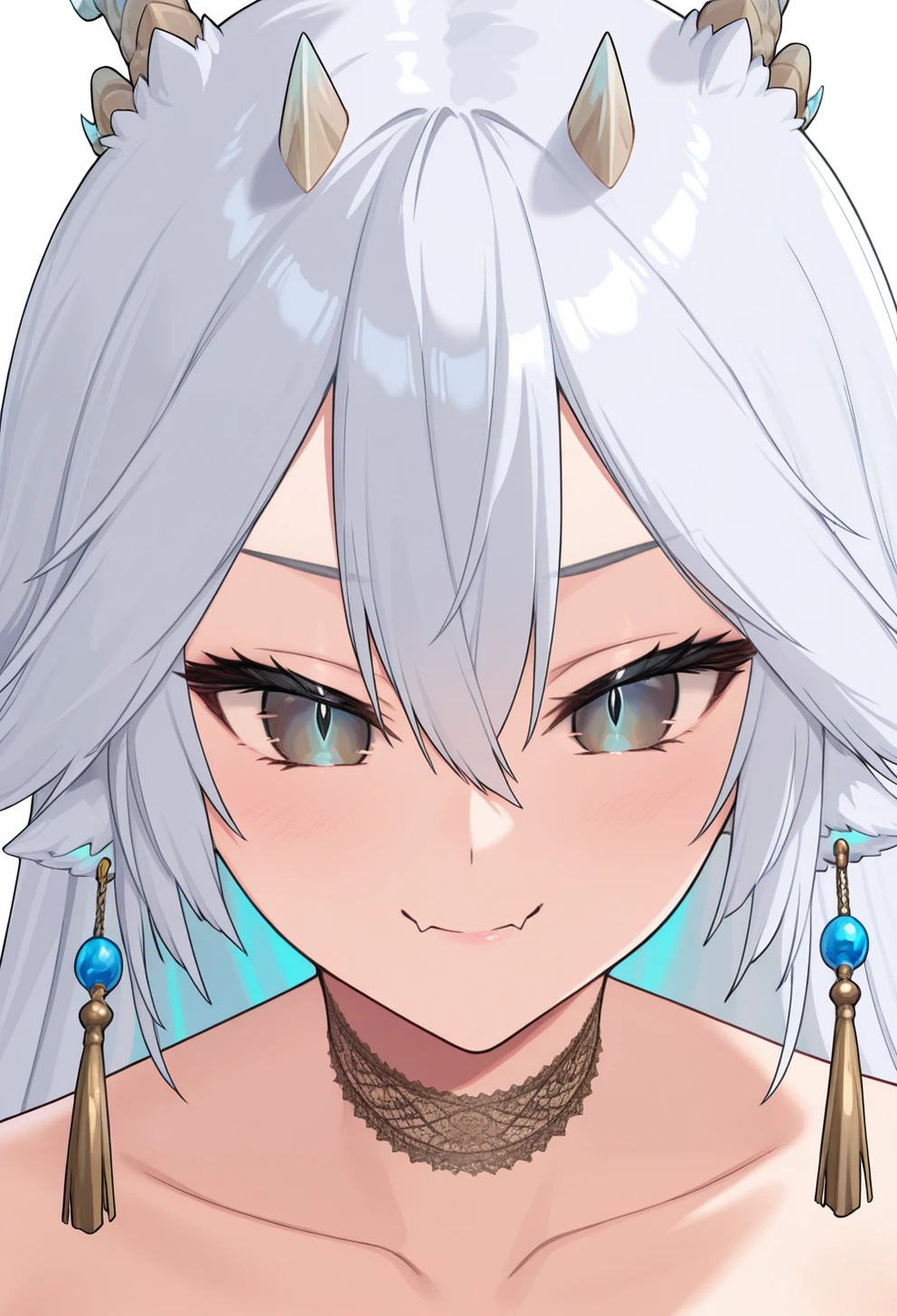 1girl,blue eyes, brown eyes, slit pupils, animal ears, dragon girl, dragon horns, multiple horns, dragon tail, flame-tipped tail, large breasts, collarbone, white hair, colored inner hair, blue hair, hair between eyes, long hair, very long hair,