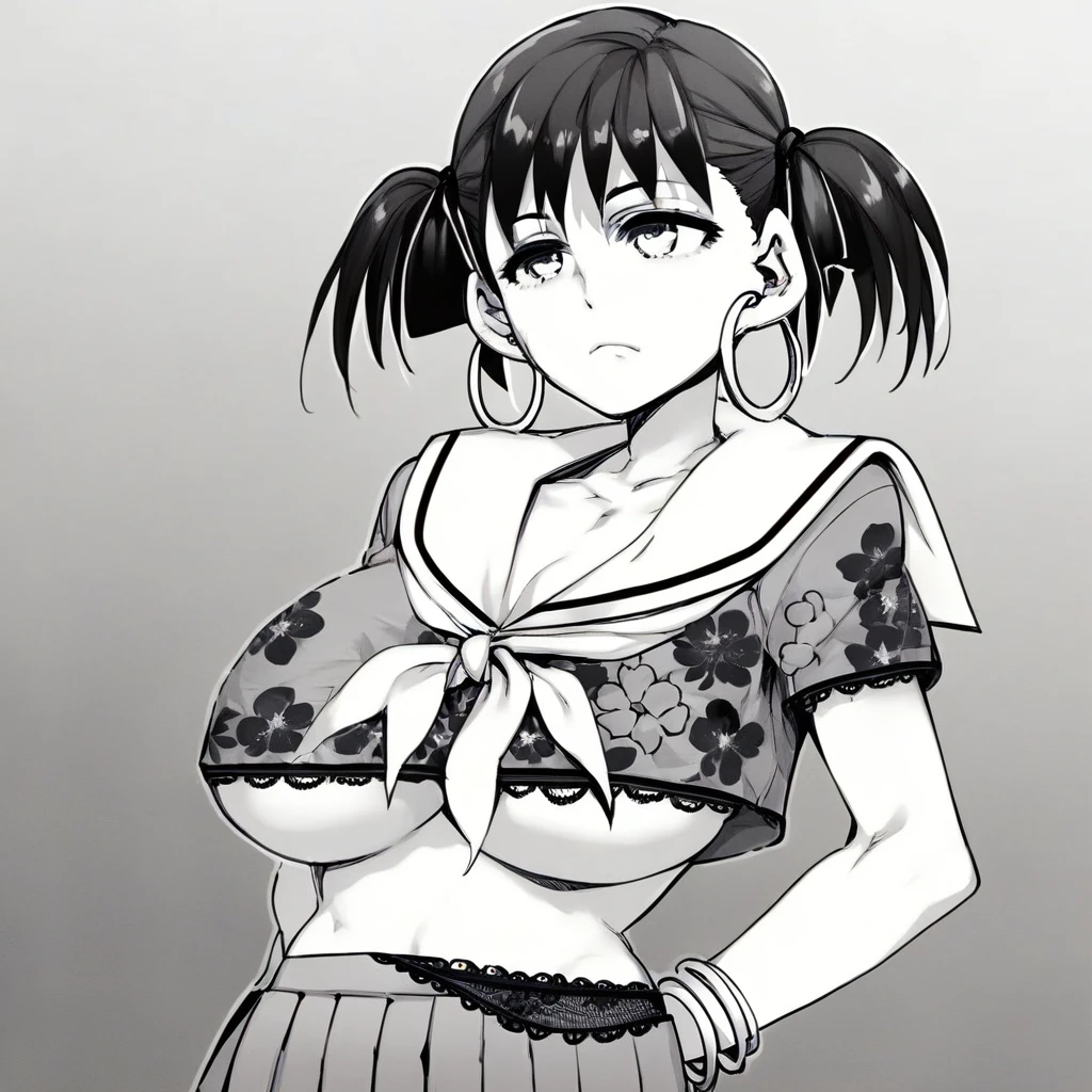Touko Matsudaira: touko_matsudaira, piercing brown eyes, beautiful brown hair, beautiful short twintails, ojou curls, bangs, big and shaggy breasts, pink hair bands,