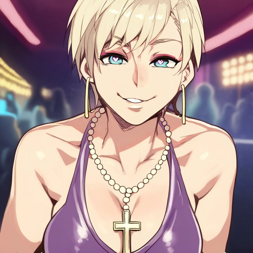 Hasekura Rei: hasekura_rei, piercing light blue eyes, beautiful blonde hair, beautiful short hair, bangs, huge and shaggy breasts,