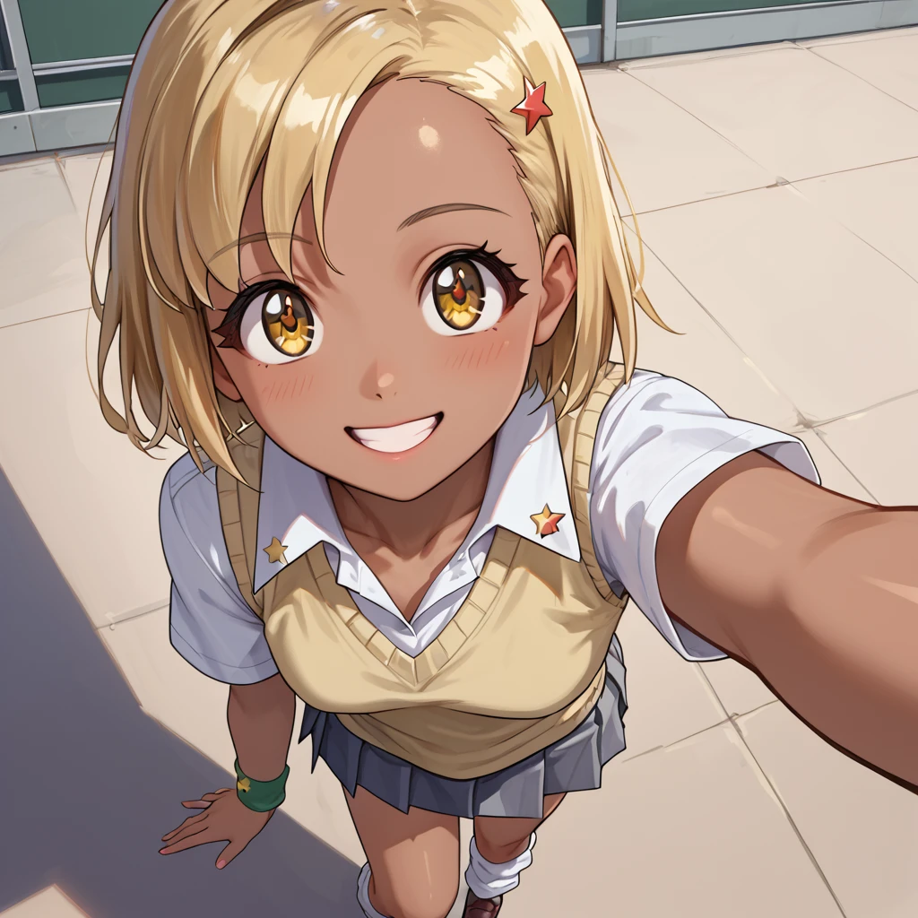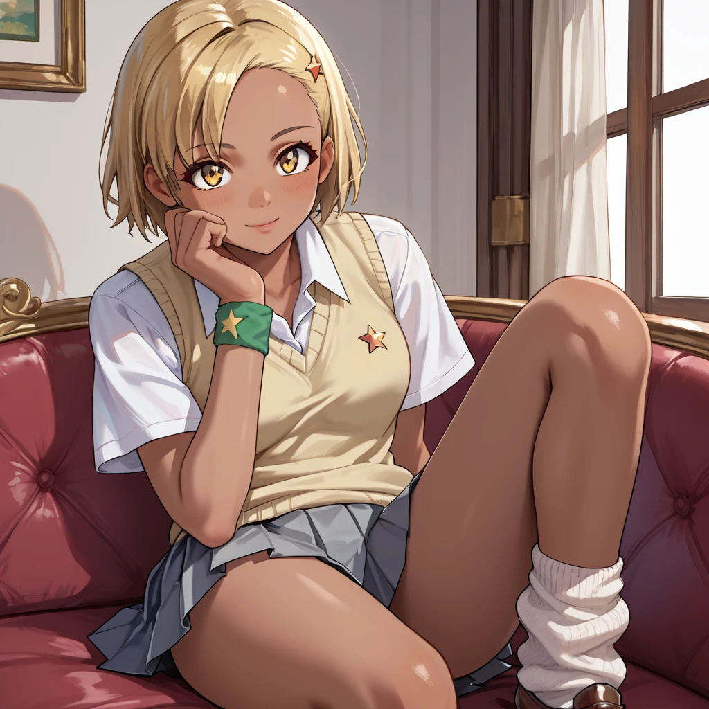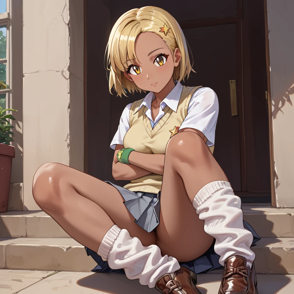 Angol_Mois_Tf, 1girl, solo, short hair, blonde hair, yellow eyes, dark skin, dark-skinned female, hair ornament, hairclip, school uniform, shirt, sweater vest, one wristband, pleated skirt, grey skirt, loose socks, shoes, brown footwear
