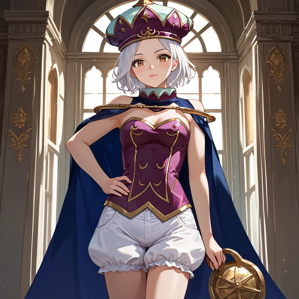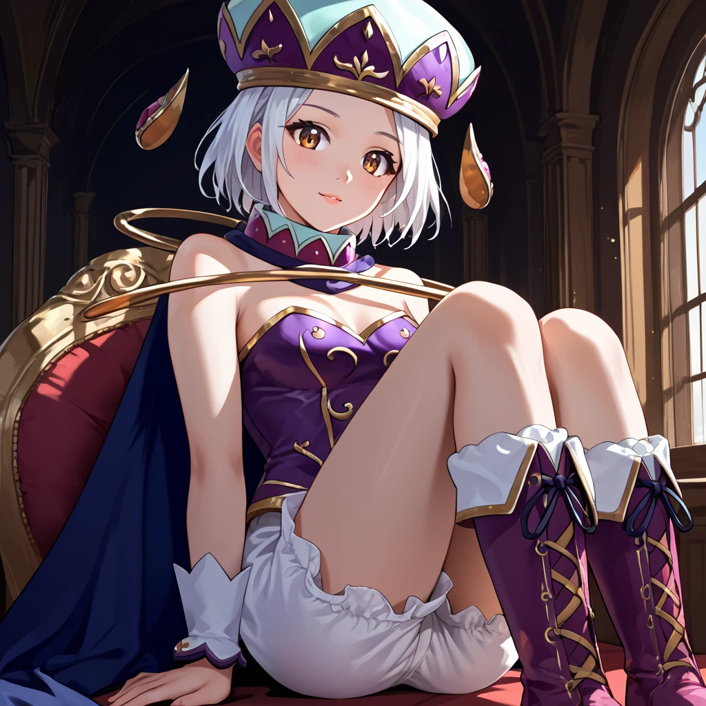 Angol_Mois_Nm, 1girl, solo, white hair, short hair, brown eyes, hat, bare shoulders, cape, white shorts, bloomers, underwear, boots