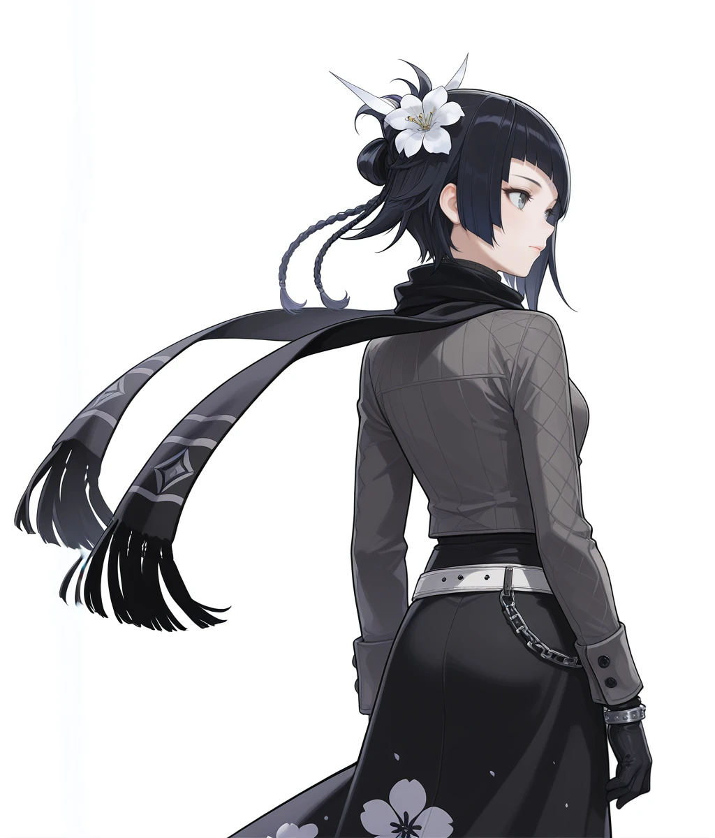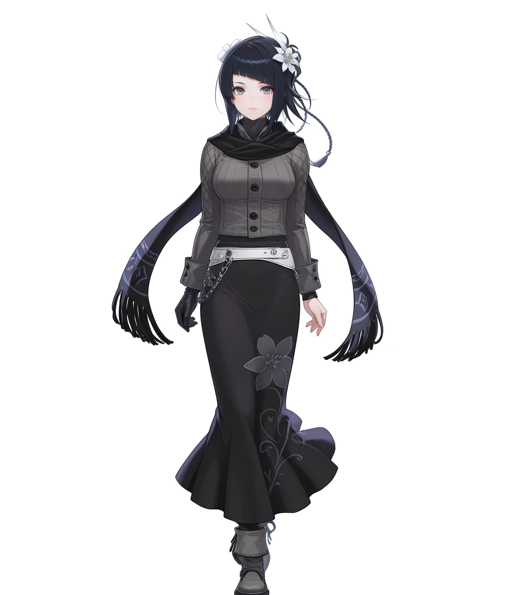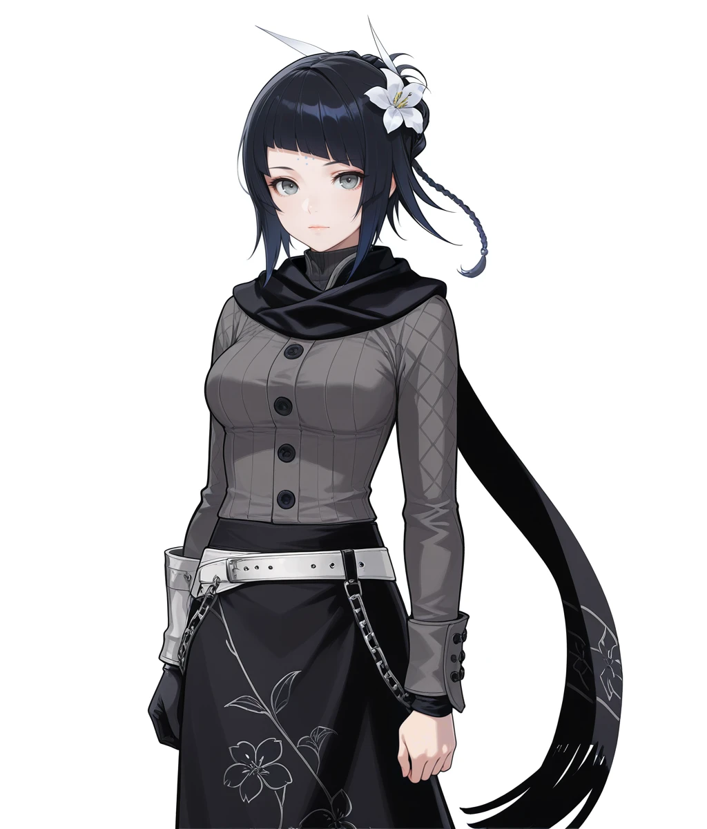 Works on strength 1. Her outfit has a lot of small details that may get scrambled up in the generation (such as her shirt buttons bleeding over into other clothes). Her eyes are also depicted as "black", "grey", "purple" and even "blue", I think the official color is black or dark grey...