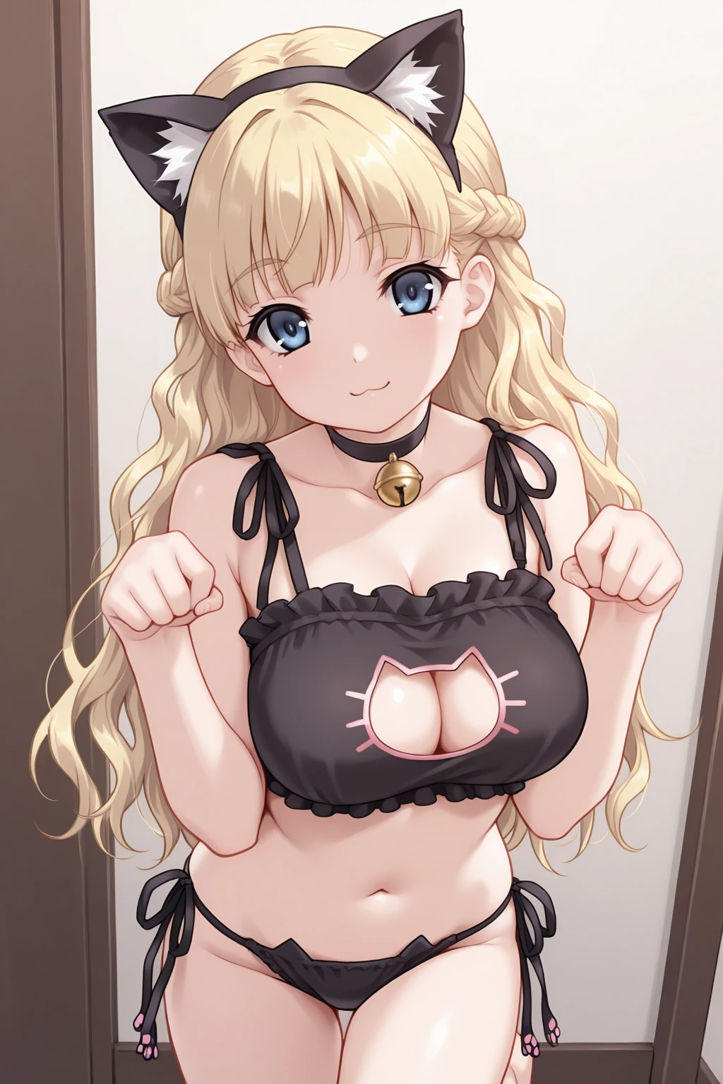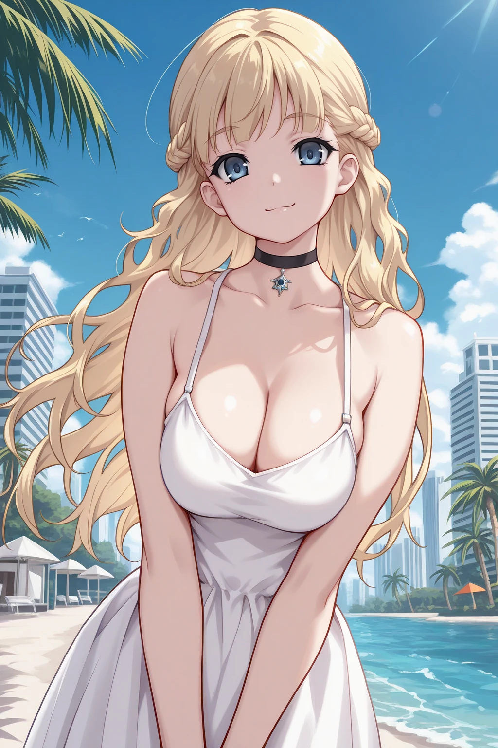 mtsg, large breasts, blue eyes, blonde hair, long hair, half up braid, hair ribbon, black choker