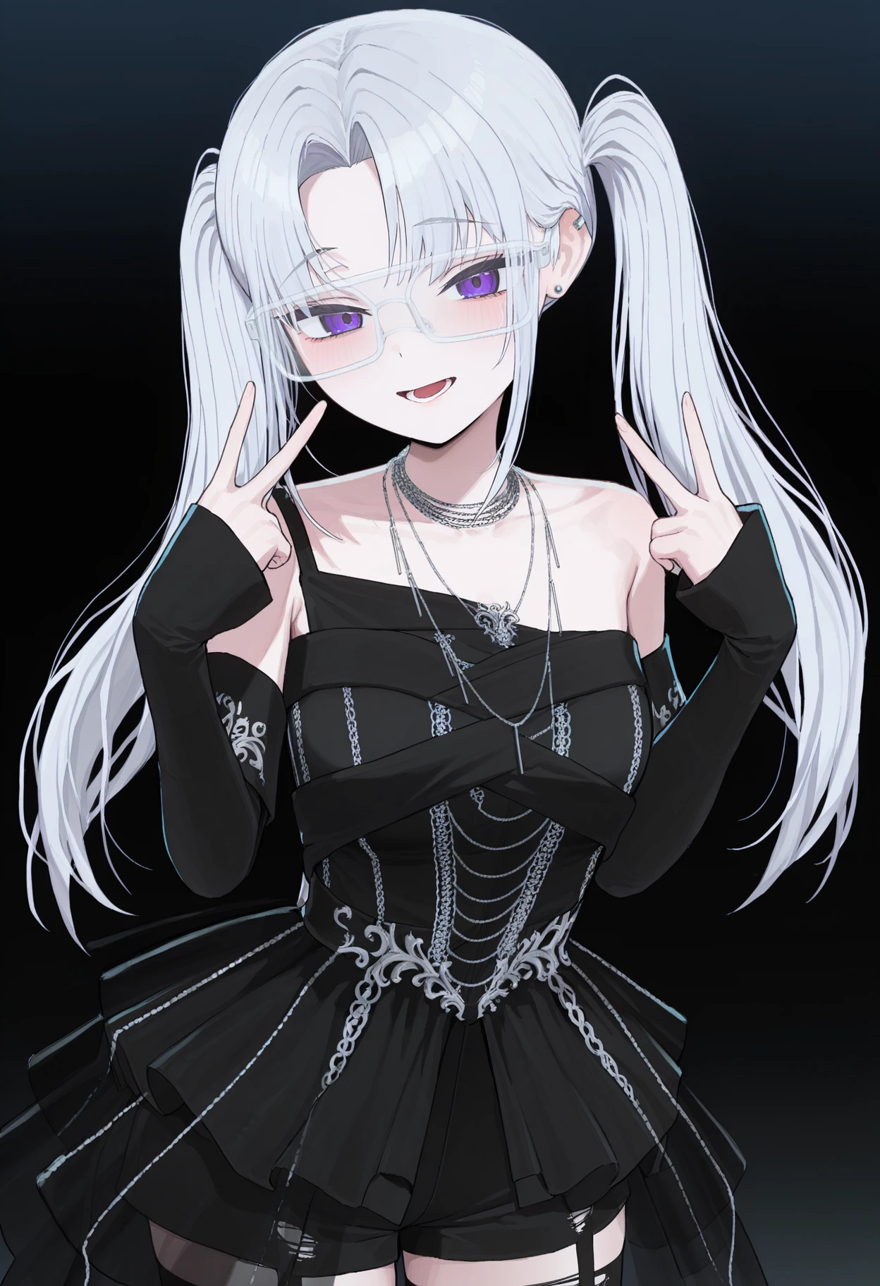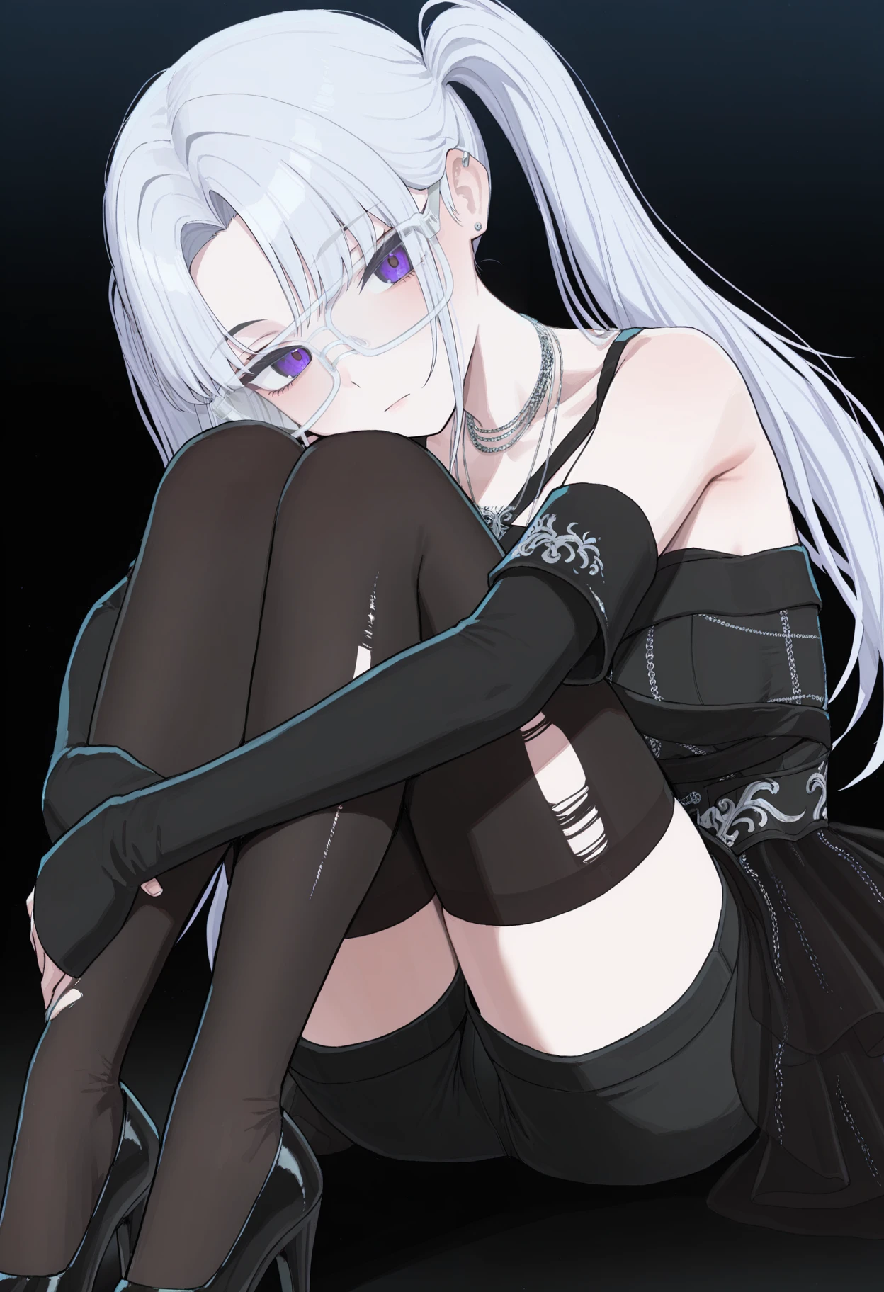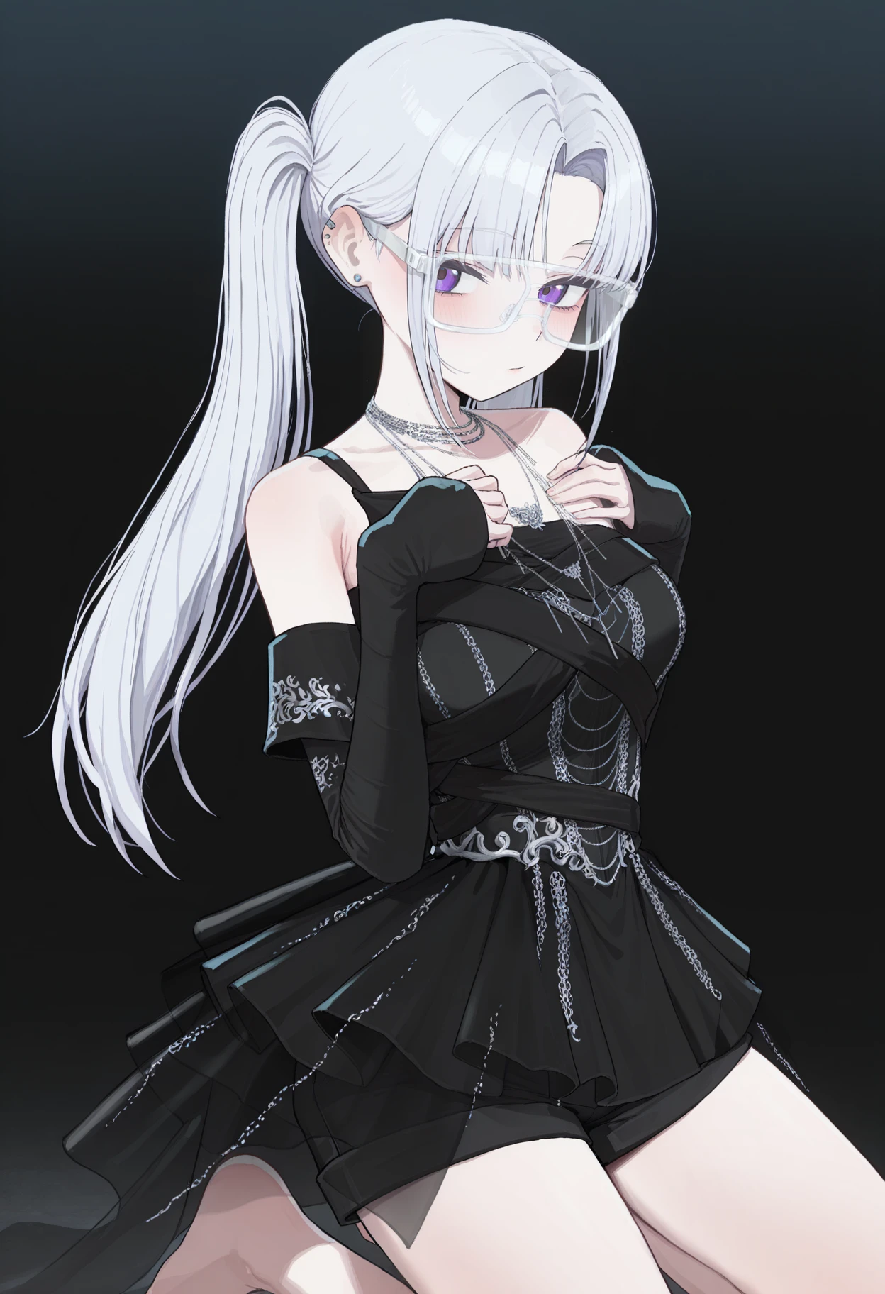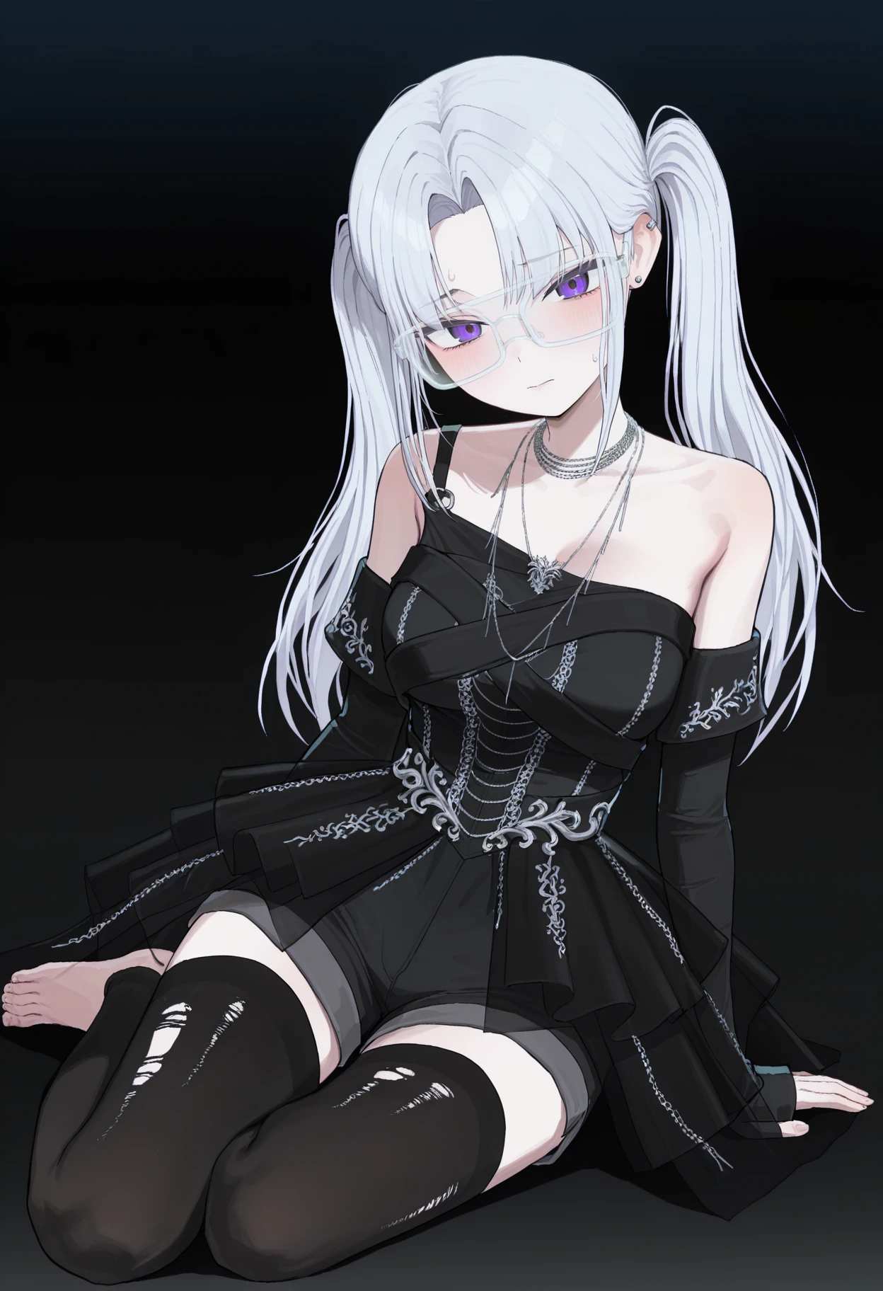 white hair, long hair, twintails, parted bangs, curtained bangs, sidelocks, white-framed eyewear, glasses, white goggles, purple eyes, ear piercing, stud earrings, jewelry, necklace, black dress, single strap, detached sleeves, sleeves past wrists, layered sleeves, lace dress, see-through dress, layered dress, black shorts, shorts under dress, black thighhighs, torn thighhighs, black footwear, high heels