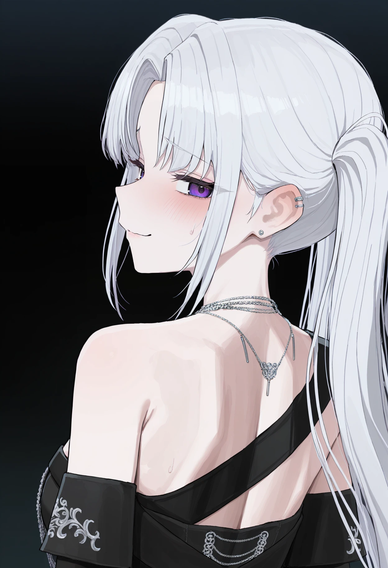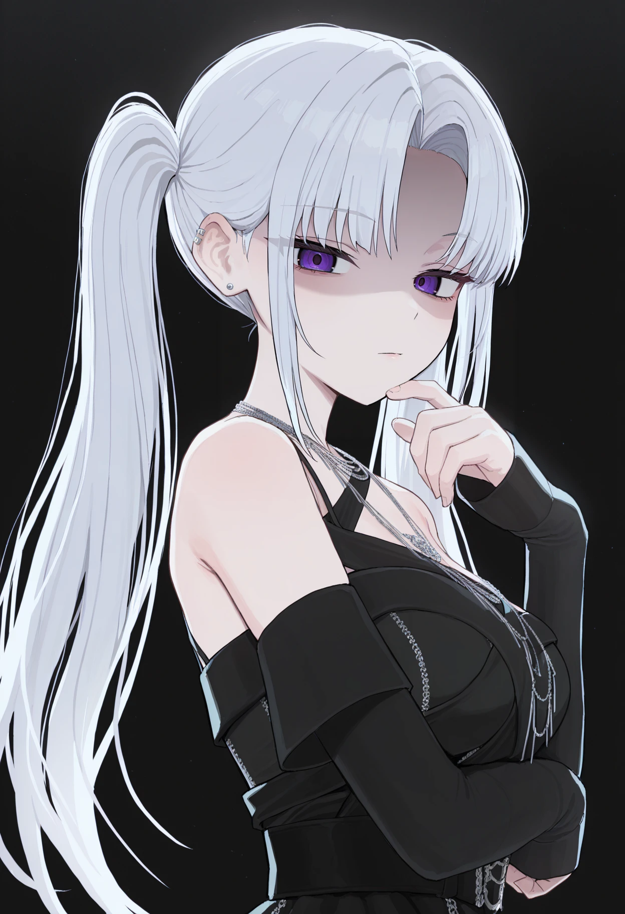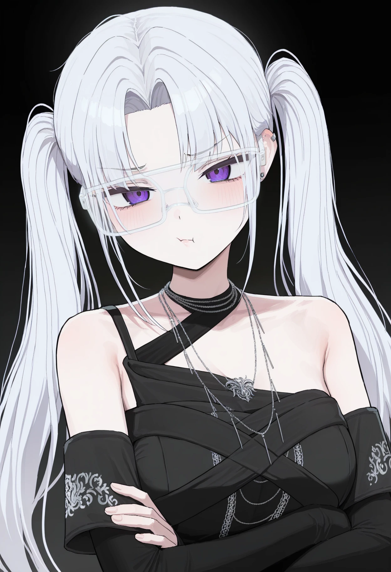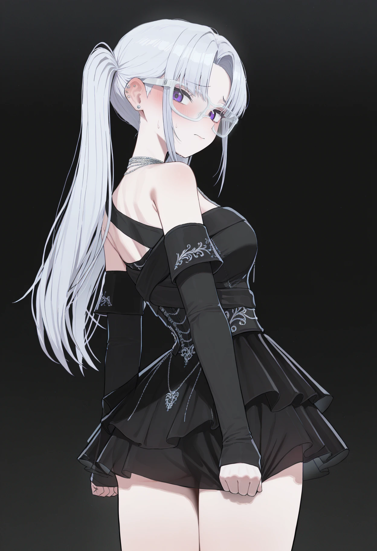 white hair, long hair, twintails, parted bangs, curtained bangs, sidelocks, white-framed eyewear, glasses, white goggles, purple eyes, ear piercing, stud earrings, jewelry, necklace, black dress, single strap, detached sleeves, sleeves past wrists, layered sleeves, lace dress, see-through dress, layered dress, black shorts, shorts under dress, black thighhighs, torn thighhighs, black footwear, high heels