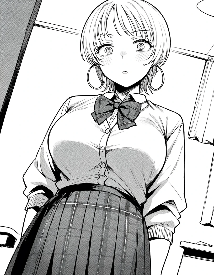 hoop earrings, skirt, shirt, bow, school uniform, pleated skirt, bowtie, plaid, plaid skirt, cardigan,