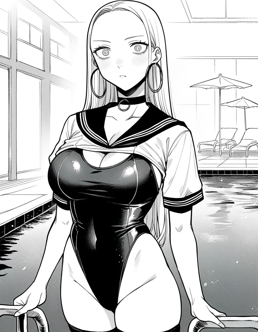 hoop earrings, thighhighs, cleavage, jewelry, swimsuit, earrings, choker, leotard, one-piece swimsuit, sailor collar, short sleeves,