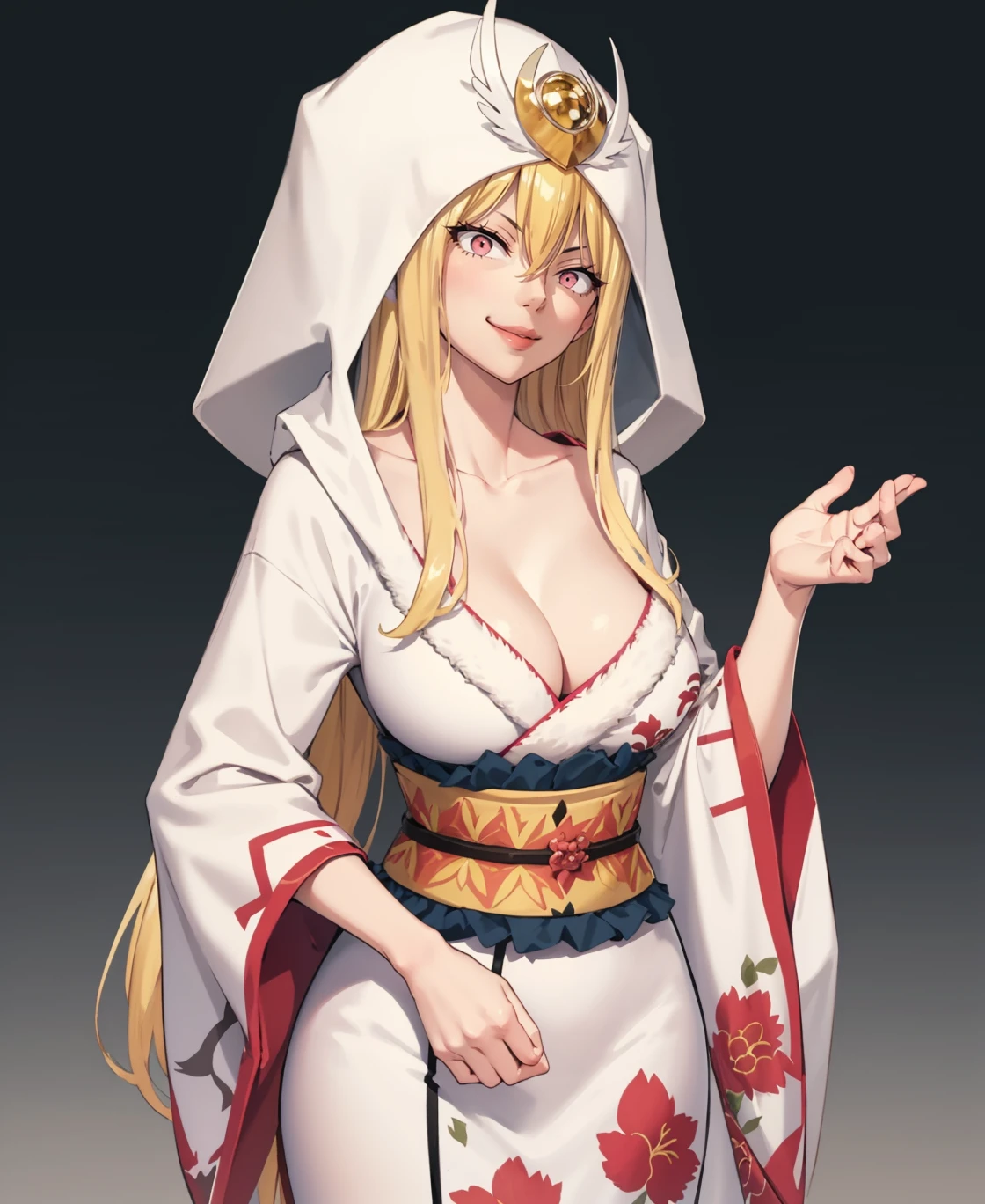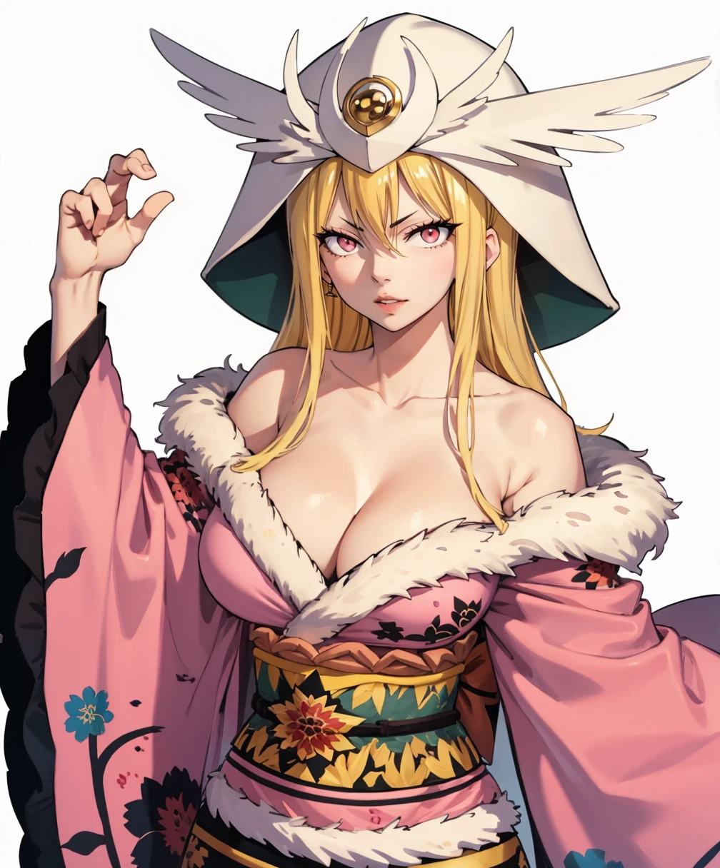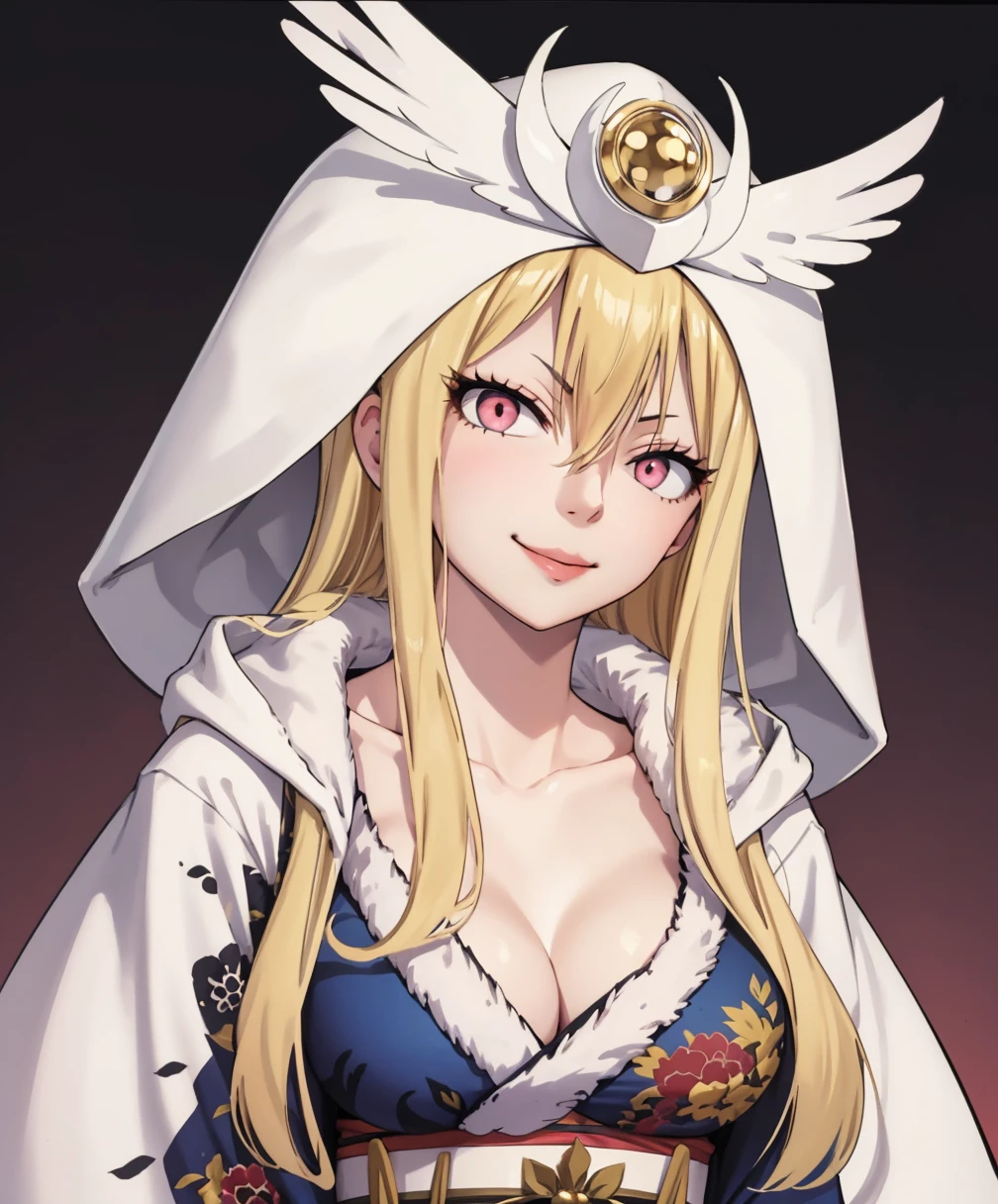 ftselenekim,pink eyes,mature female, blonde hair,hat,hood,