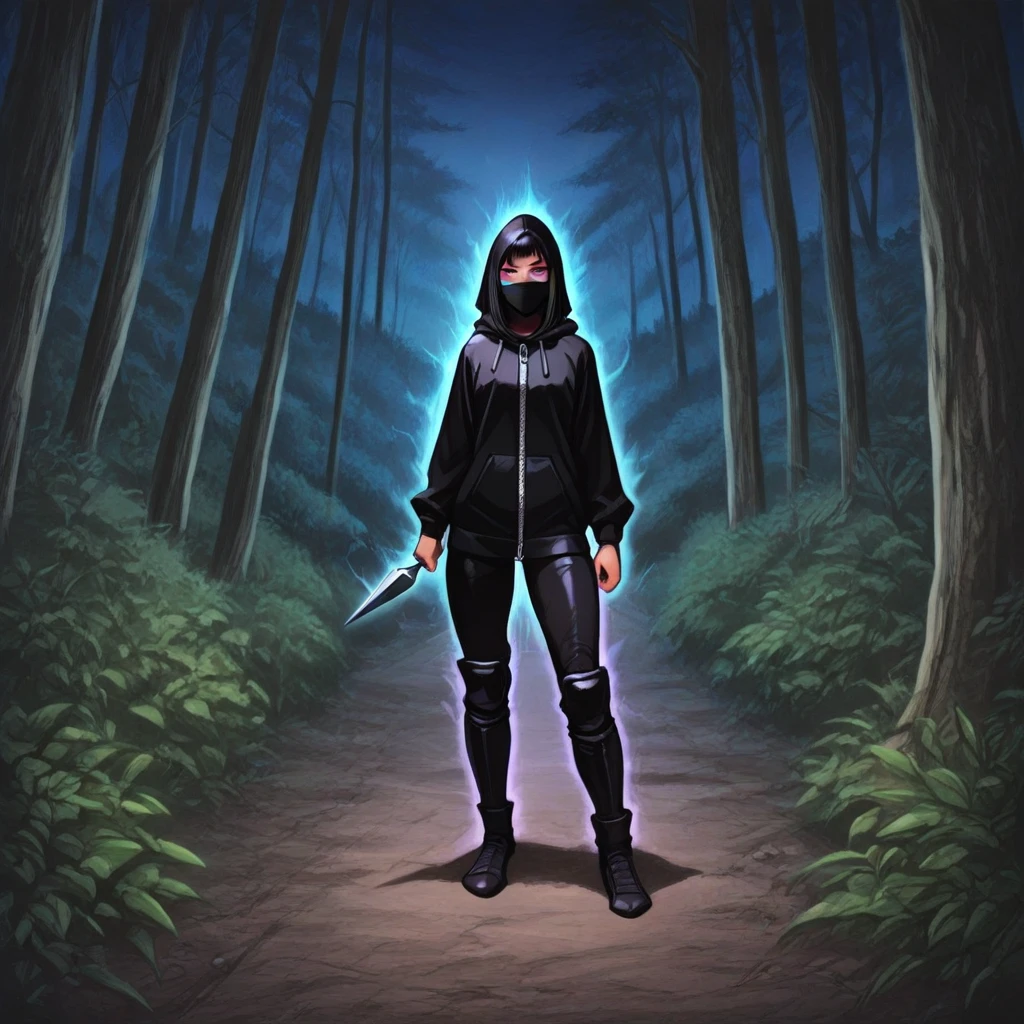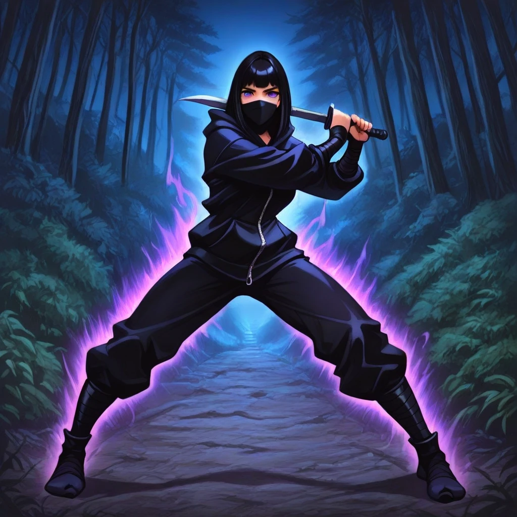 ninja, female ninja, black hoodie with long zipper, kunai knives, katana, purple aura