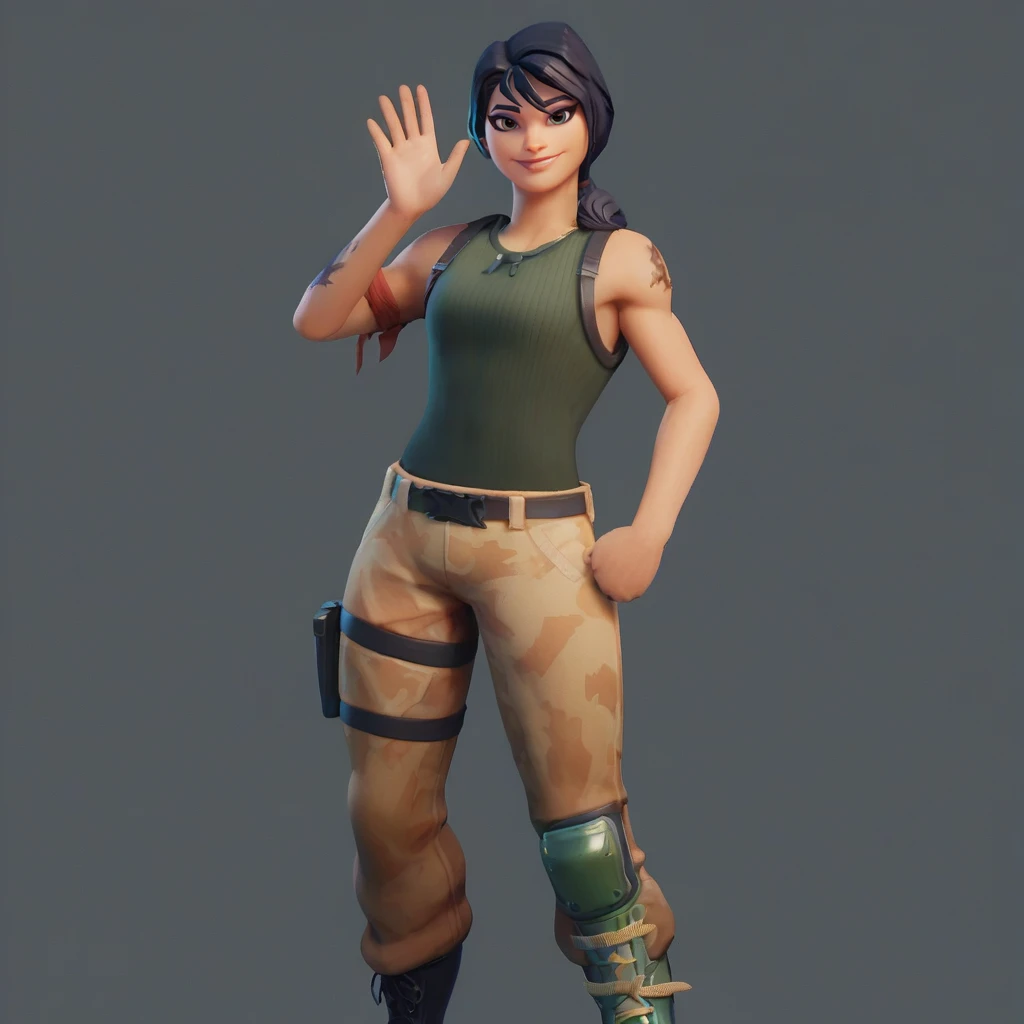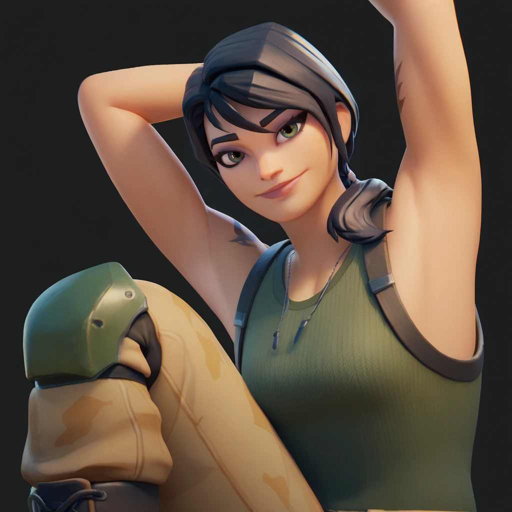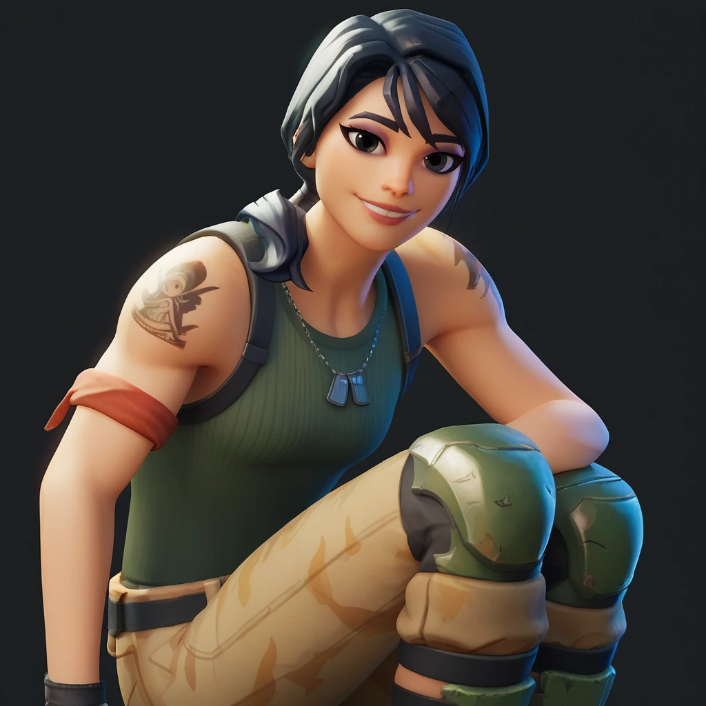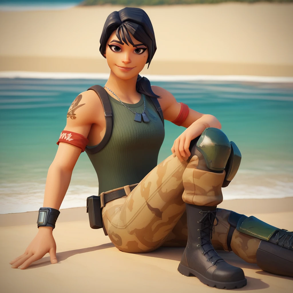 hhft, tattoo, sleeveless, black hair, bangs, ponytail, hair over shoulder, knee pads, tank top, combat boots, camouflage, eyelashes, black eyes, pants, dog tags, armband,
