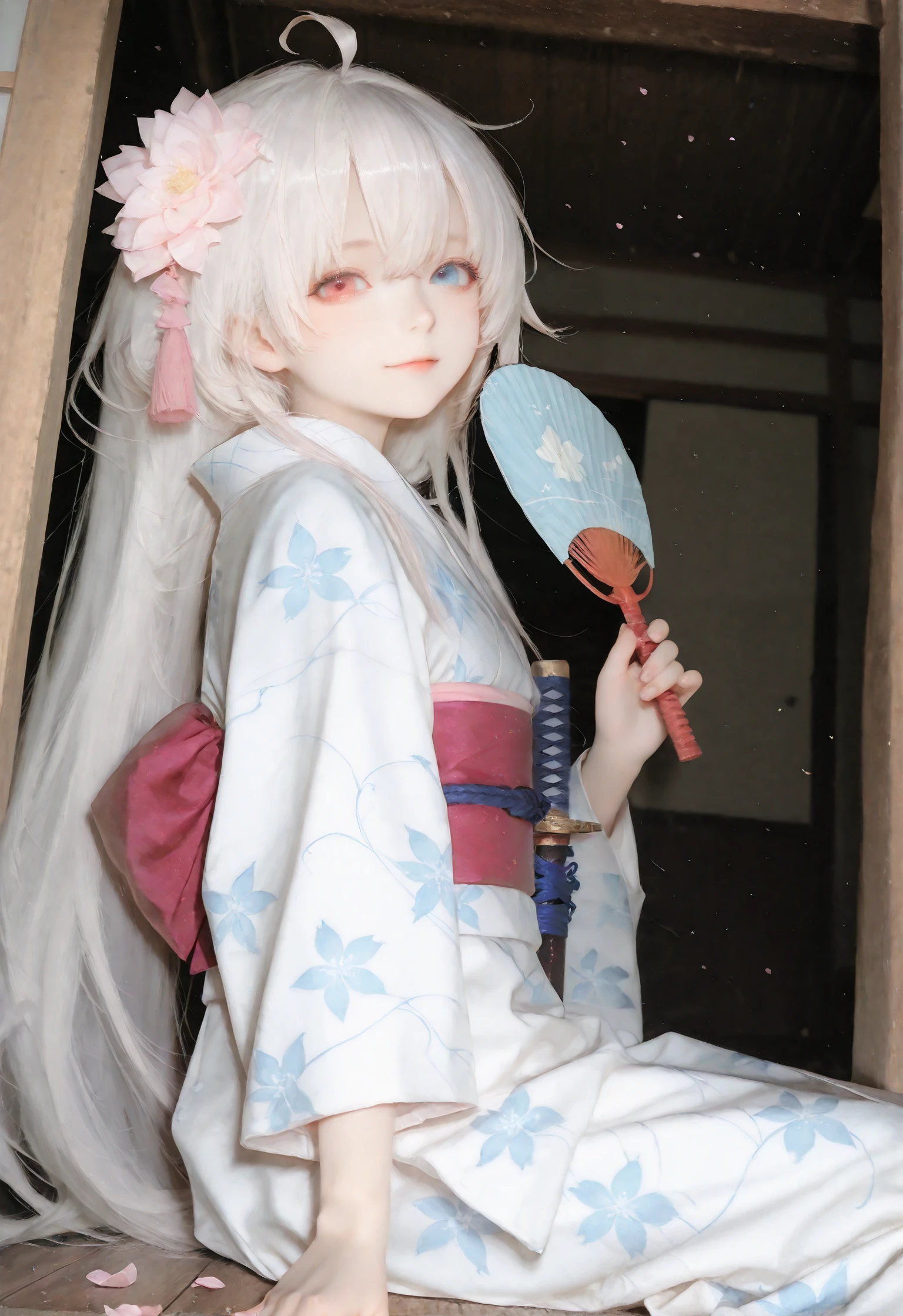 ichijiku-murasaki, heterochromia, left blue eye and right red eye, hair cover right eye, ahoge, white hair, very long hair
