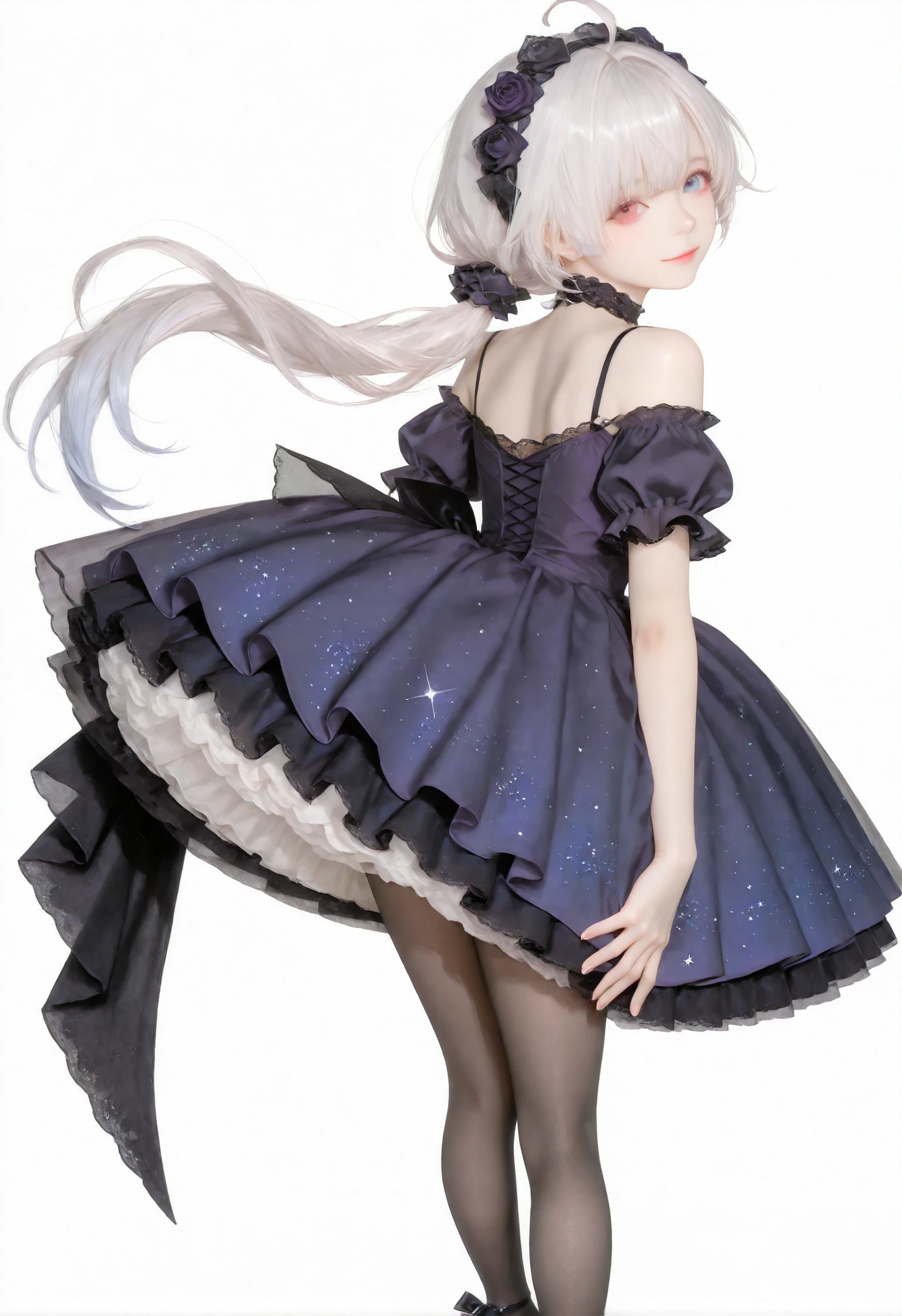 gothic, tulle dress, tutu, dark purple dress, puff sleeves, off shoulder, bare shoulders, layered petticoat, black pantyhose, particles, flowers, lace, mary janes, starry night pattern, translucent