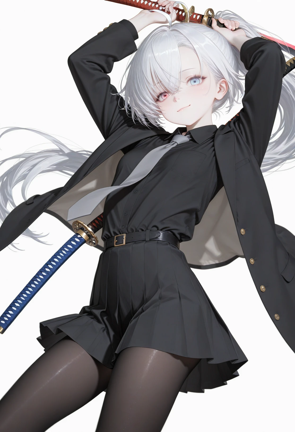 ponytail, black shirt, black skirt, pleated skirt, school uniform, black pantyhose, black jacket, grey necktie