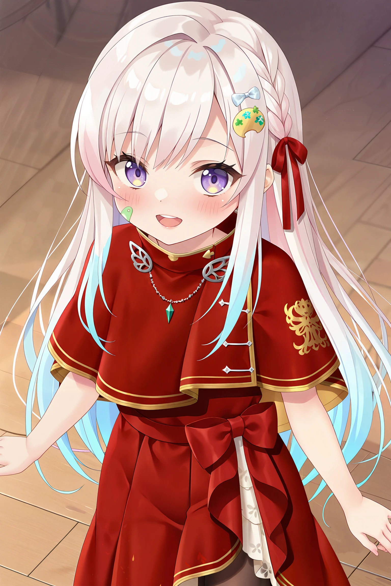 airani iofifteen /(indonesian casual/),hood down,hair ornament,purple eyes,white hair,blue hair,gradient hair,multicolored hair,pink hair,eyebrows visible through hair,red dress,red ribbon,braid,bangs,very long hair,red capelet,black footwear,pantyhose,