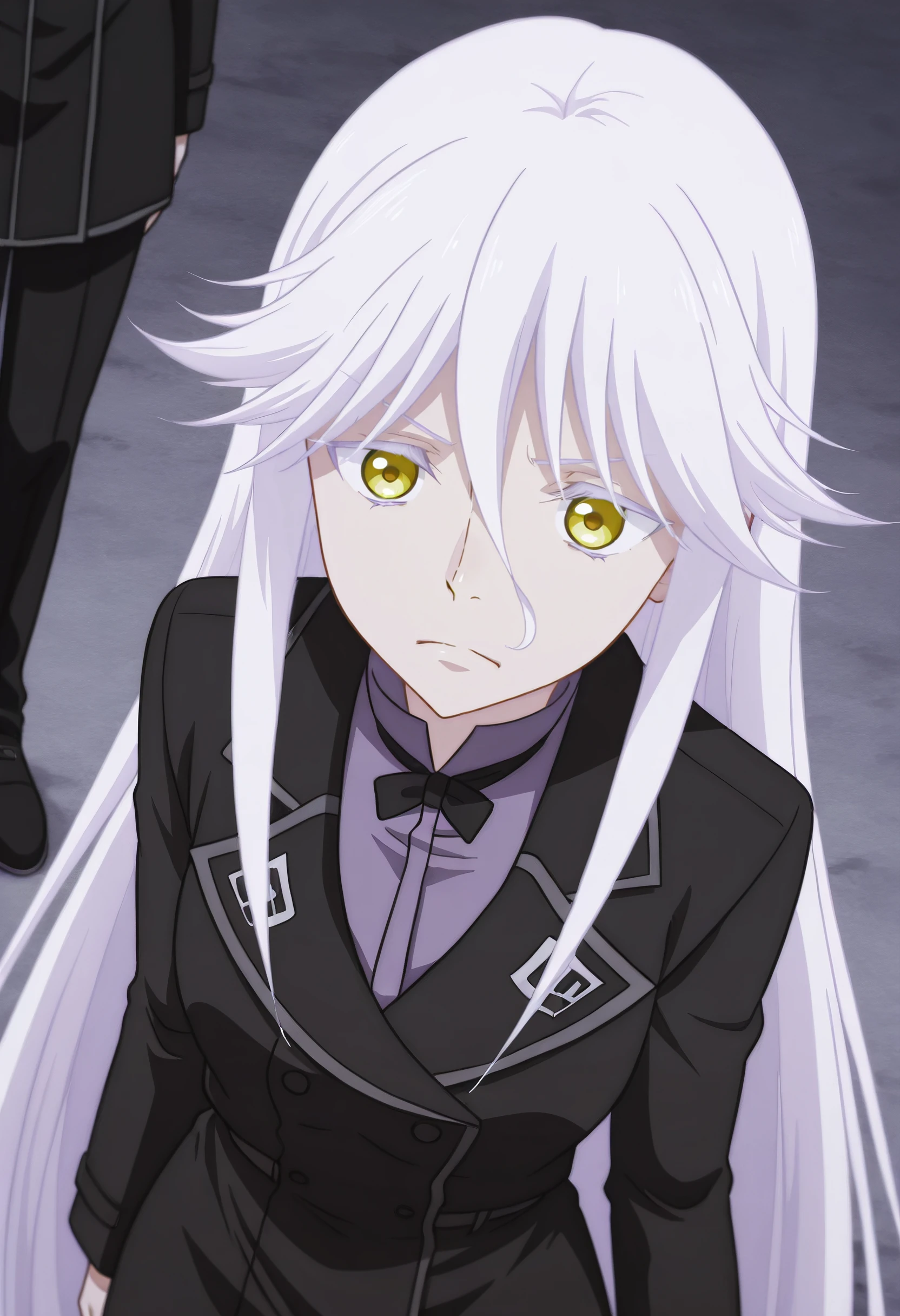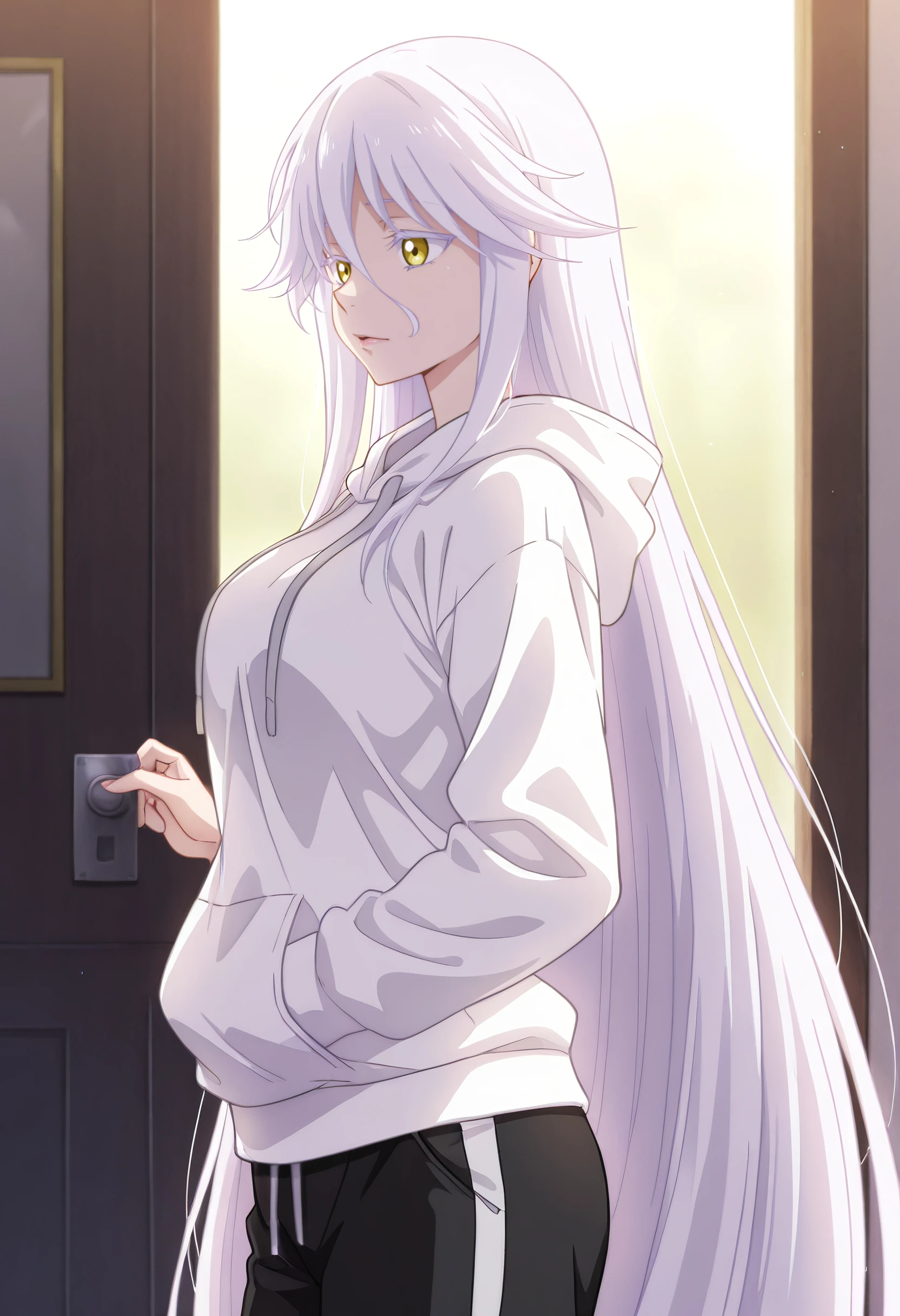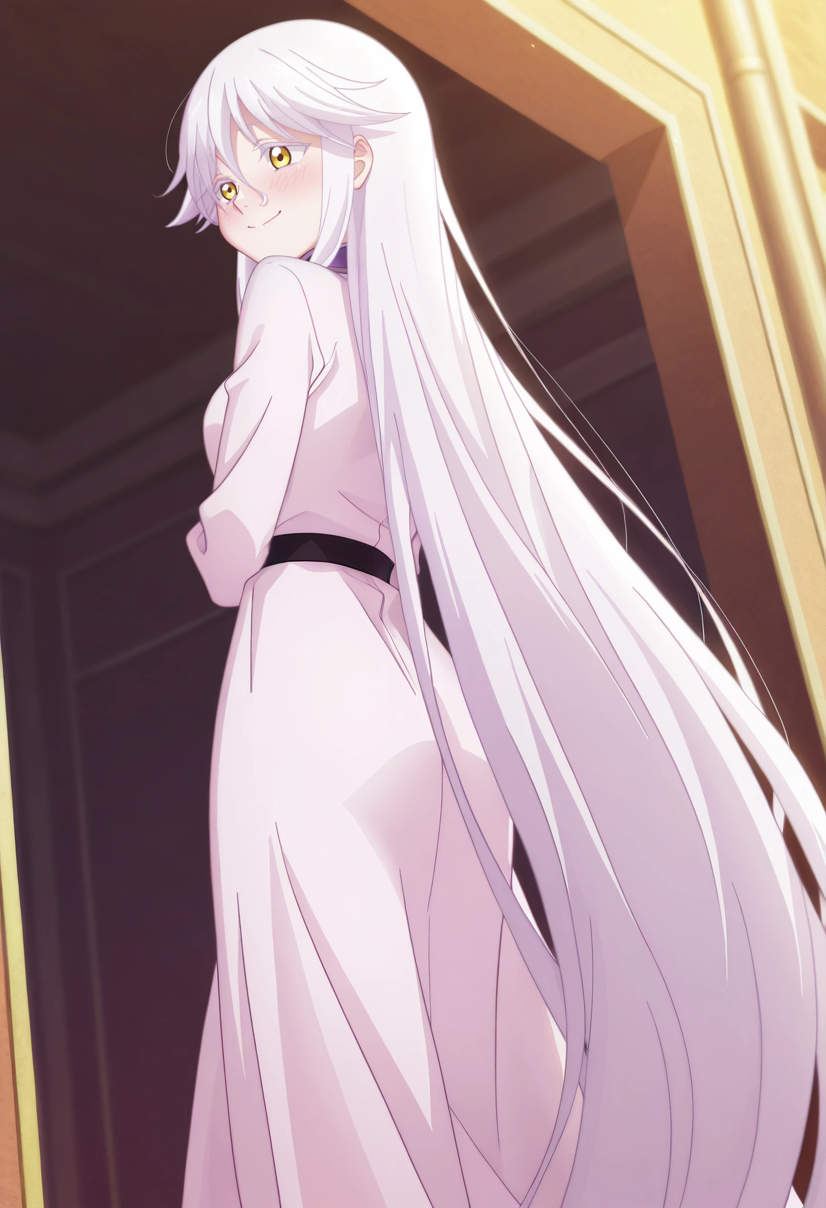HNMLiselotte, white hair, long hair, very long hair, hair between eyes, yellow eyes, hair flaps, colored eyelashes,