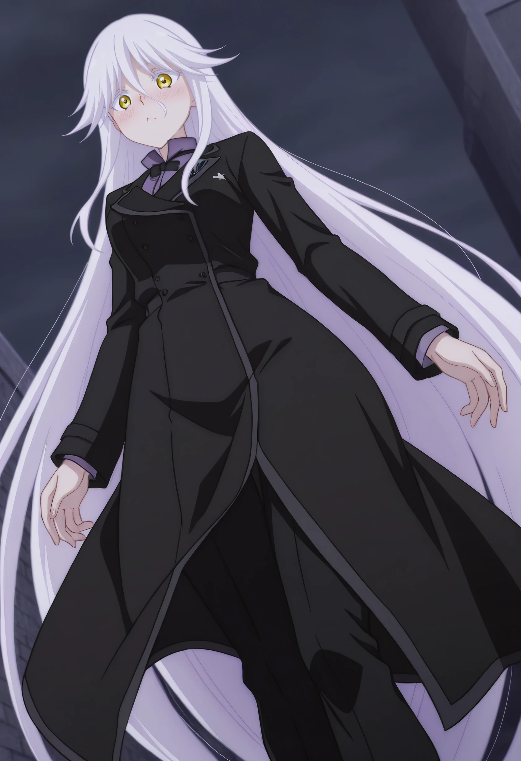 LiselotteOutfit, long sleeves, black jacket, jacket, coat, black coat, collared shirt, formal clothes, buttons, bow, sidelocks, trench coat, bowtie, black bow, straight hair, double-breasted, black bowtie, neck ribbon, black pants, military uniform, military, black footwear, pants,