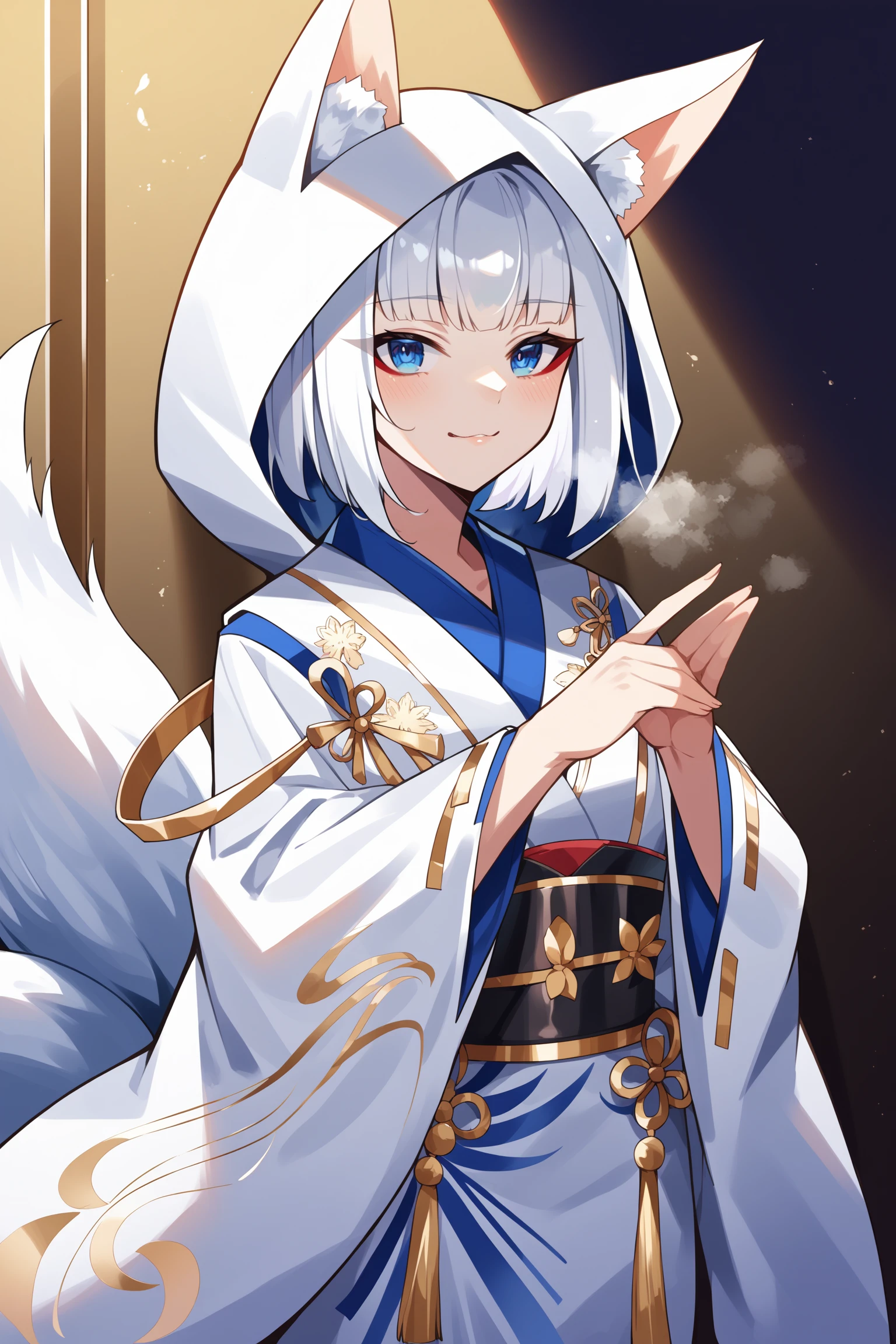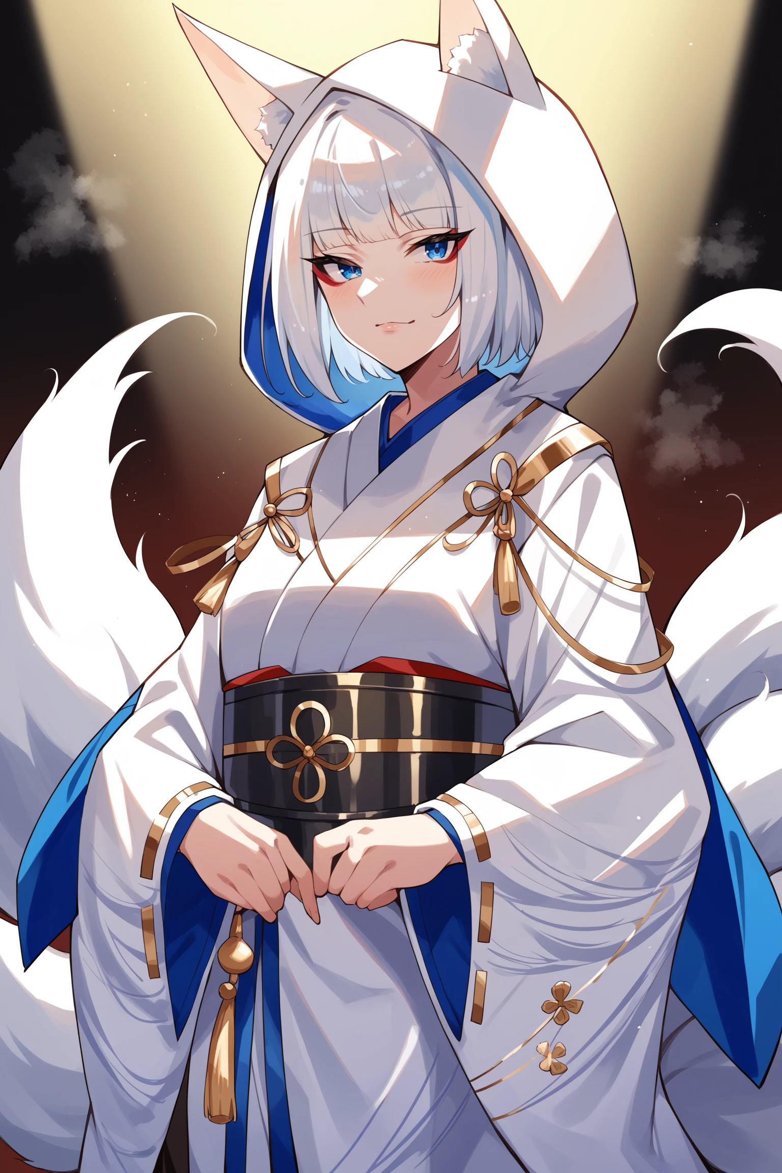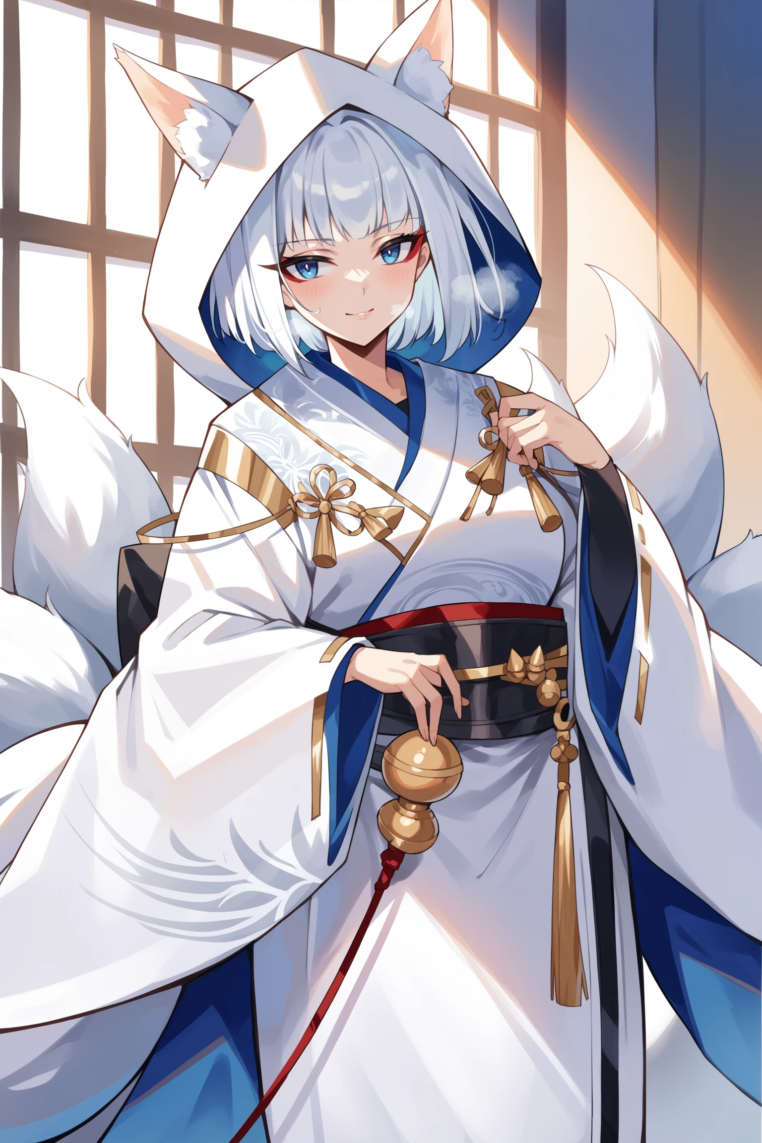 medium hair, blue eyes, red eyeshadow, multiple fox tails, gold knot, hood gold tassels, fox hood, wataboushi, gold trim, uchikake, wide sleeves