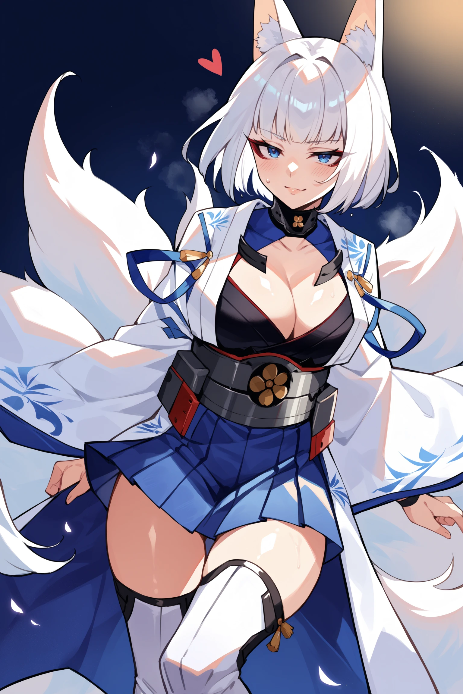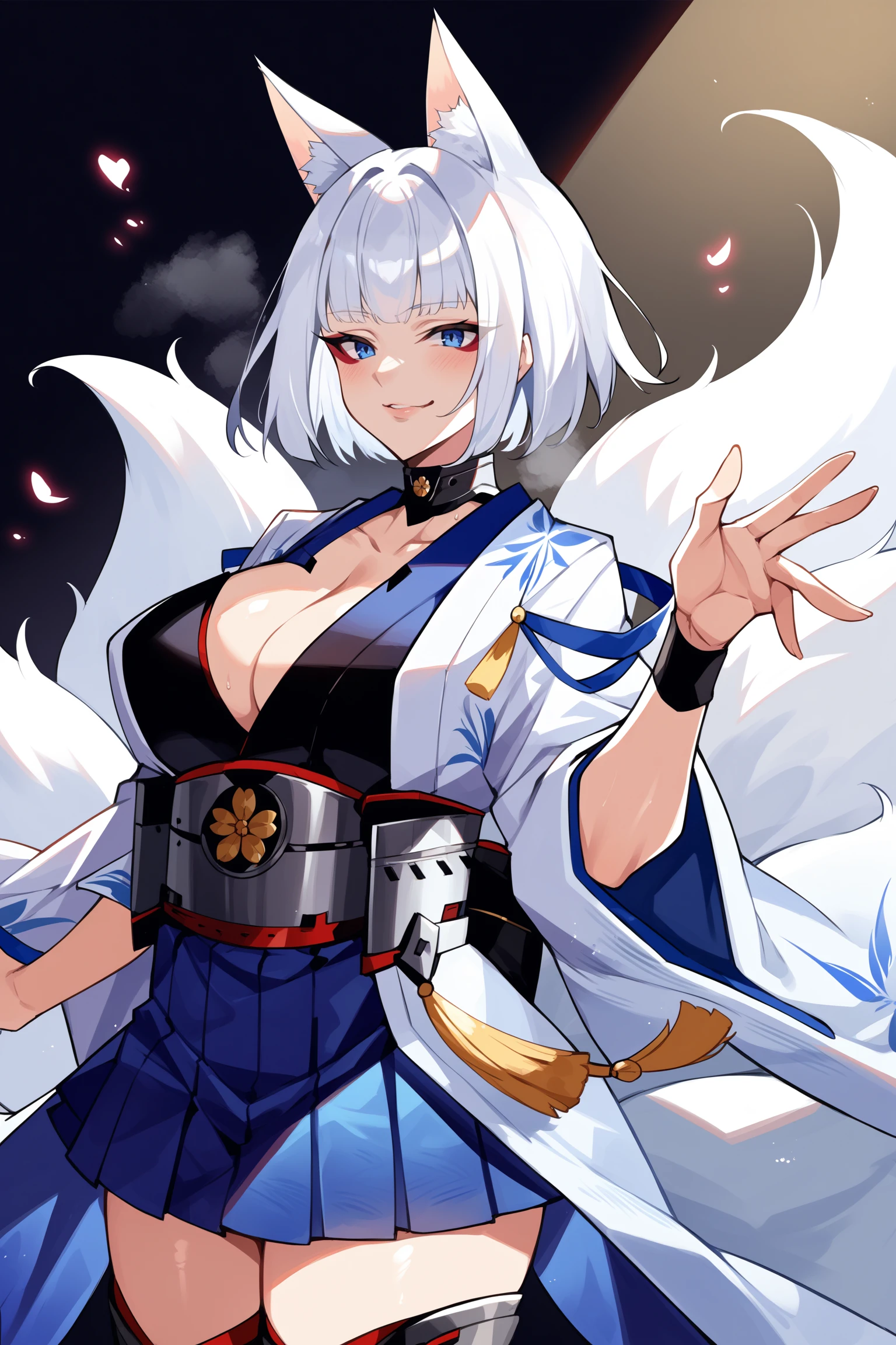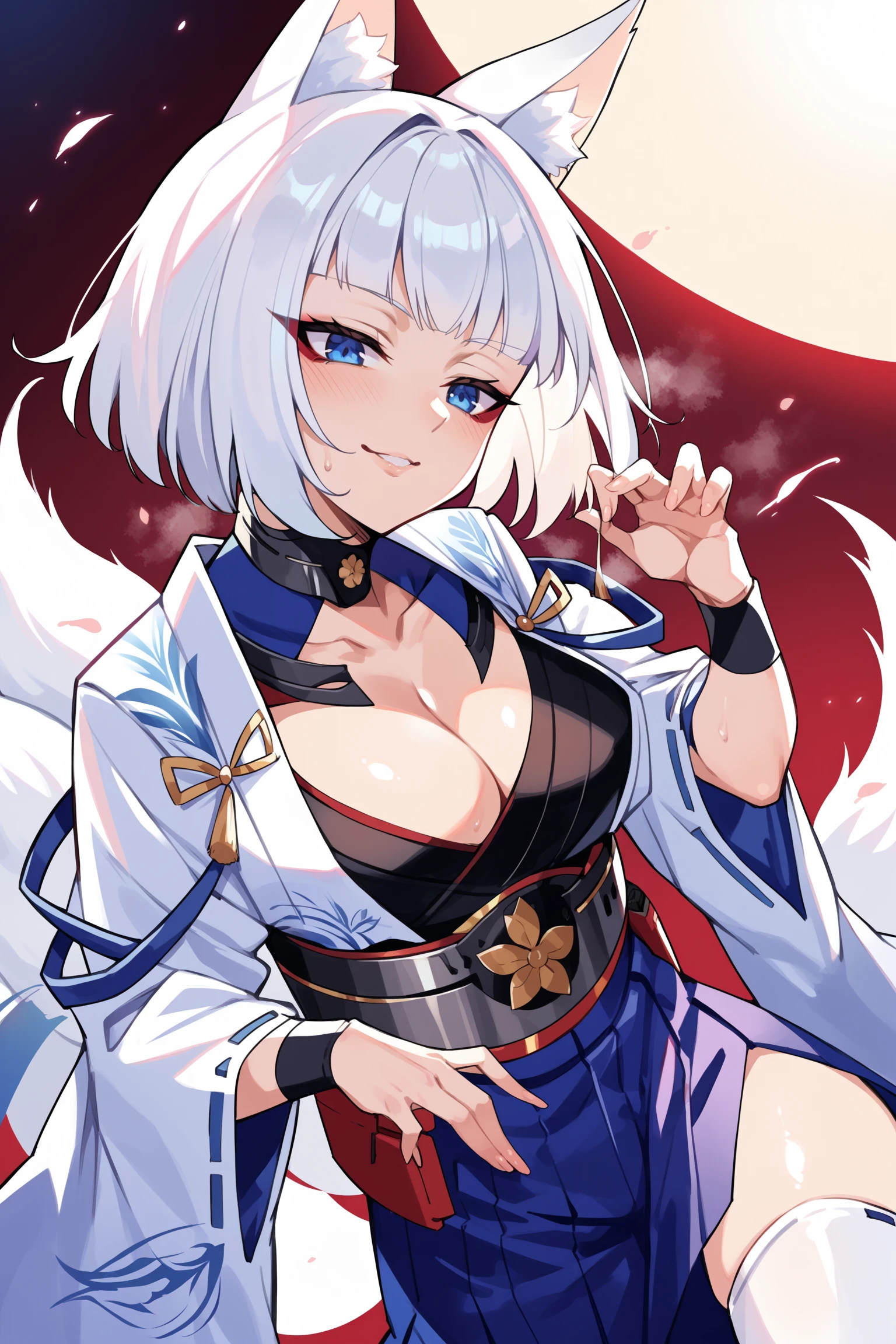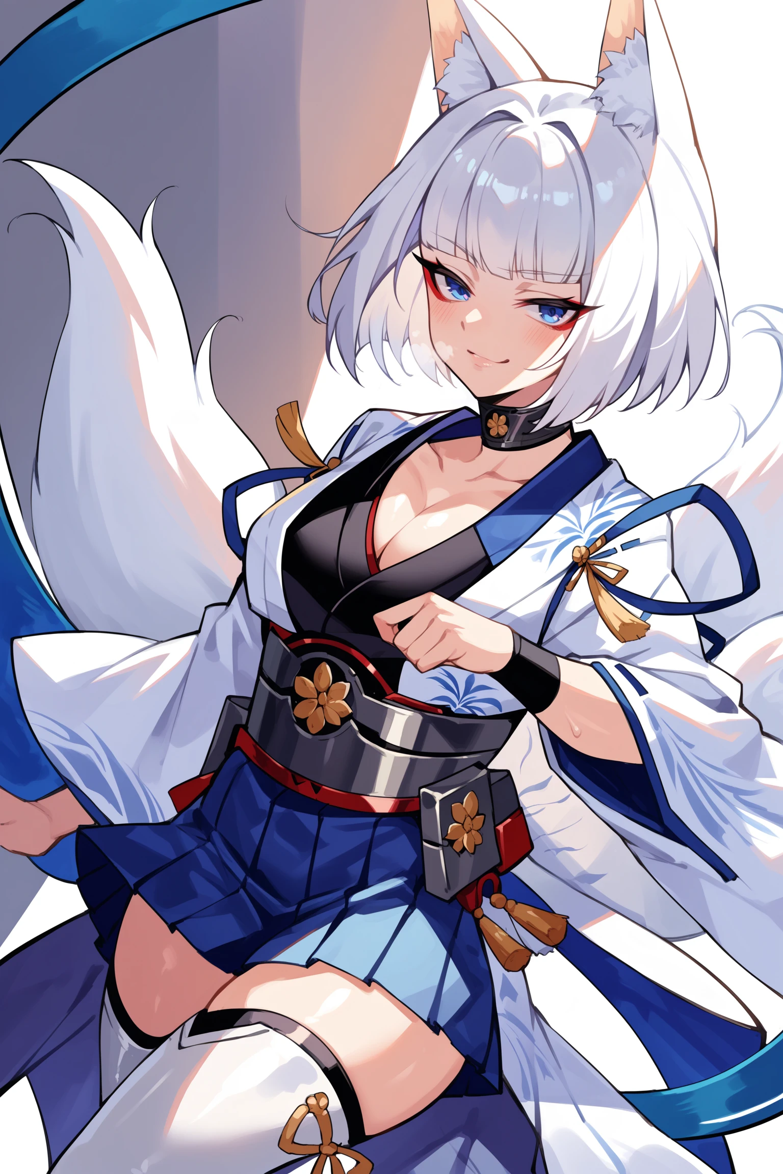 medium hair, blue eyes, red eyeshadow, fox ears, multiple fox tails, metal choker, blue bodystocking cutout, cleavage cutout, black kimono under clothes, white open hakama, gold tassels, blue string around shoulder, wide sleeves, black wristband, metal obi, blue hakama short skirt, white thigh boots
