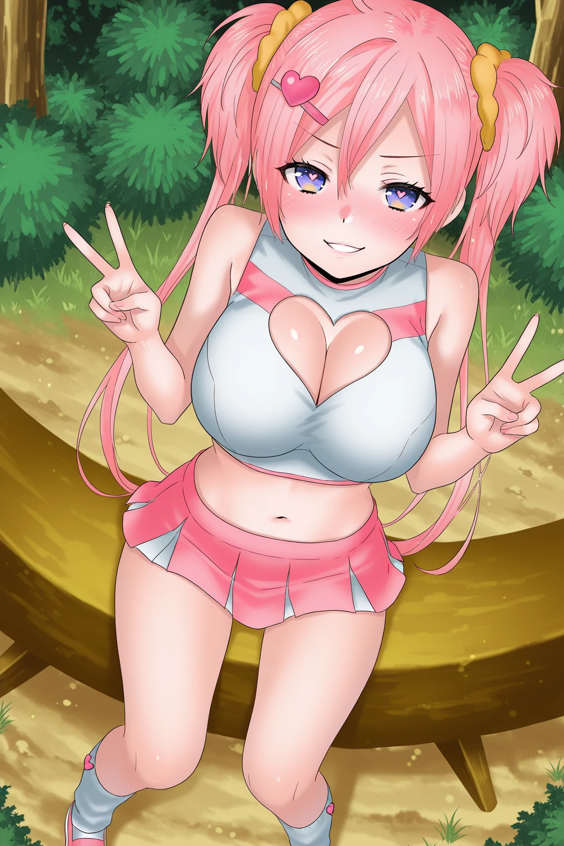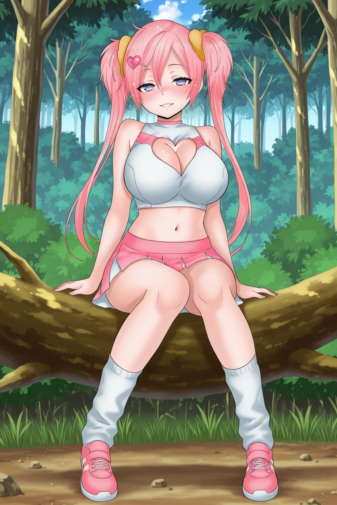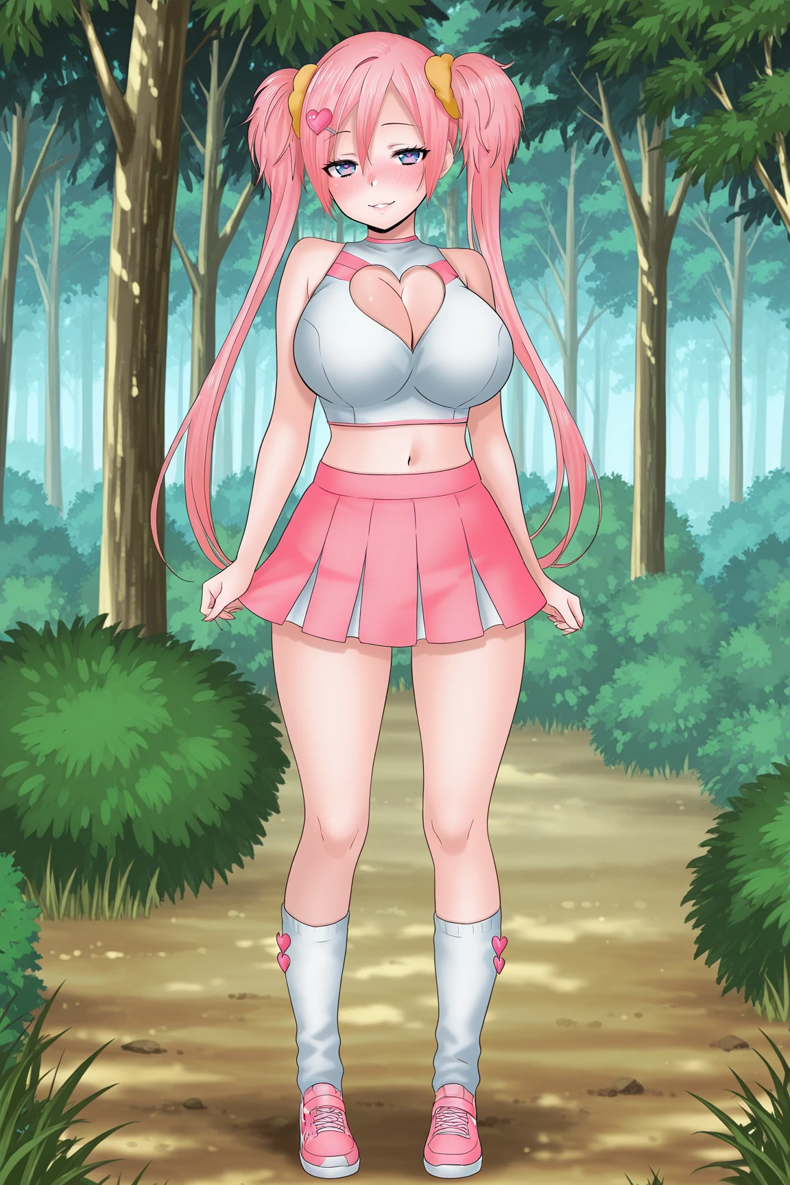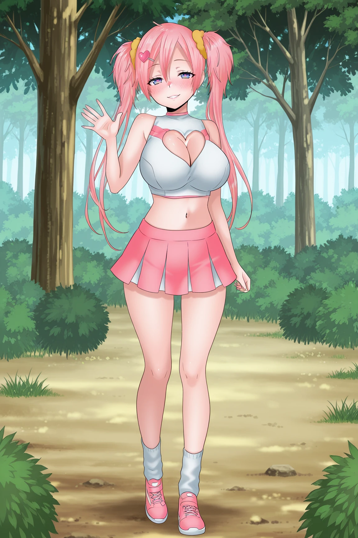 TessaTTILXL, purple eyes, blue eyes, multicolored eyes, pink hair, long twintails, hair between eyes, yellow scrunchie, heart hair ornament, large breasts, cleavage cutout, heart cutout, white midriff, sleeveless, pink skirt, short skirt, white socks, pink shoes