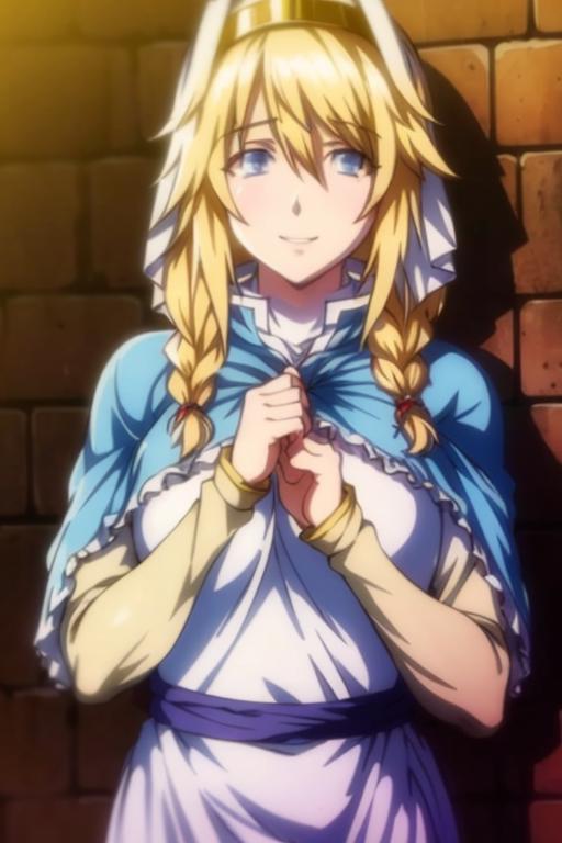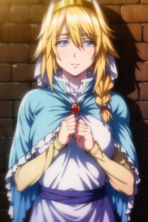 Golden hair, blue eyes,White robe, blue shawl,braid, Purple belt,wimple