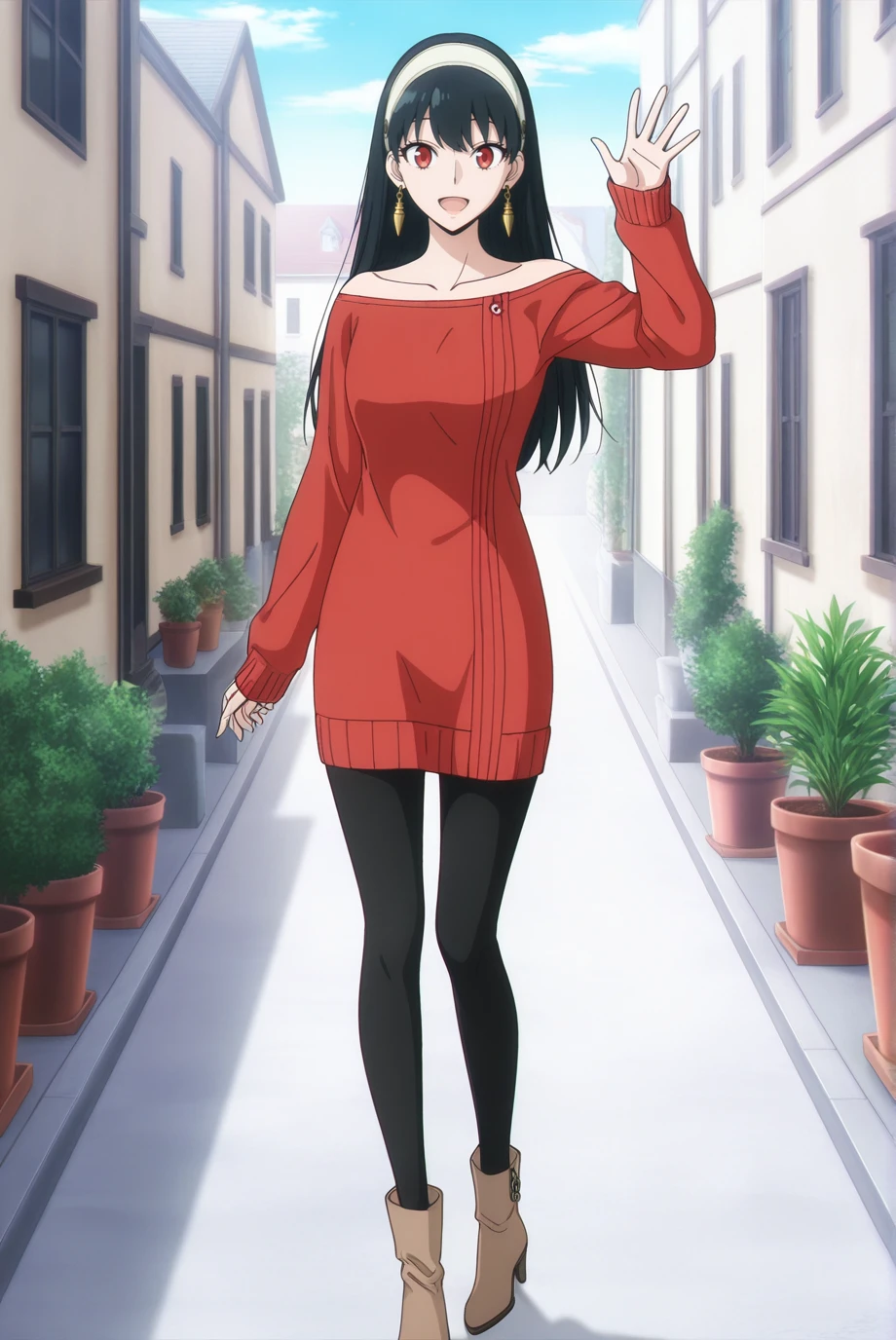 outfit_2, bare shoulders, collarbone, red sweater, sweater dress, long sleeves, sleeves past wrists, off-shoulder sweater, black leggings, high heel boots, ankle boots,