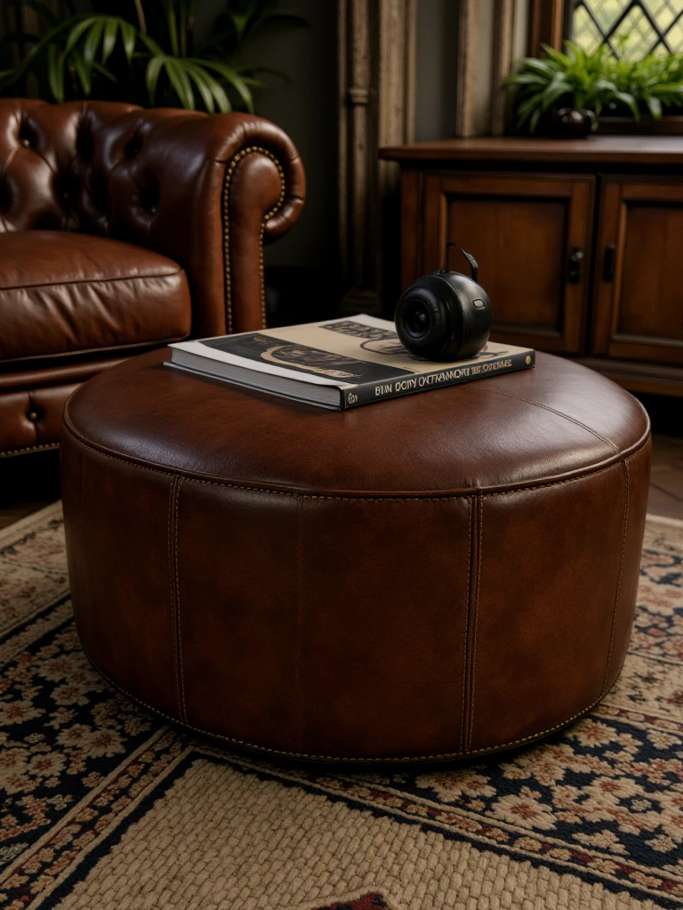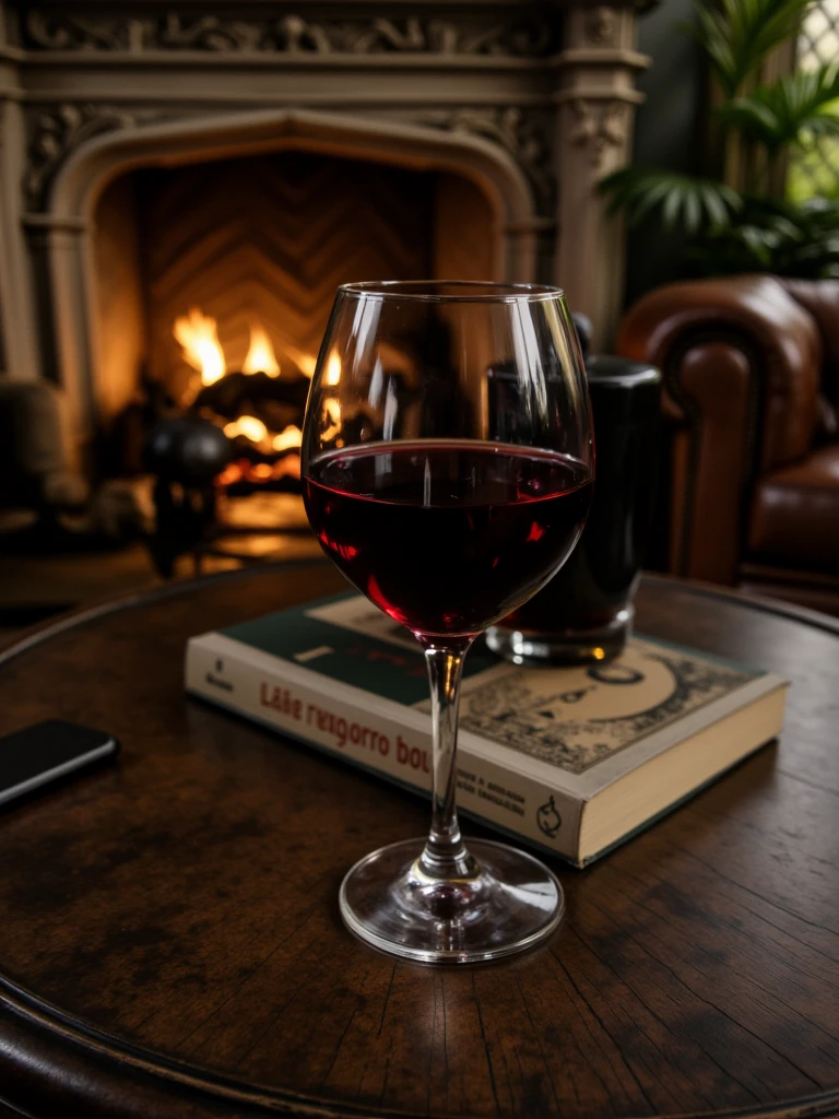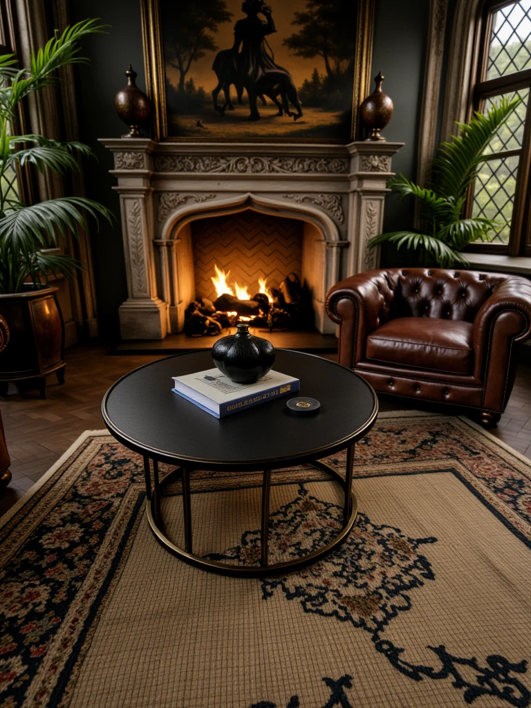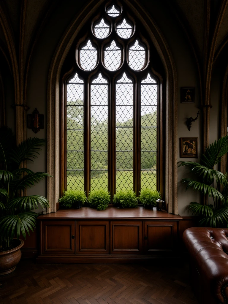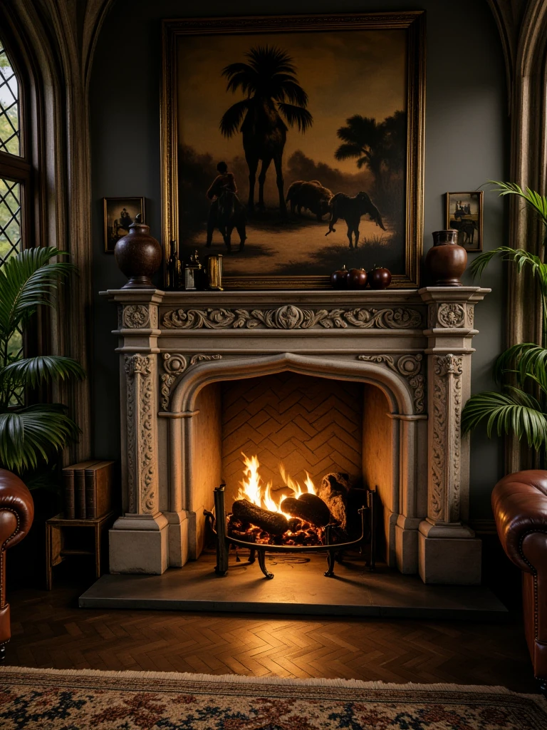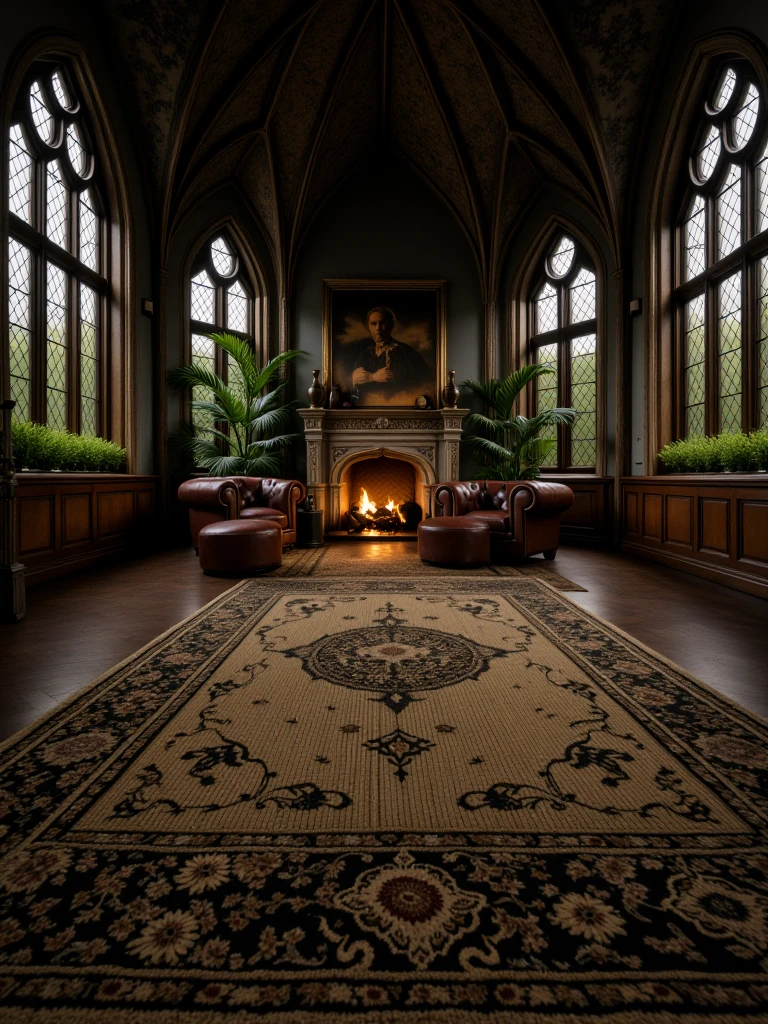 Gothic Victorian interior, spacious lounge with vaulted ribbed wooden ceiling and tall leaded glass windows casting soft diffused daylight across dark wood paneling and parquet flooring. A carved stone fireplace with warm burning fire forms the focal point, topped by a framed painting of a mounted knight. Brown leather Chesterfield armchairs and ottoman sit on an ornate patterned rug around a round black metal coffee table holding a book, over-ear headphones, and a glass of red wine. Lush potted plants cluster near windows and fireplace, adding organic contrast. A small side table with glassware stands beside seating. Rich textures of aged wood, leather, stone, and textile create a cinematic, cozy yet grand historic atmosphere with balanced warm firelight and cool window illumination.