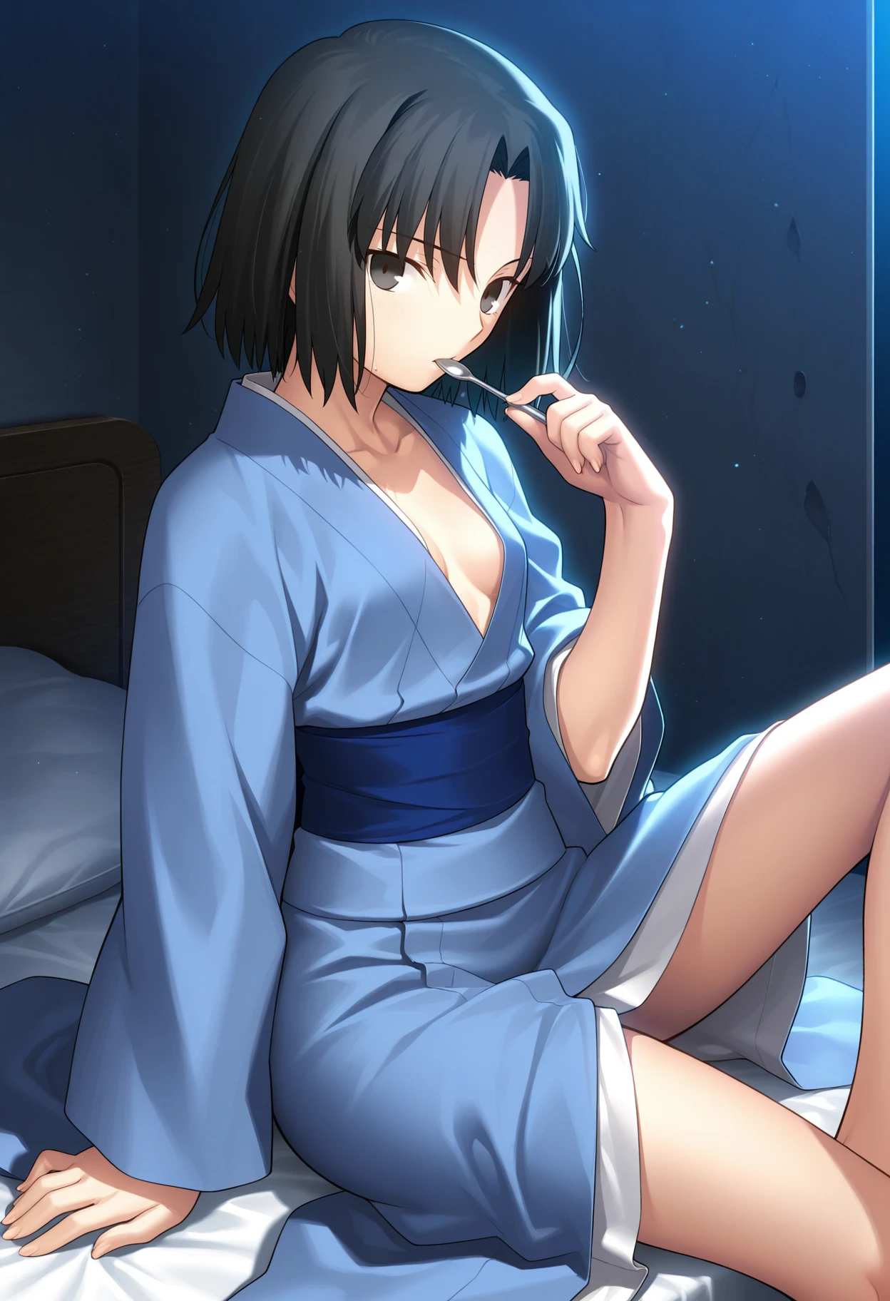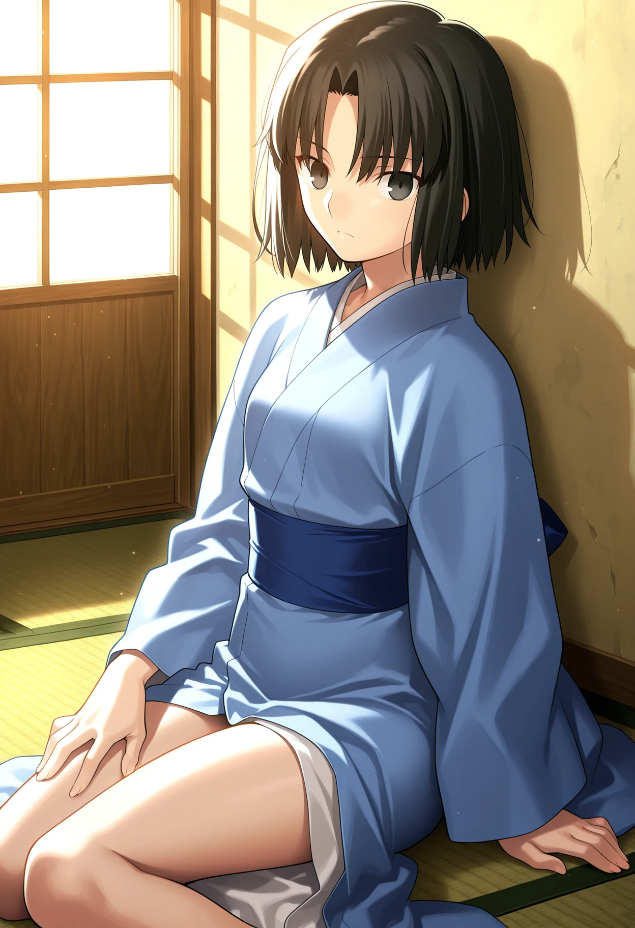 Base: r_shiki, 1girl, retro artstyle, solo, short hair, parted bangs, black hair, black eyes, shiki blue kimono, japanese clothes, sash, long sleeves, small breasts,