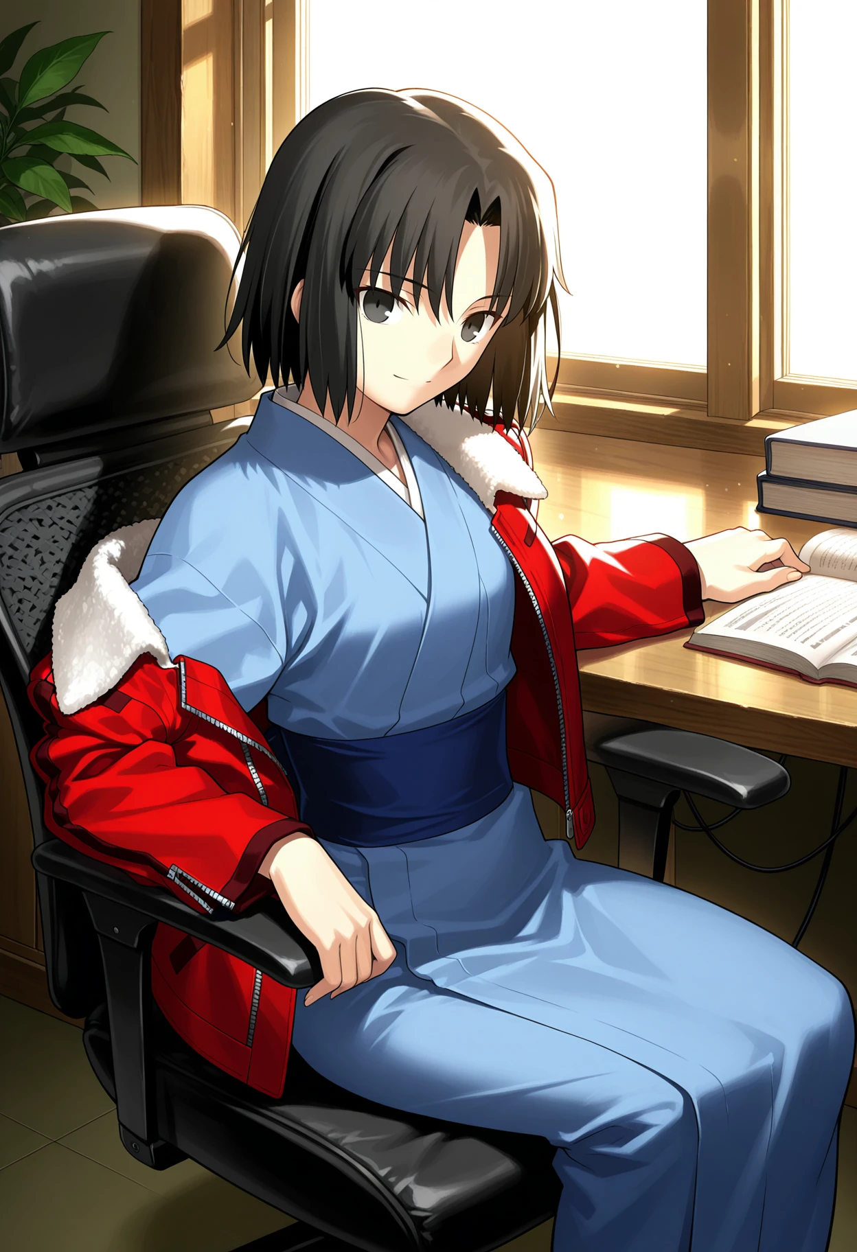 red jacket: r_shiki, 1girl, retro artstyle, solo, short hair, parted bangs, black hair, black eyes, red fur-trimmed jacket, shiki blue kimono, japanese clothes, sash, long sleeves, small breasts