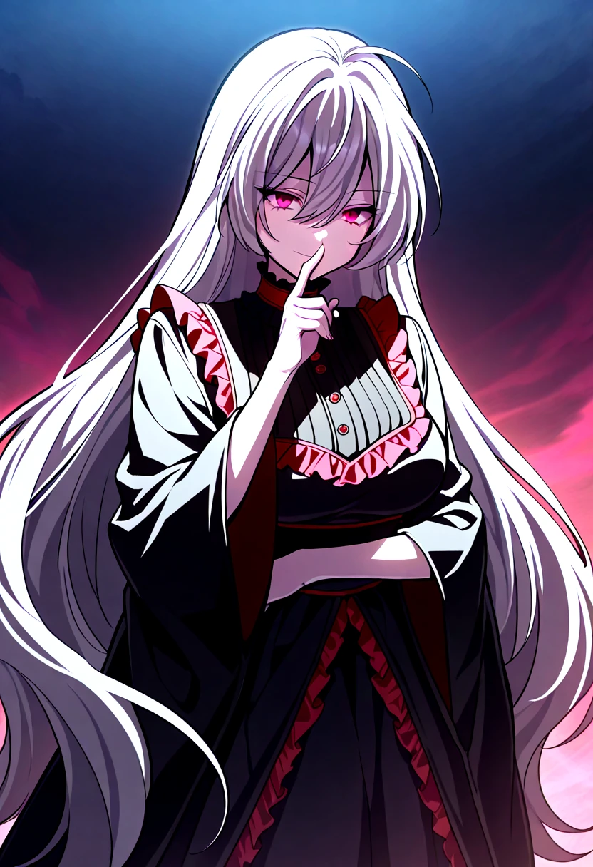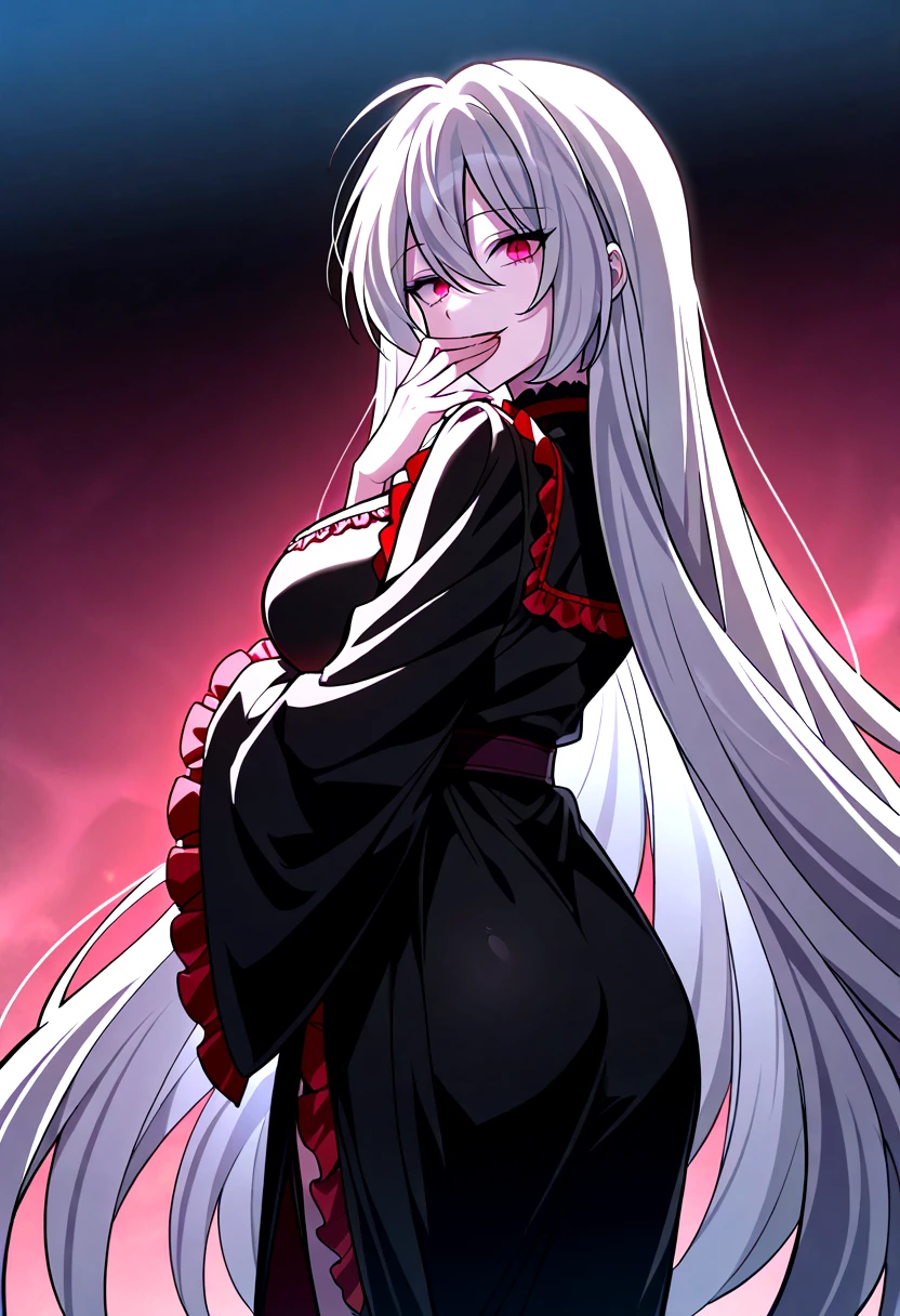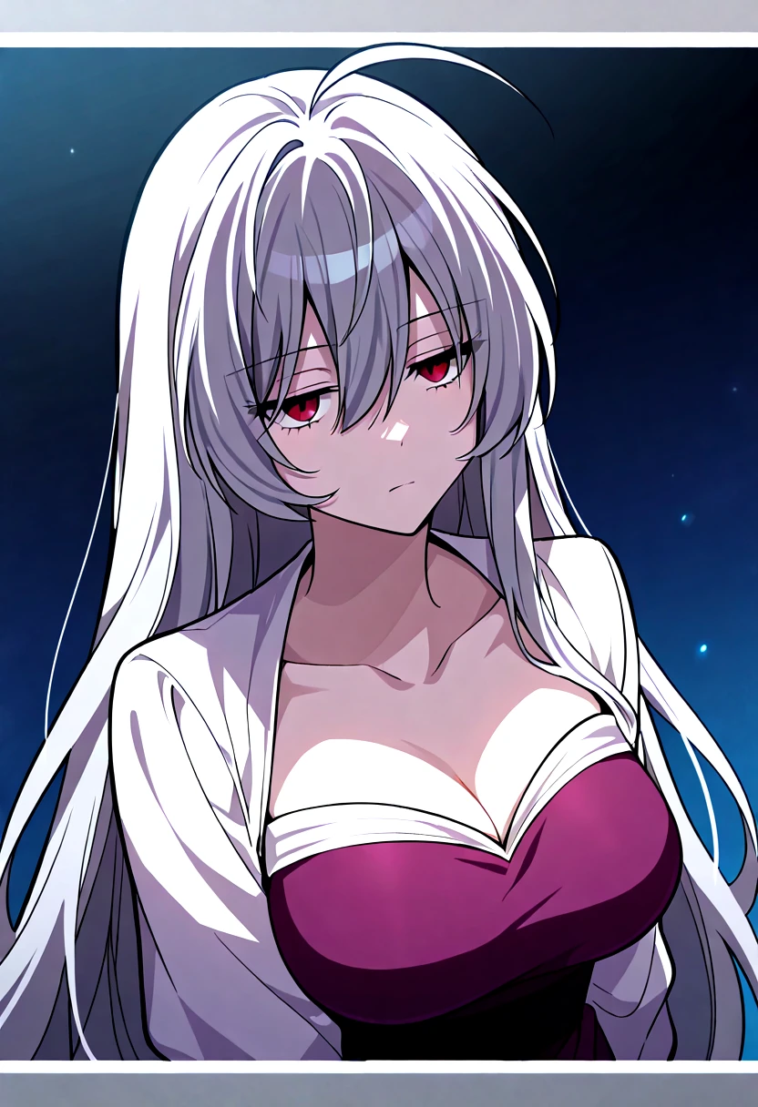 Yutia,large breasts ,grey hair ,very long hair,red eyes, ,hair between eyes ,long hair,white hair,ahoge,white skin