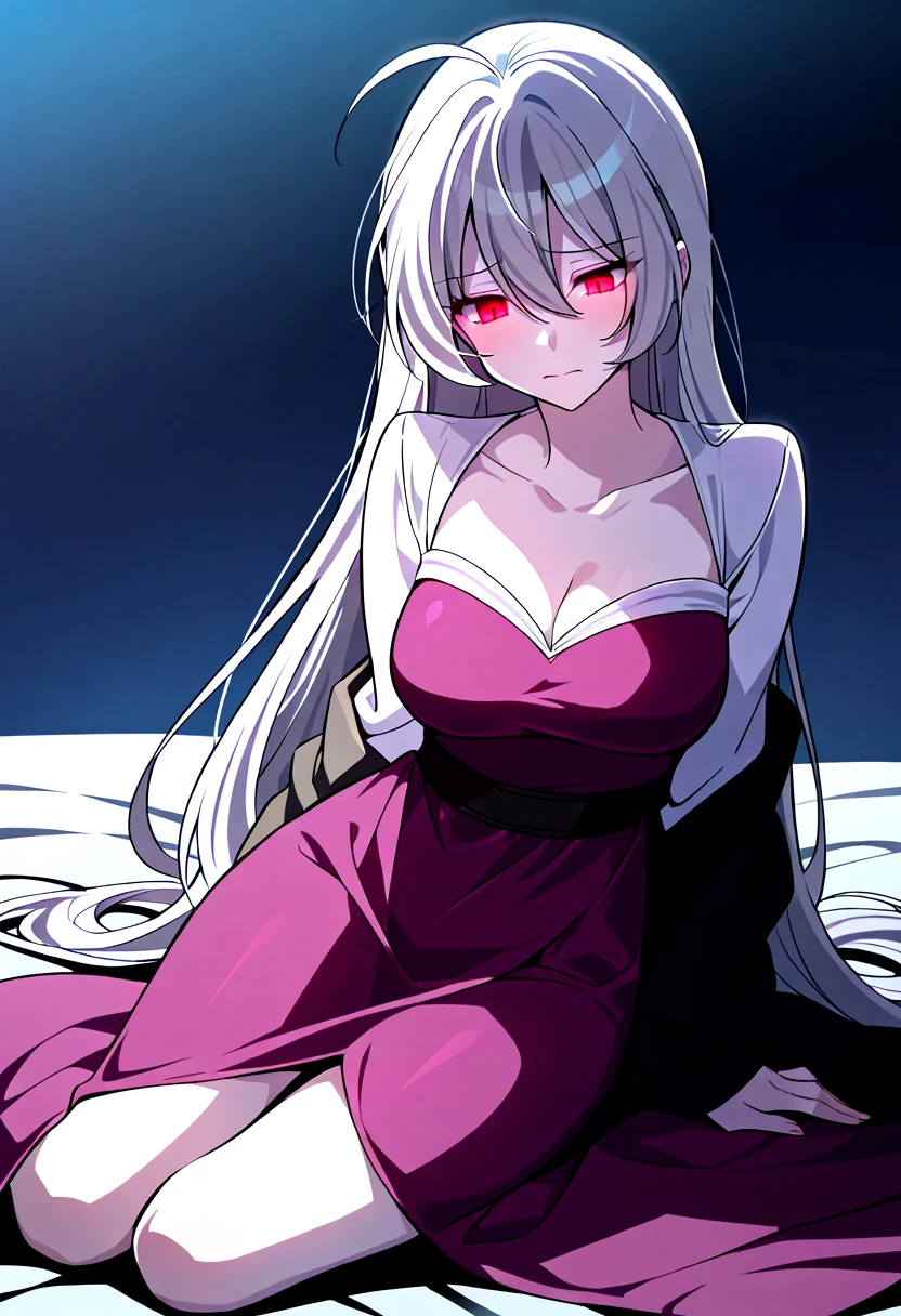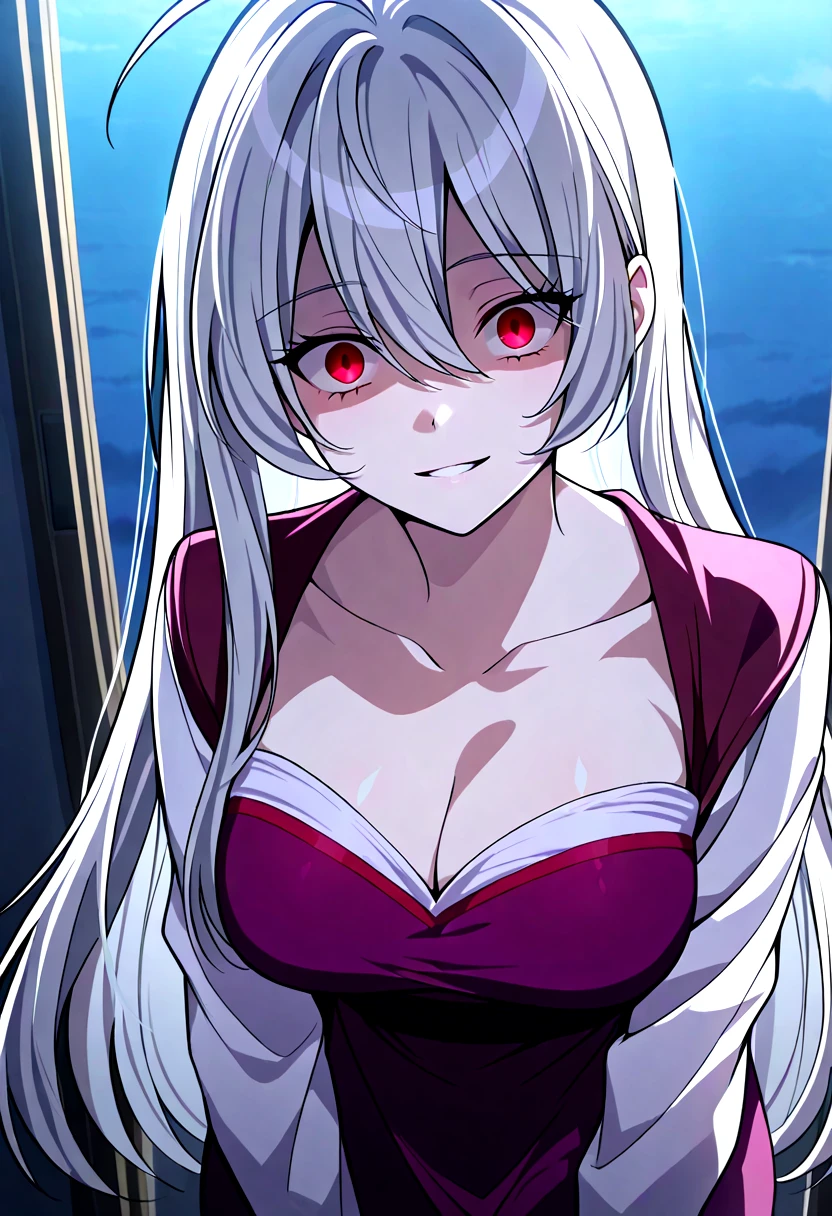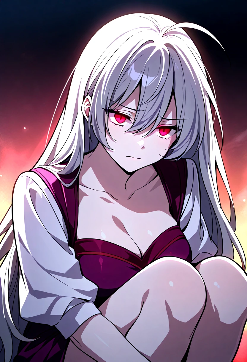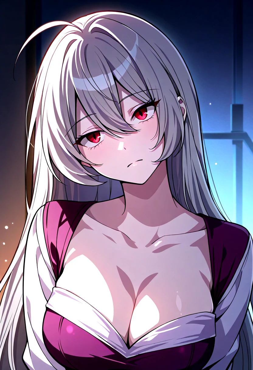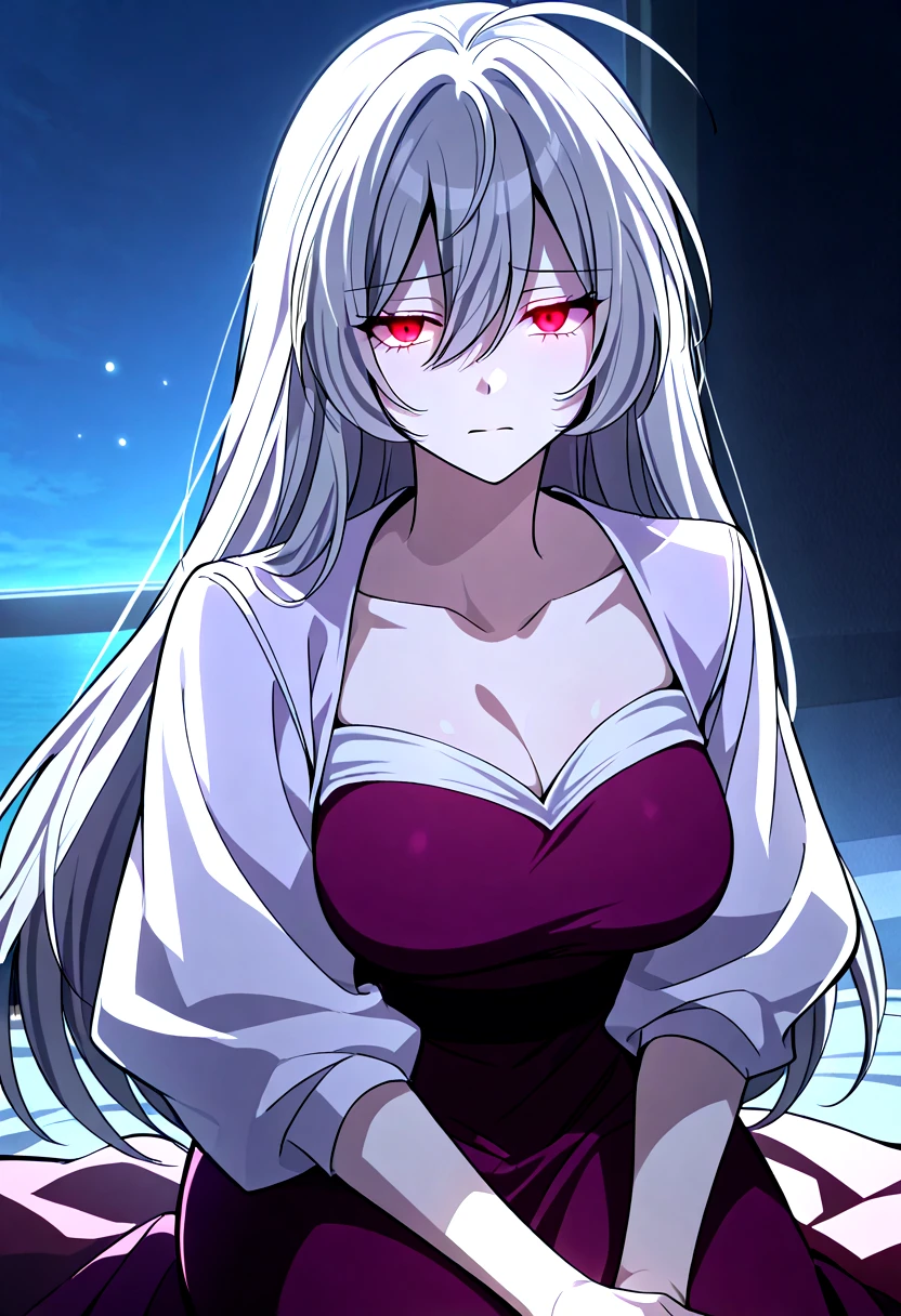 Yutia,white shirt,white skin,ahoge,grey hair,shirt,collarbone,purple dress,hair between eyes,long hair,red eyes,white hair