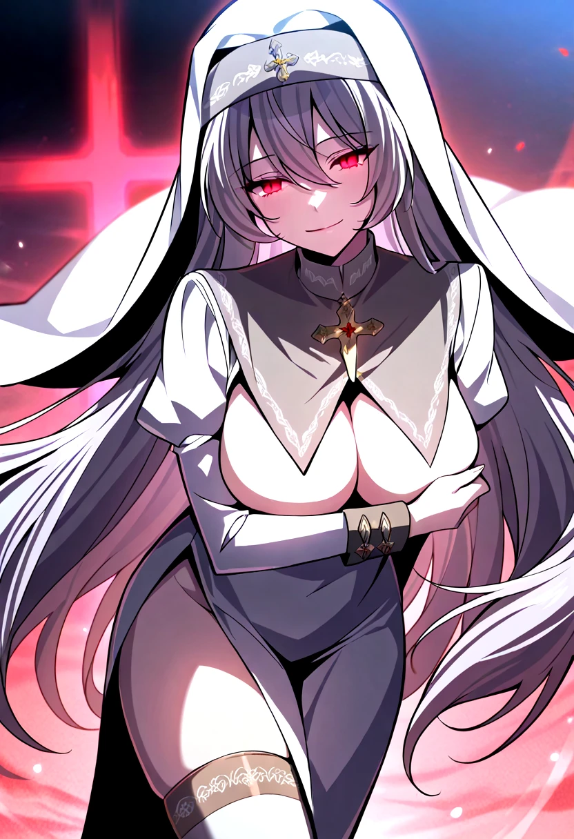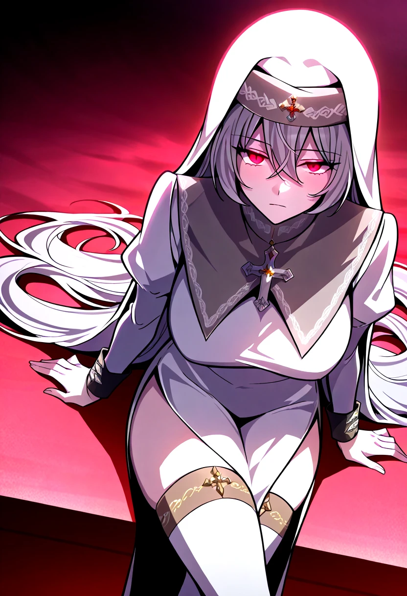 Yutia,large breasts,grey hair,very long hair,red eyes,hair between eyes,long hair,white hair,white skin,jewelry,juliet sleeves,necklace,side slit,thighhighs,cross,dress,long sleeves,puffy sleeves,habit,nun,cross ornament,white thighhighs