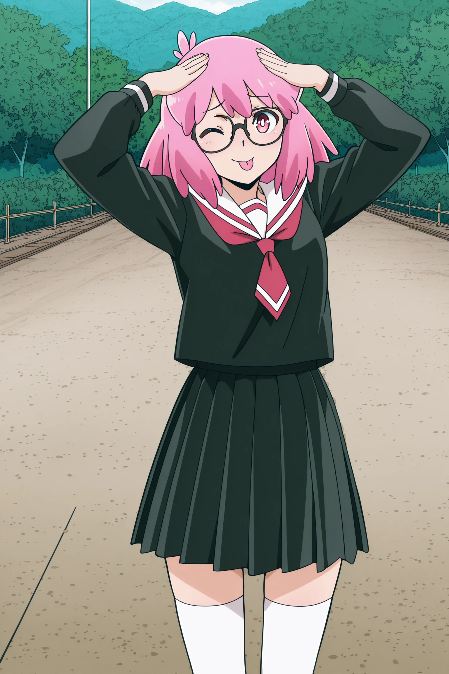 Kazuho Haneyama (character), 1girl, solo, pink hair, pink eyes, glasses | skirt, black serafuku, school uniform, white socks, thighhigh socks