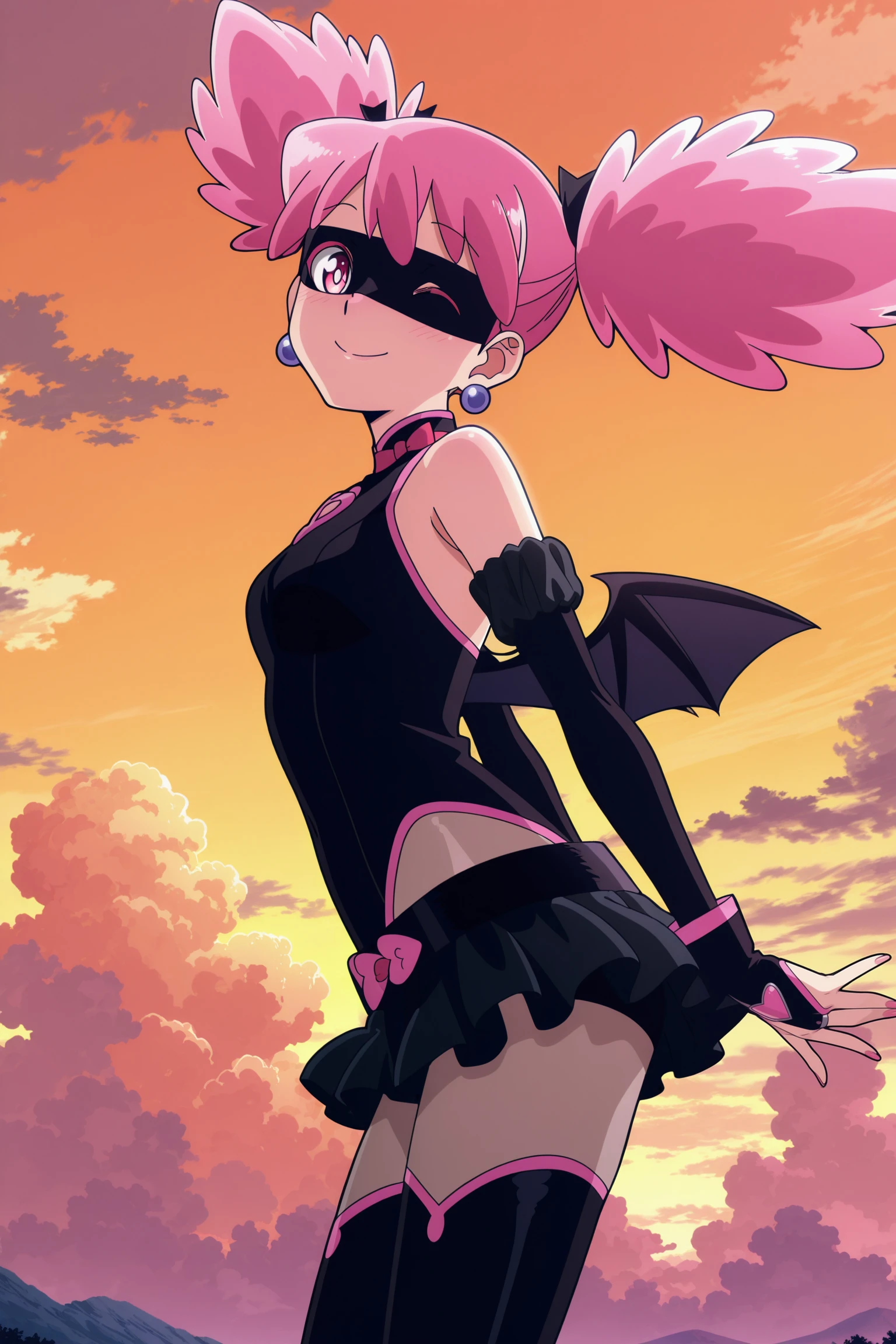 Pop Step's main outfit (appearance), wings, mask, thighhighs, twintails, bridal gauntlets, purple earrings