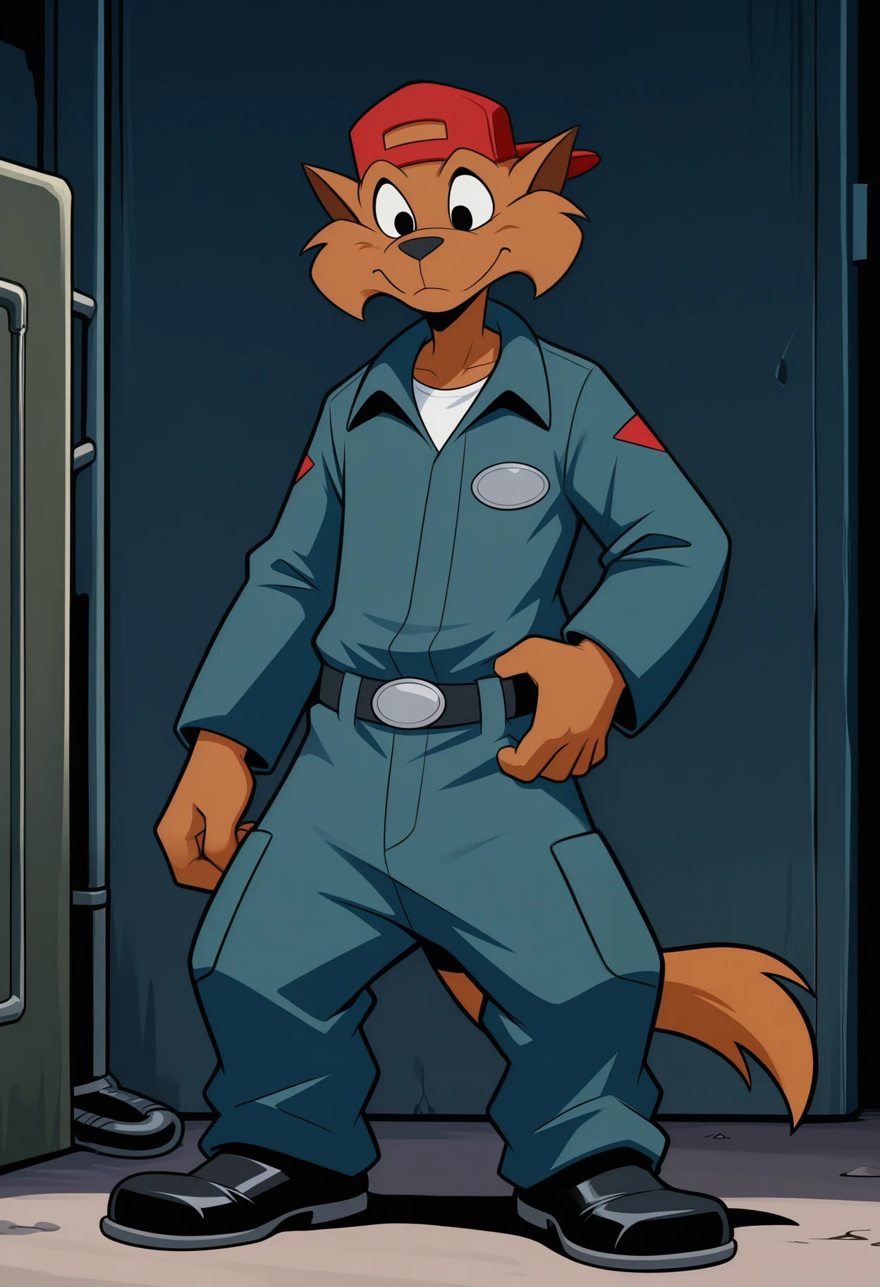 mechanic outfit: mechanic suit, white shirt, mechanic belt, shoes, baseball cap, backwards hat,