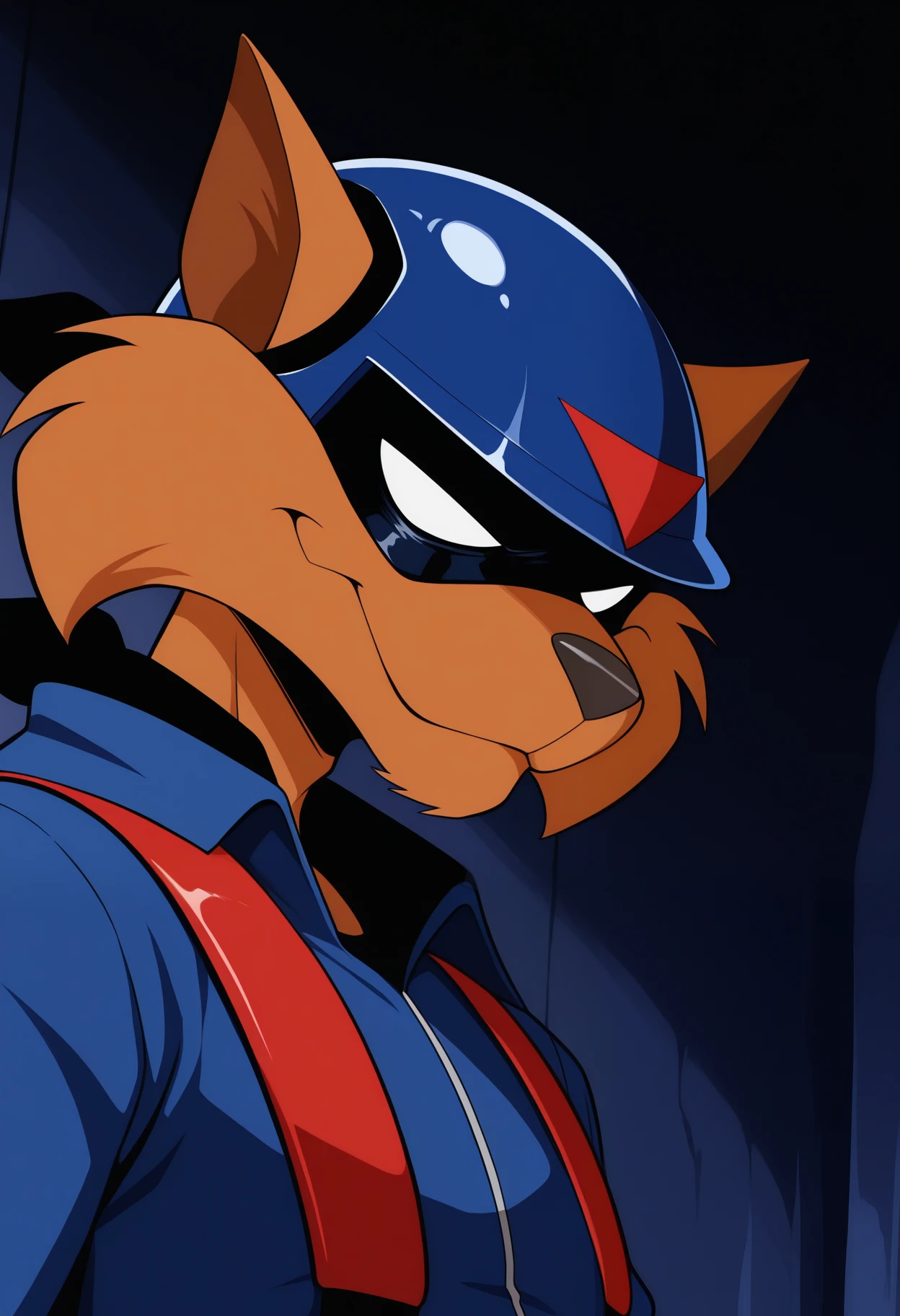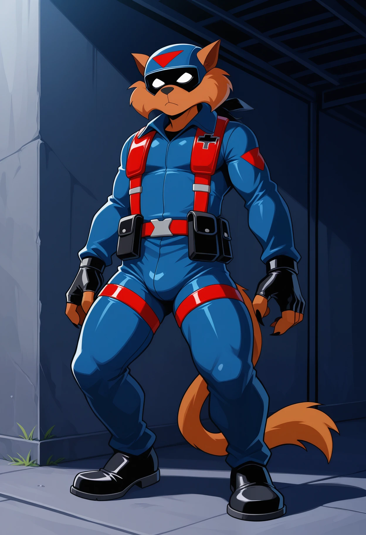 main outfit: black bandana mask, helmet, blue bodysuit, red harness, red leg straps, black fingerless gloves, black pouch,