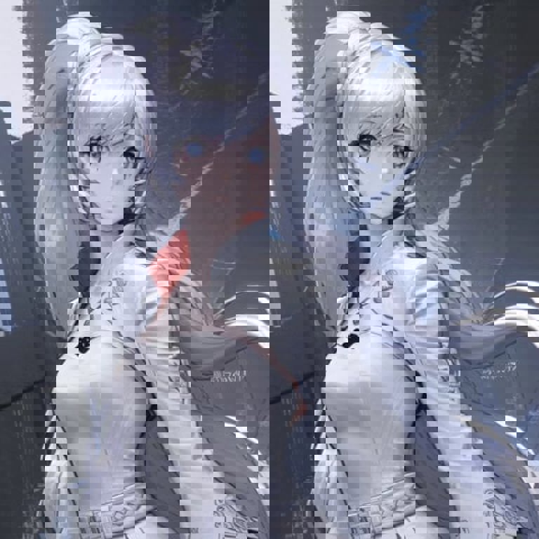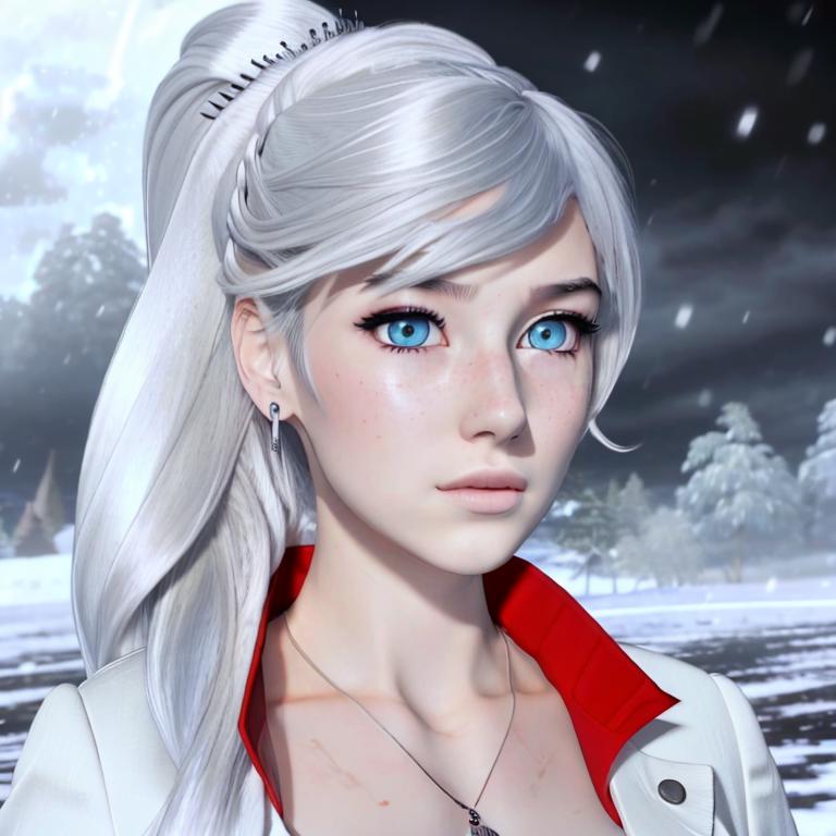 As for Trigger words Weiss Schnee of course. Her original outfit should be baked in but "Cropped Jacket" can help if it doesn't also "Jewlery" if she's missing that. "Blue Dress" Will get her more recent outfit but also needs "hair ornament" if you want the update hair doo-dad.