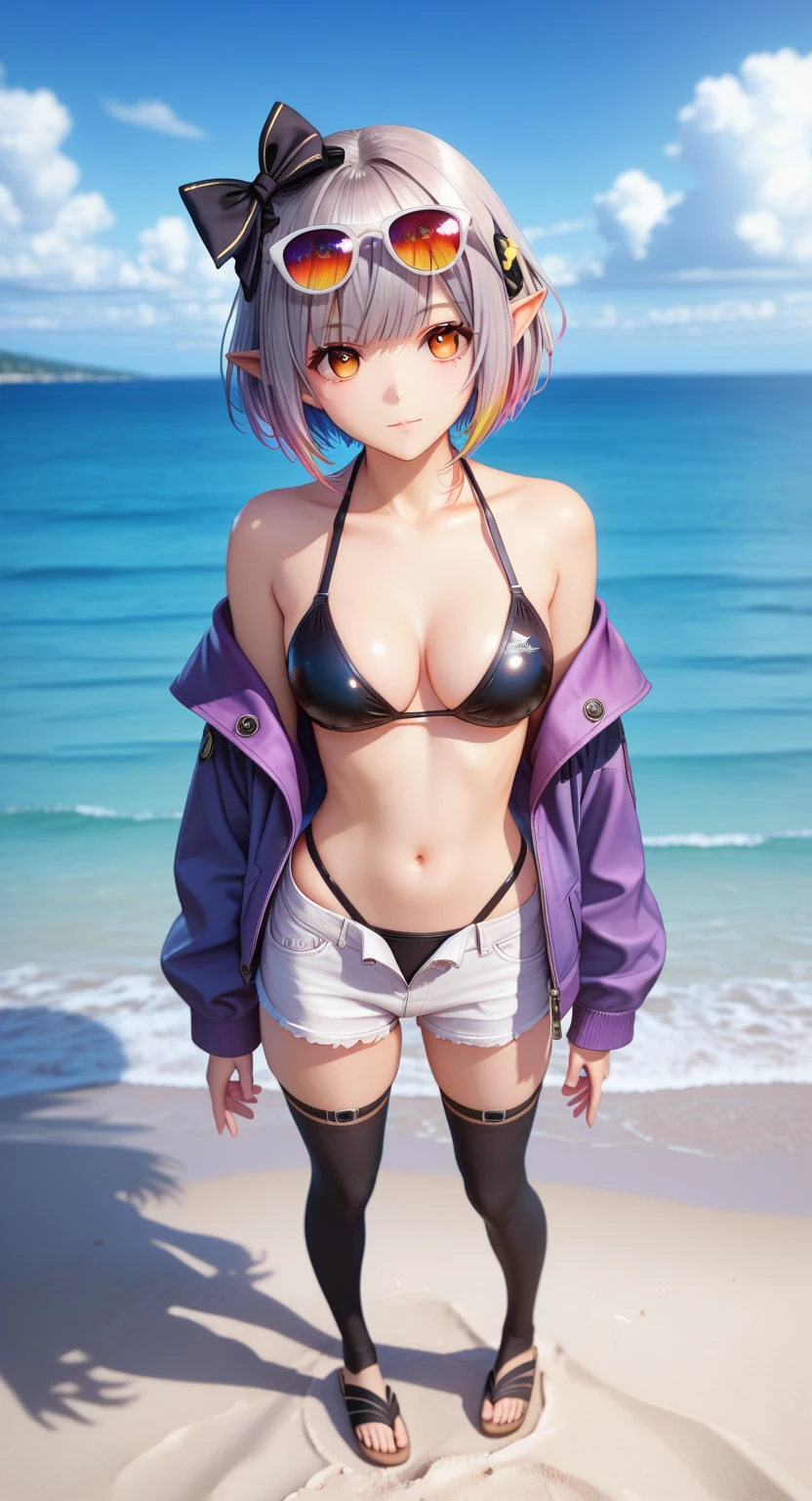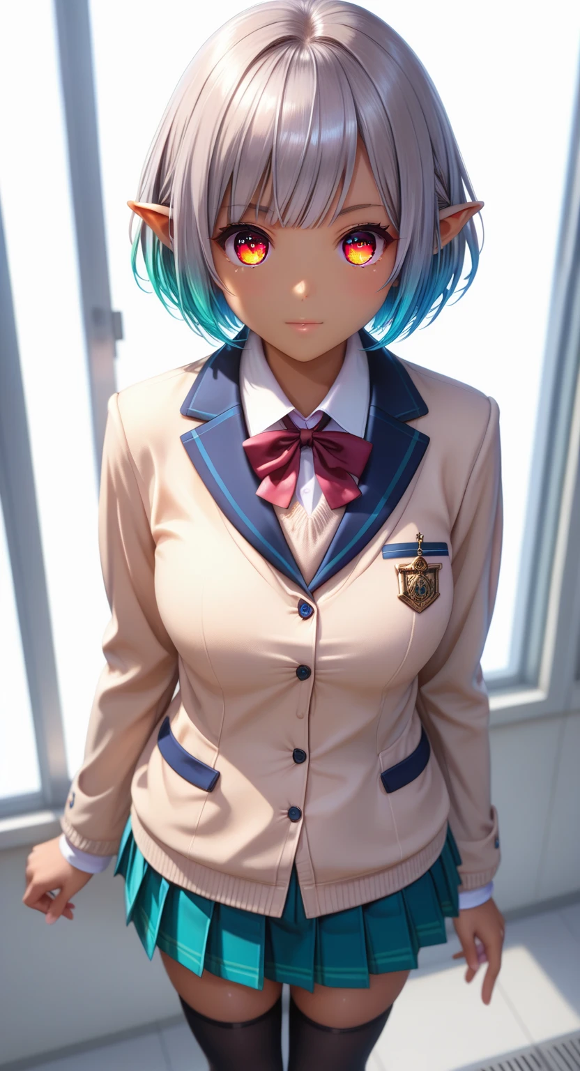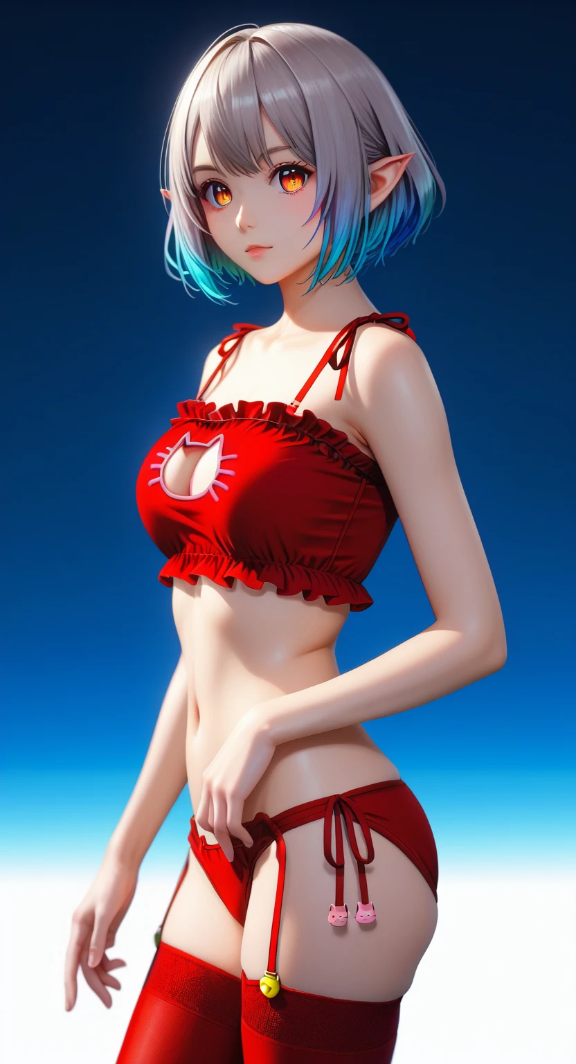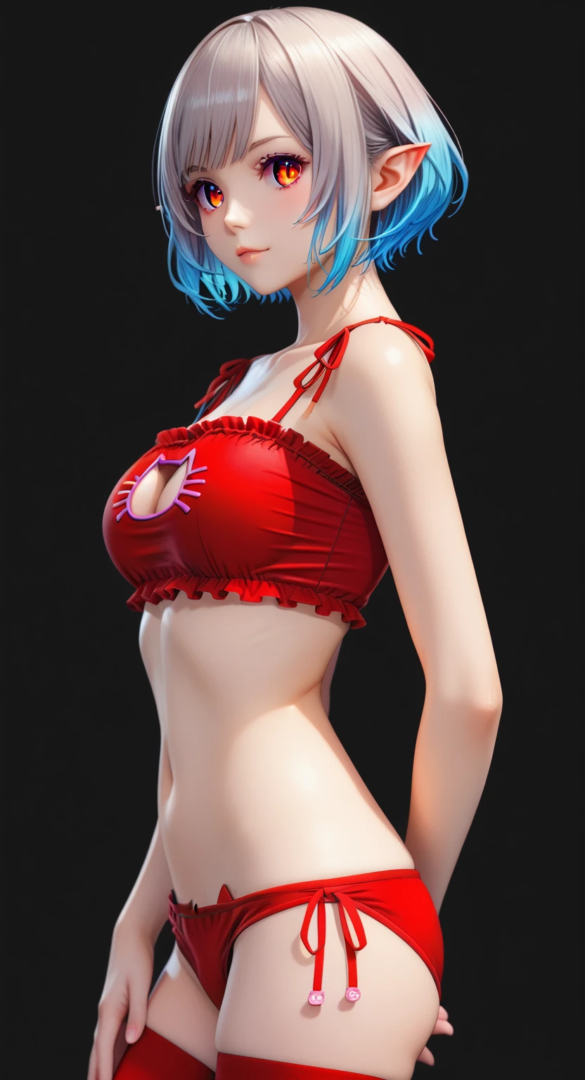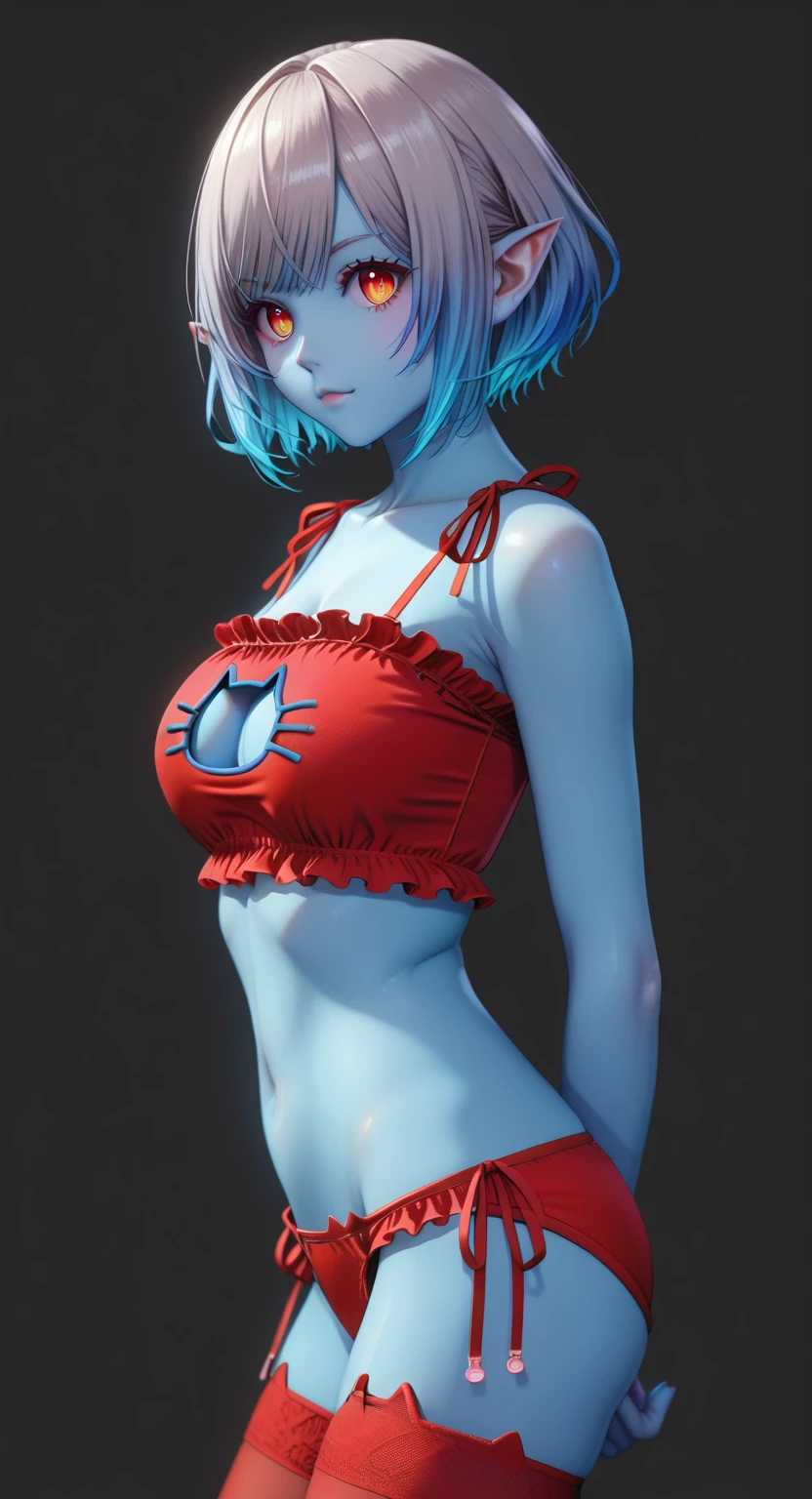 score_9, score_8_up, score_7_up, masterpiece, source_anime, 1gir, solo, (MayaAnnaAnon), (detailed eyes), (high definition eyes), (high gradient eyes), (eyesHD), (best quality:1.4), short hair, bangs, big breasts, thighhighs, gloves, navel, animal ears, cleavage, bare shoulders, grey hair, pointy ears, black gloves, elbow gloves, black thighhighs, bowtie, rabbit ears, black leotard, orange eyes, wrist cuffs, clothing cutout, black bow, colored skin, blue skin, navel cutout, standing, side view, (upper body:1.2), focus face
