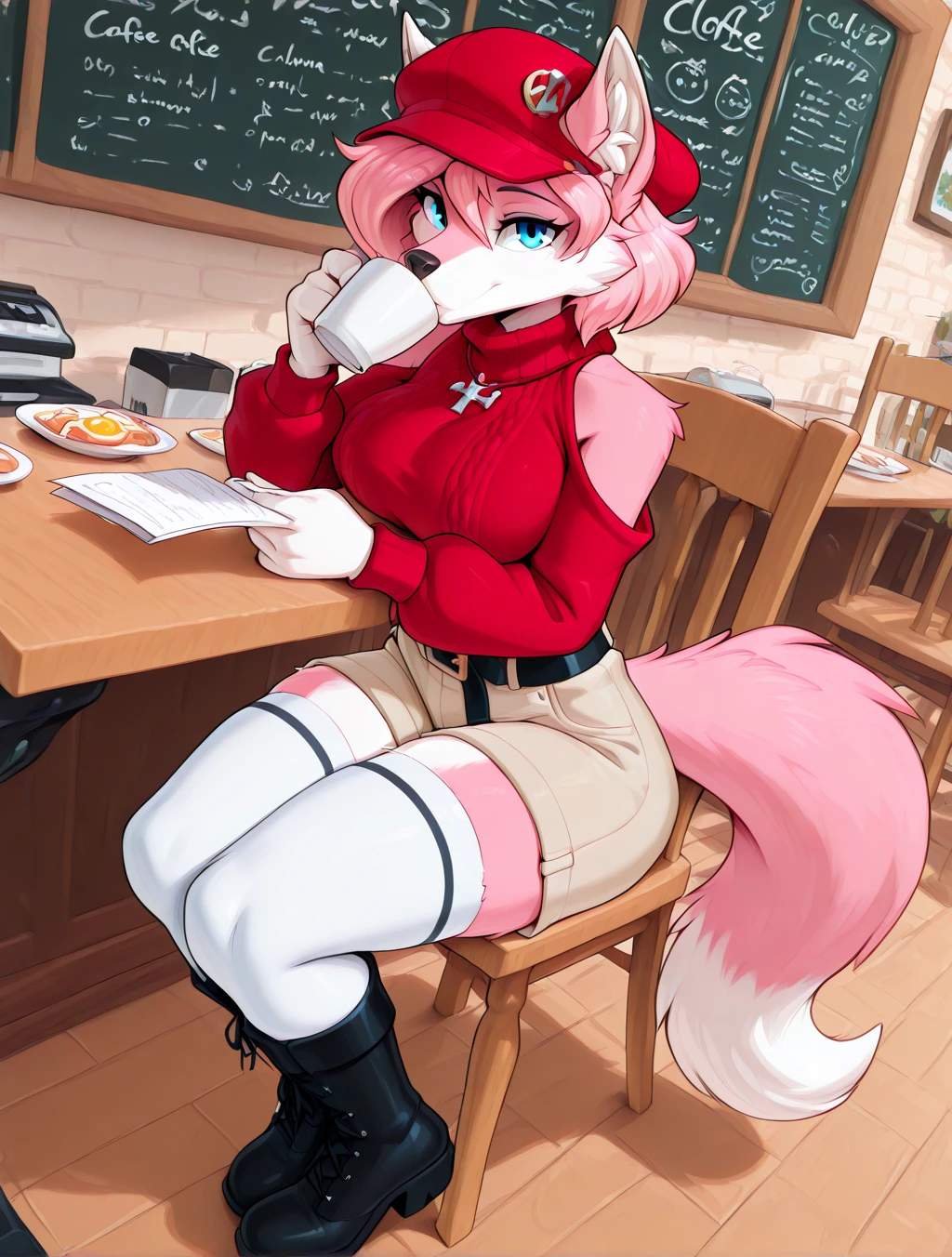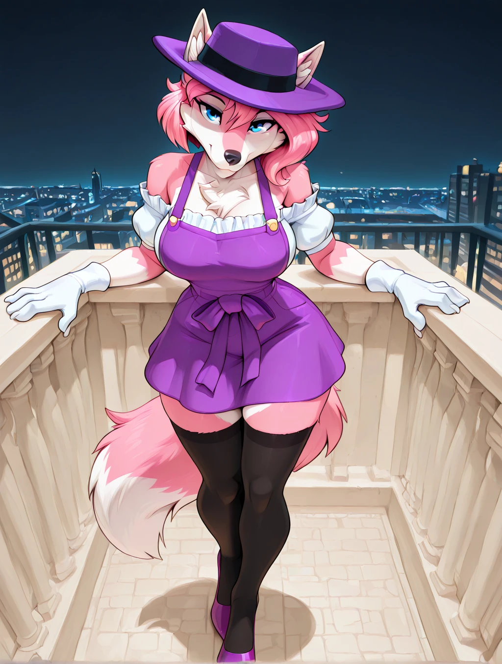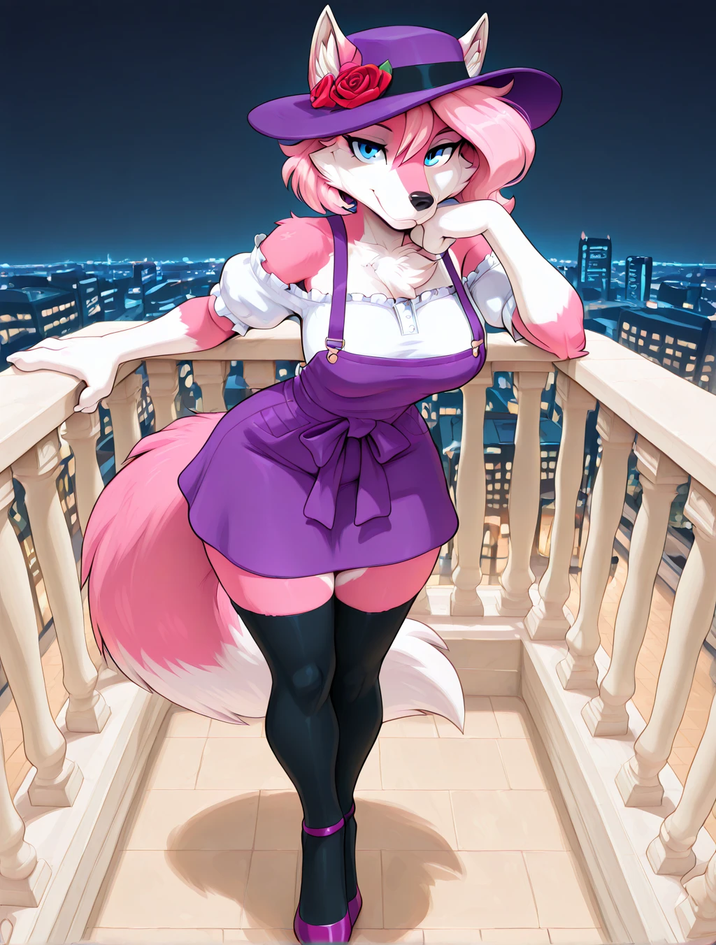 (furry female, anthro, digitigrade, wolf, pink fur, white fur, multicolored fur, blue eyes, wolf ears, wolf tail, fluffy tail, snout, animal nose, pink hair, short hair, side hair)