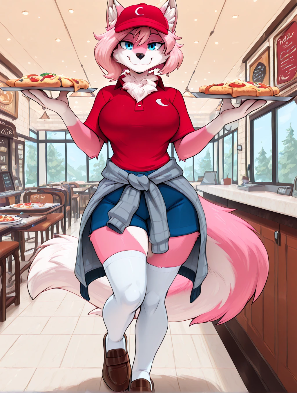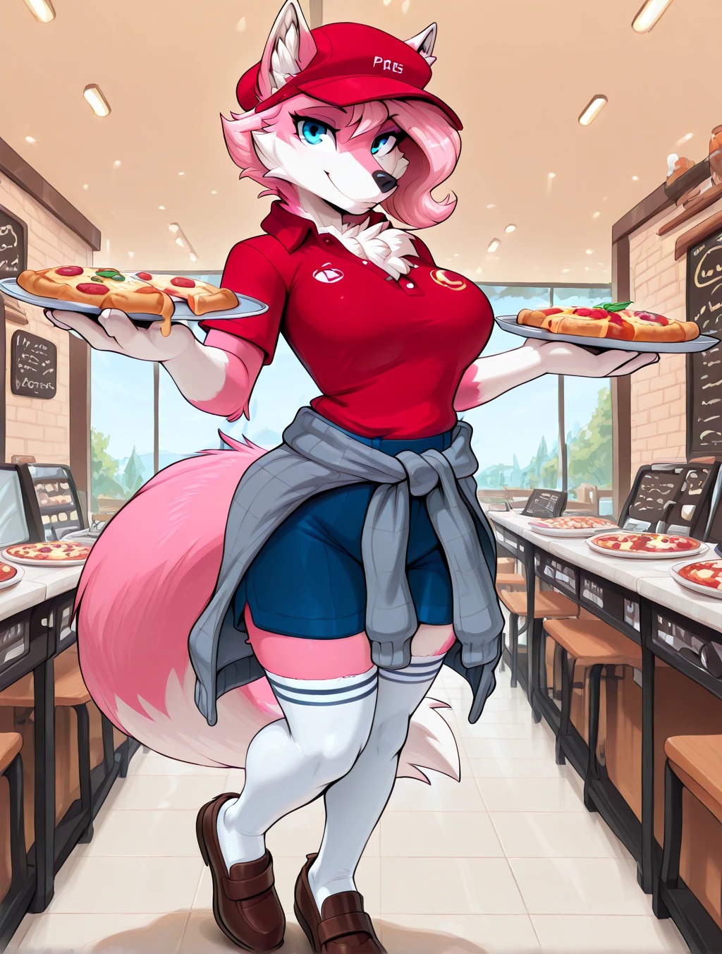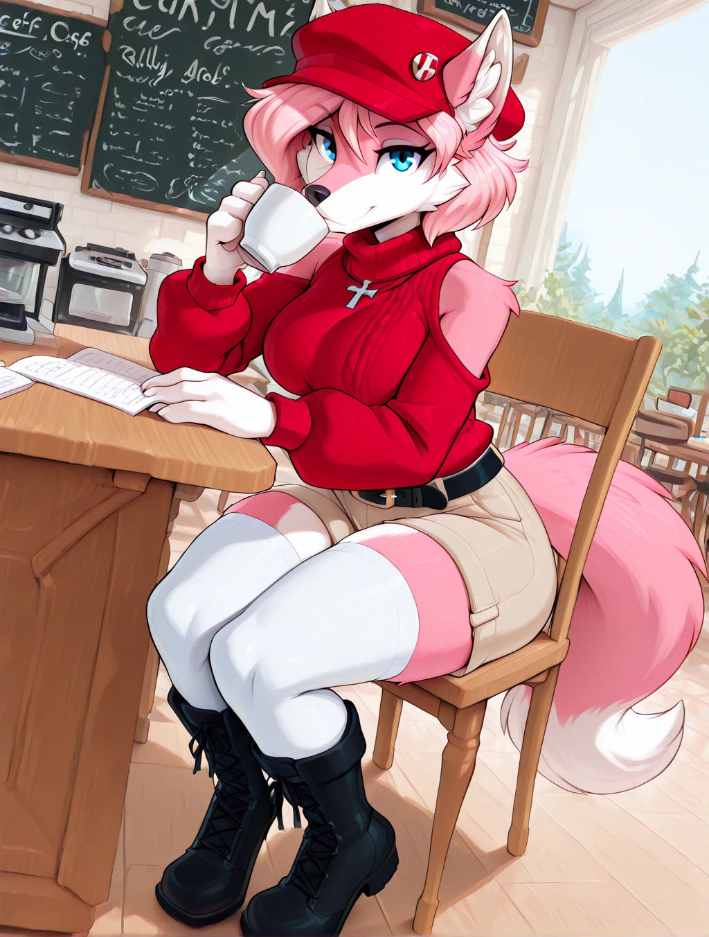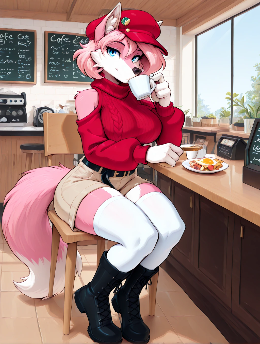 (furry female, anthro, digitigrade, wolf, pink fur, white fur, multicolored fur, blue eyes, wolf ears, wolf tail, fluffy tail, snout, animal nose, pink hair, short hair, side hair)
