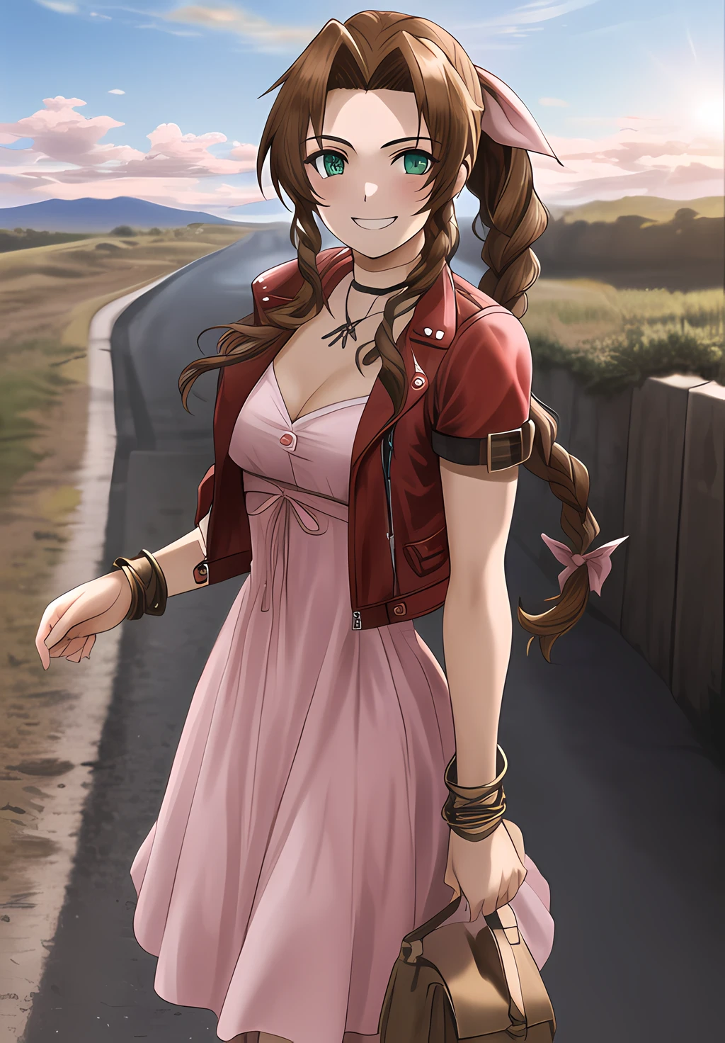 As many of her appearances show the pink dress in a very light color, it's best to prompt this with green eyes, pink dress, corneo_aerith as it sometimes (though rare) doesn't get the dress or eye color right by itself.