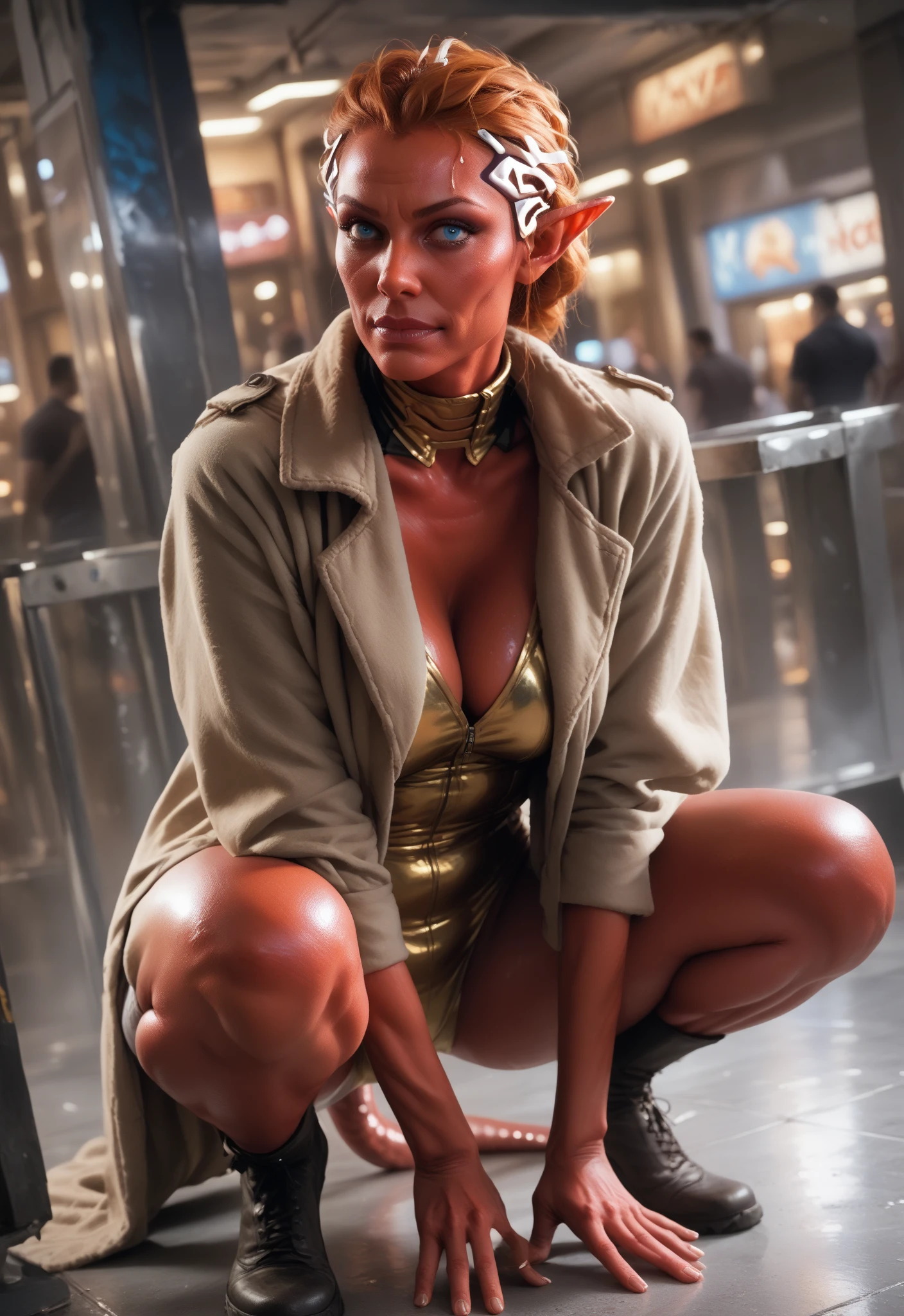 red skin, orange hair, large pointed scaled ears, scaled tail