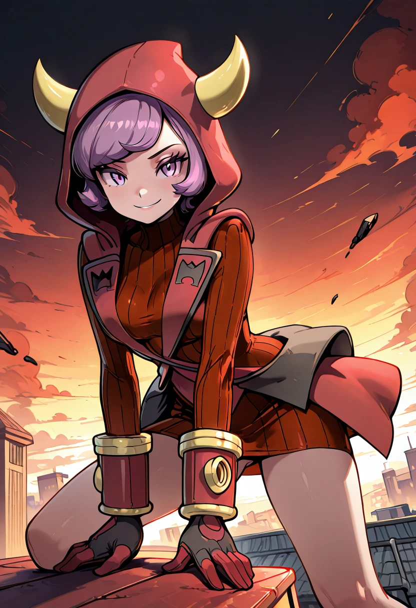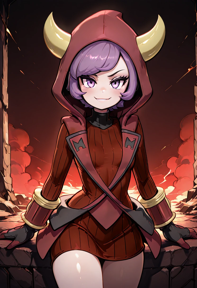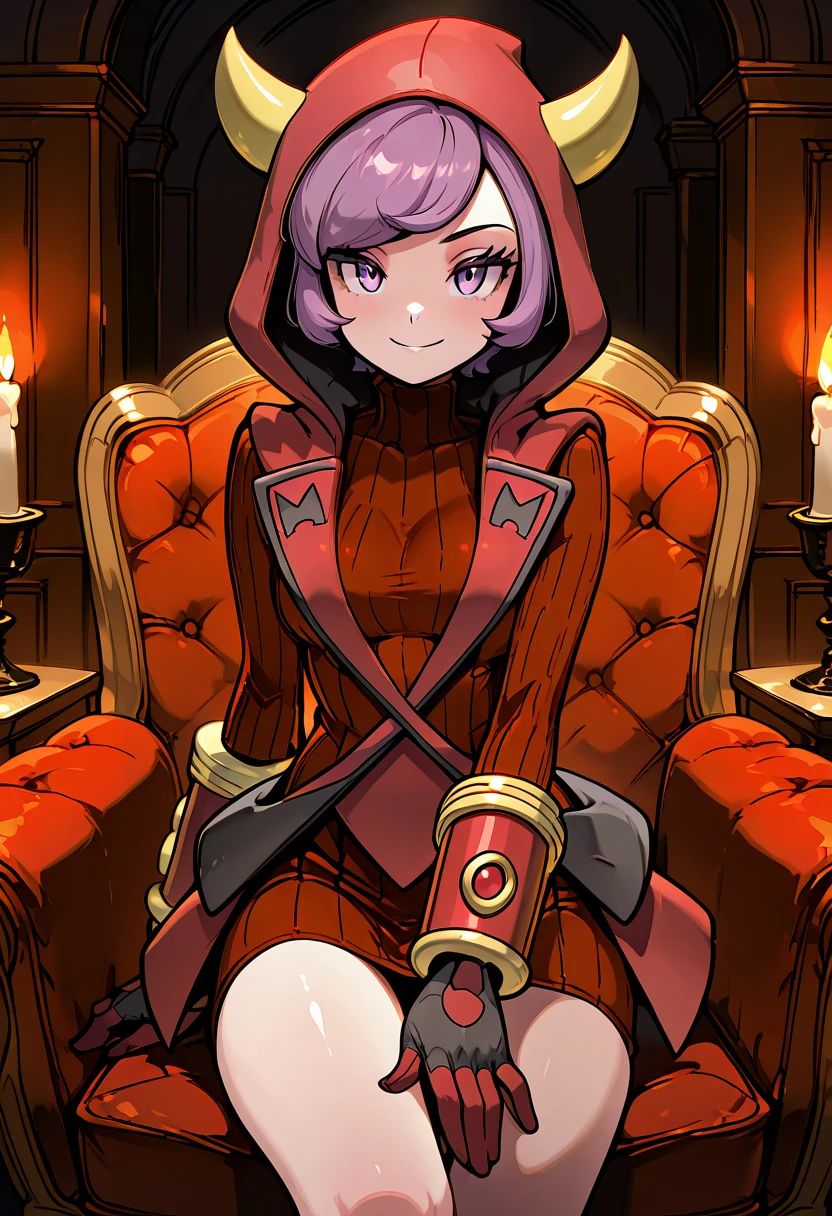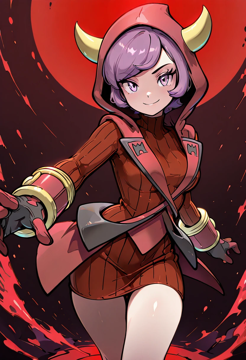 zzCourtney, purple eyes, purple hair, hoodie, red dress, red gloves, fake horns, sweater dress, ribbed dress, turtleneck dress,