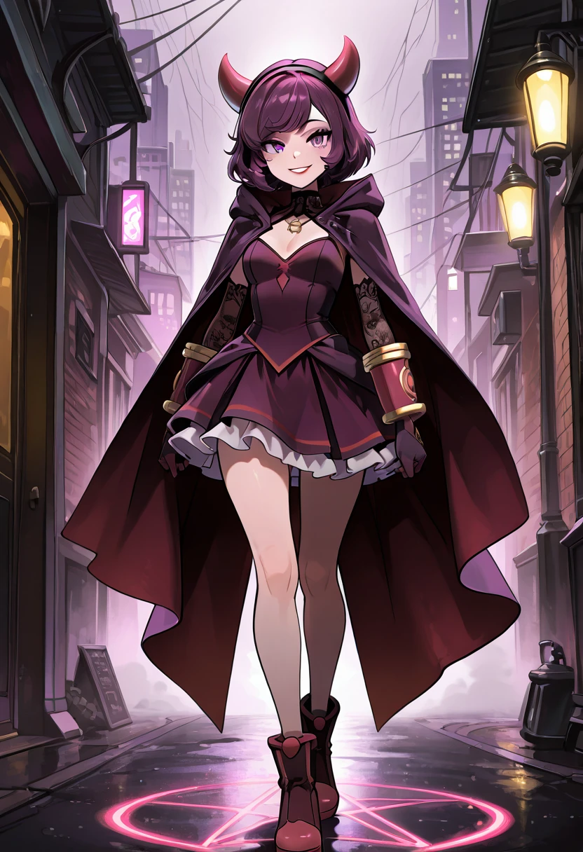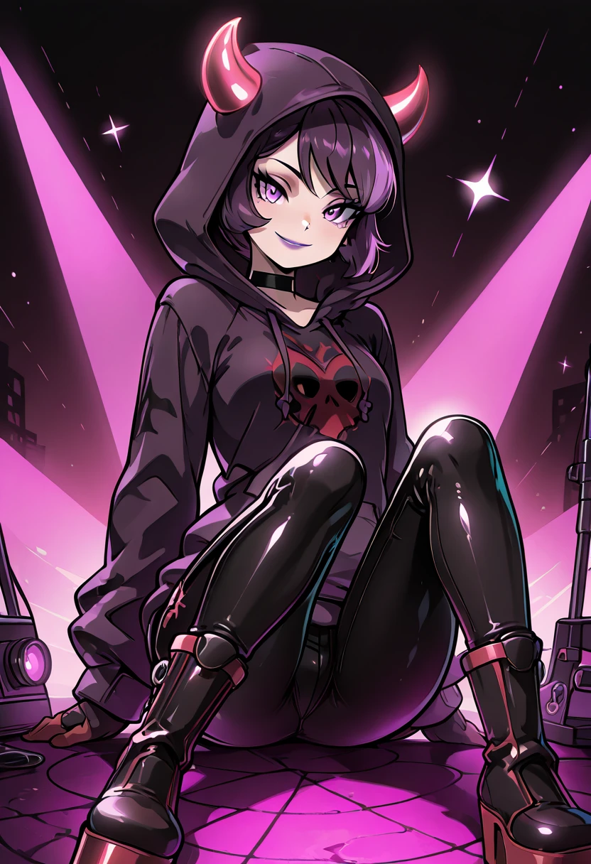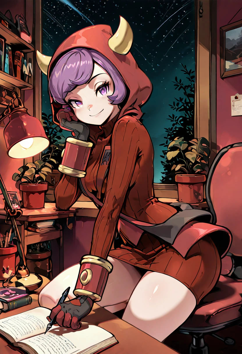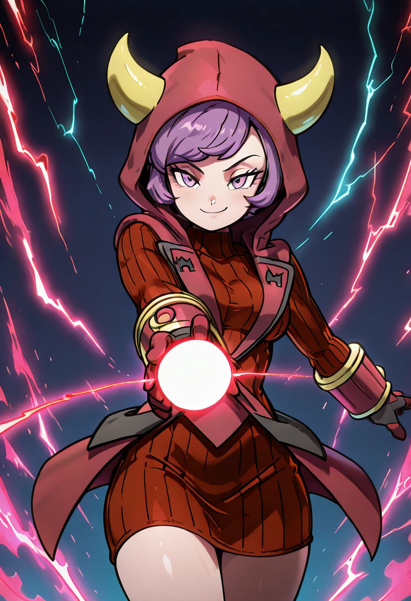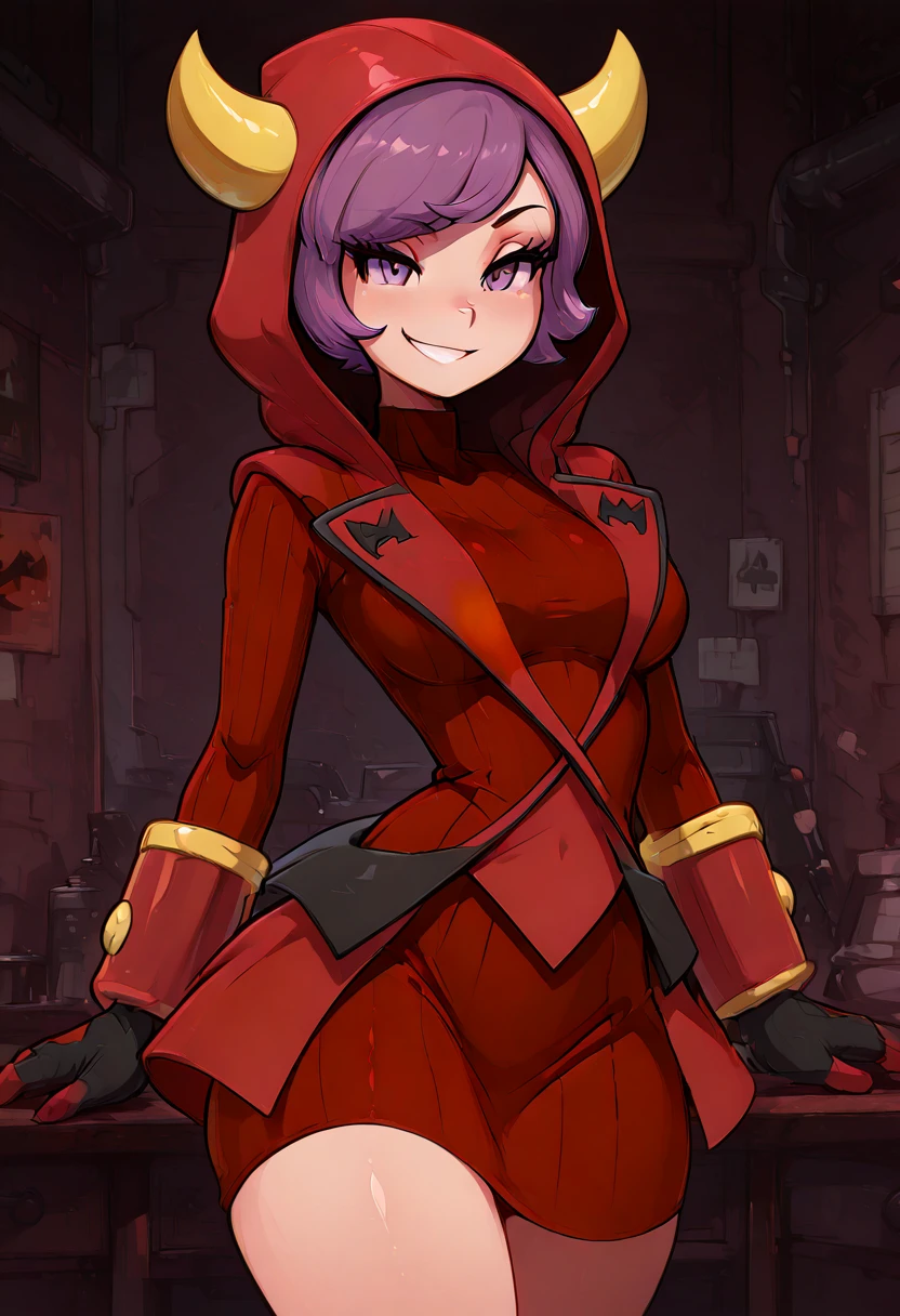 zzCourtney, purple eyes, purple hair, hoodie, red dress, red gloves, fake horns, sweater dress, ribbed dress, turtleneck dress,
