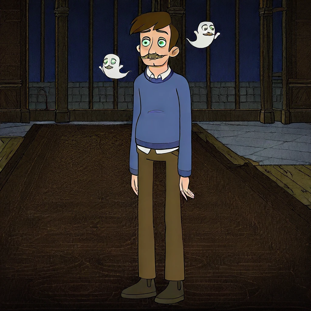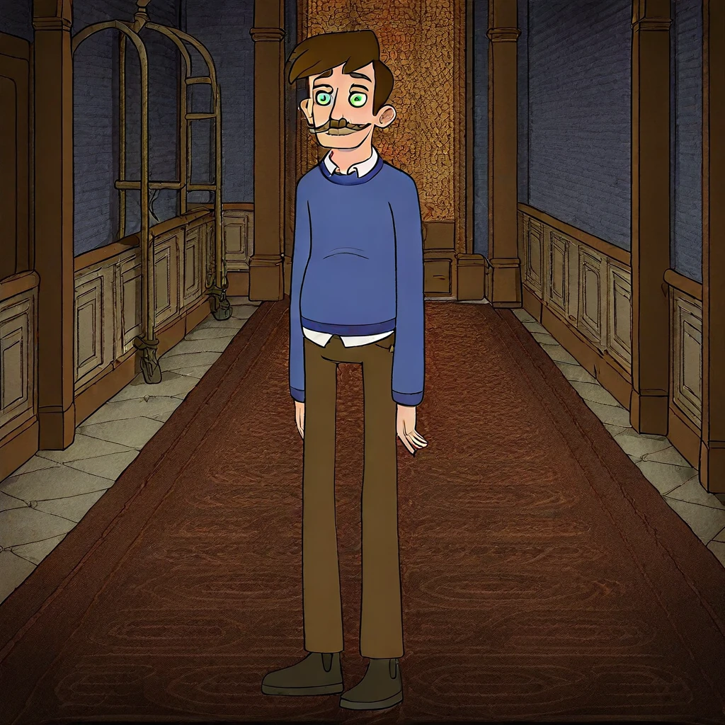 NathanFreeling, 1boy, solo, adult male, Nathan Hair Style, brown hair, fair skin, green eyes, mustache, thin tall body, blue sweater over white shirt, brown pants, dark shoes,