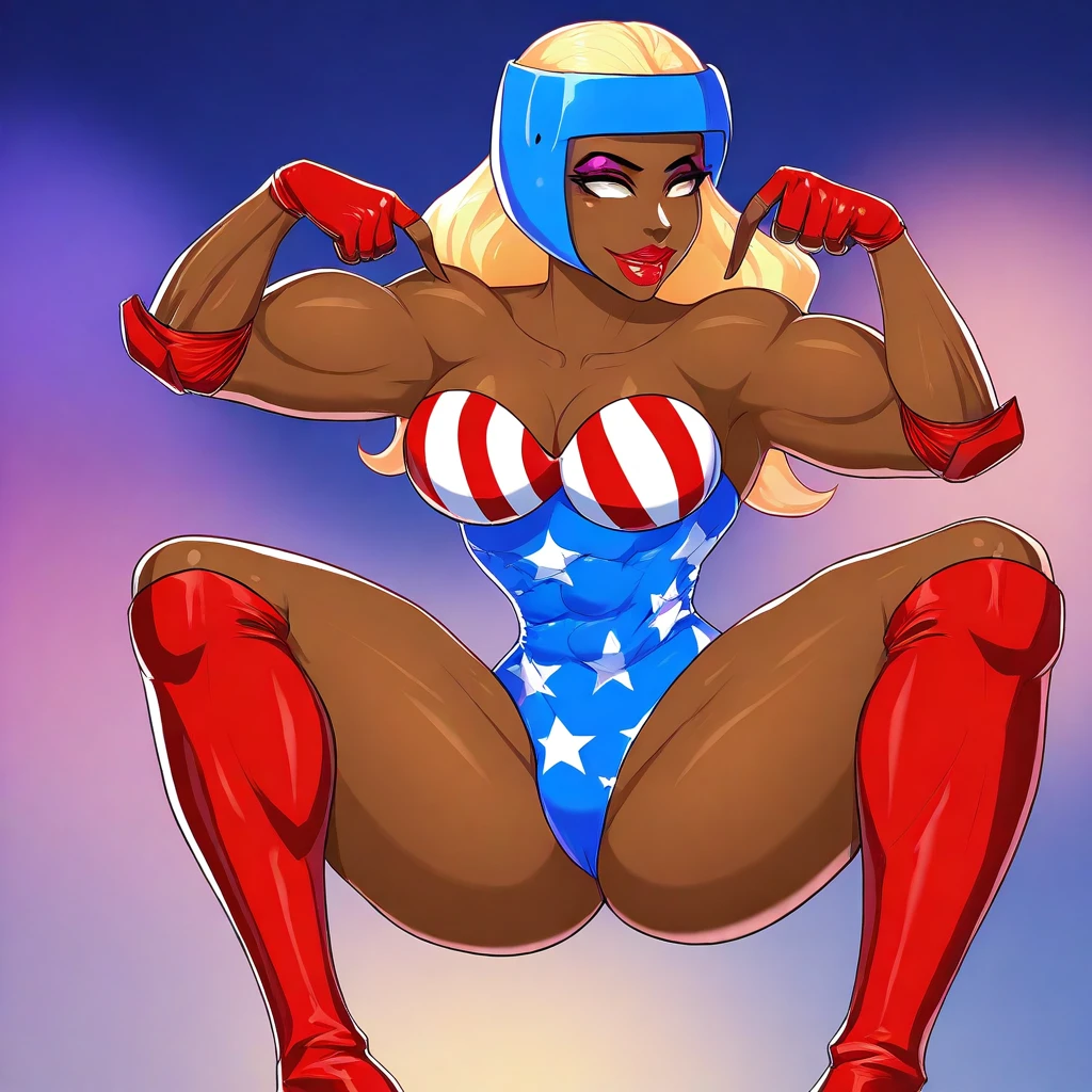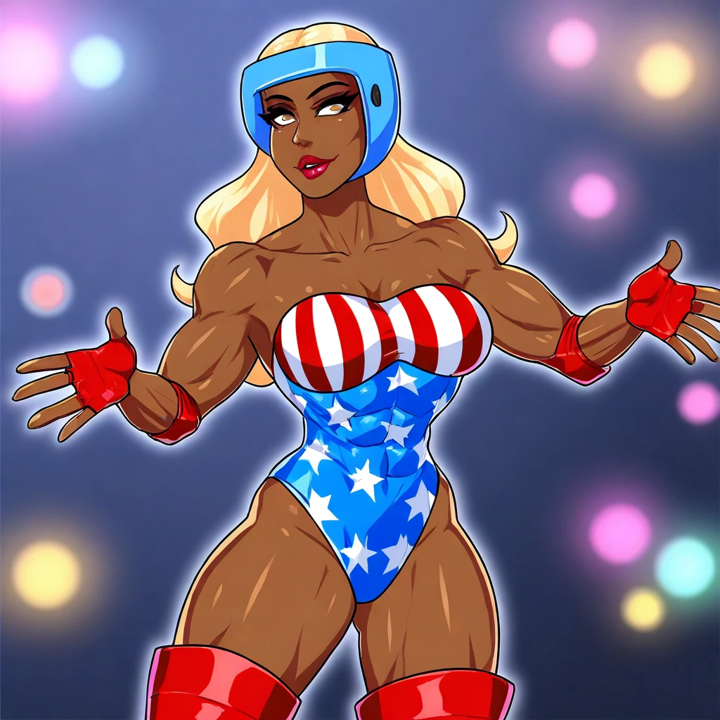 PlatinumEC, 1girl, solo, curvy body, muscular female, dark skin, dark-skinned female, blonde hair, long hair, blue boxing helmet, brown eyes, full lips, collarbone, biceps, large breast, striped cleavage, blue patriotic leotard, elbow pad, large butt, thick thighs, abs, muscular legs, muscular arms, red fingerless gloves, red thigh-high, heeled boots, makeup, lipstick, muscular body,