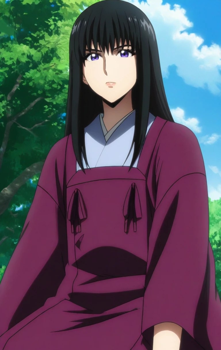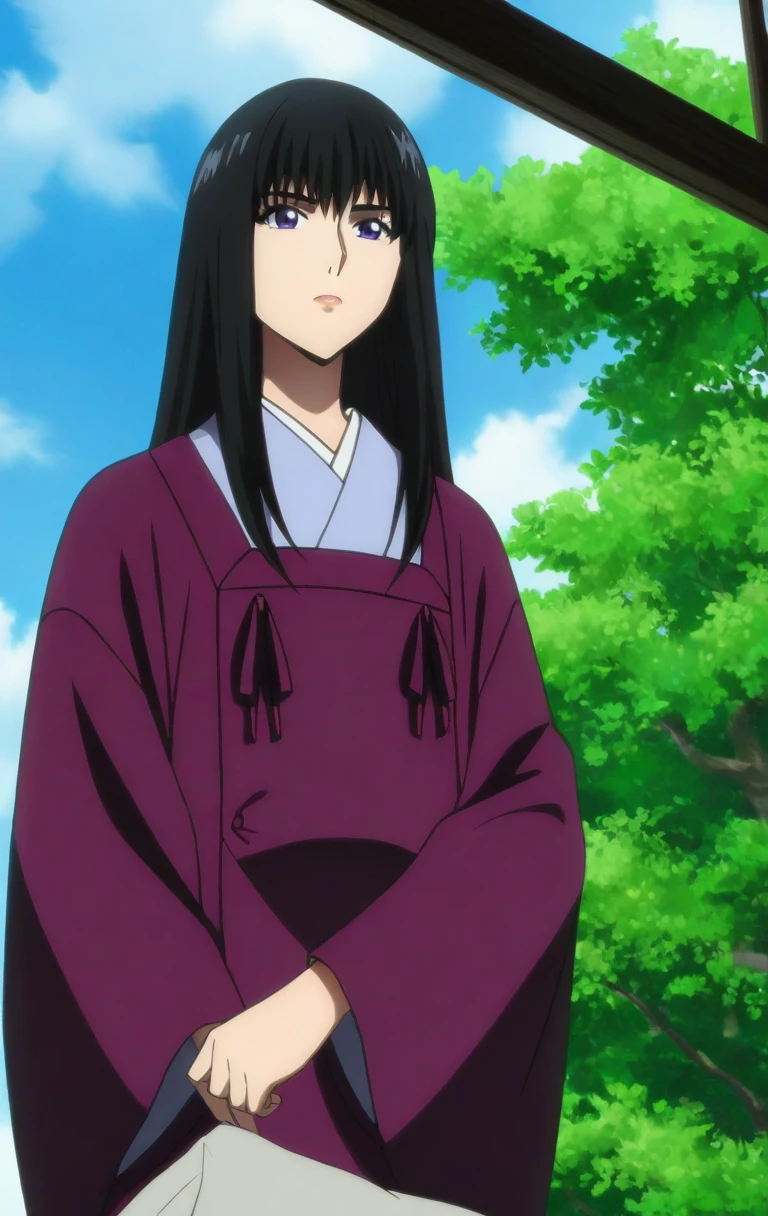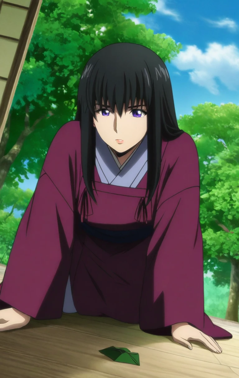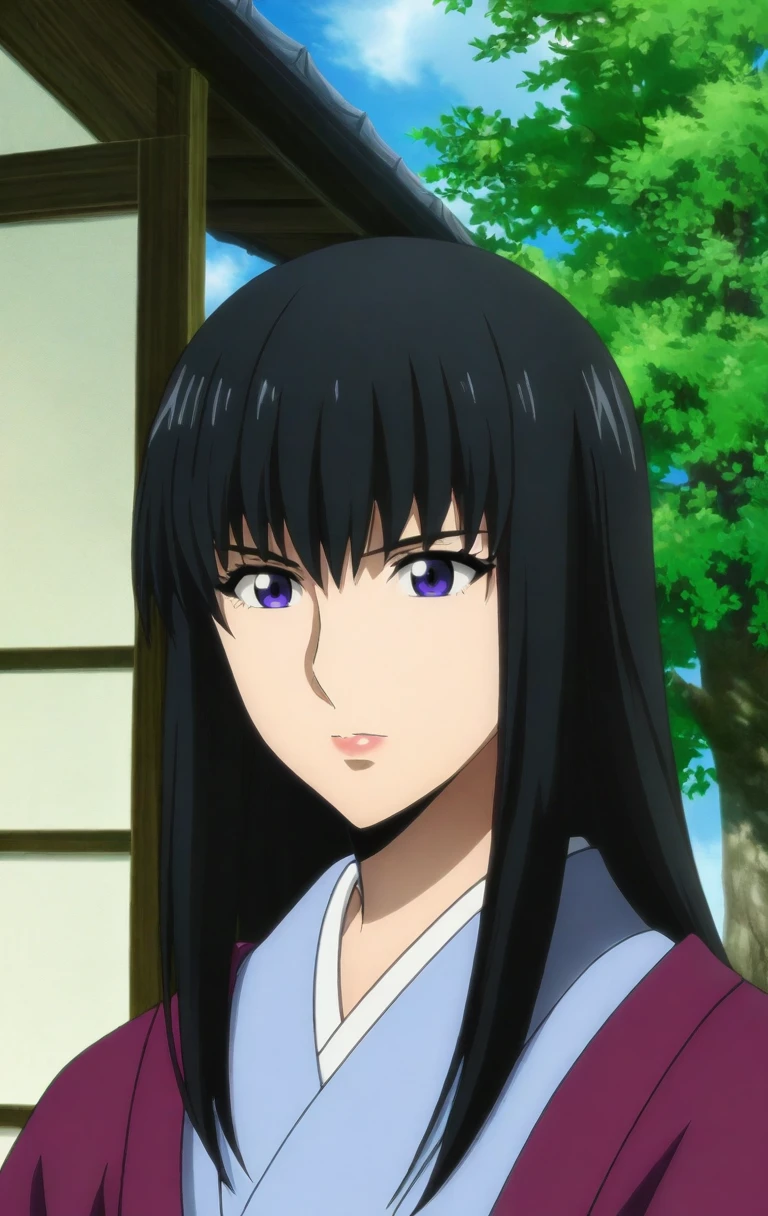 r0n1u1n, 1girl, solo, long hair, black hair, purple eyes, japanese clothes,kimono,lips, anime coloring