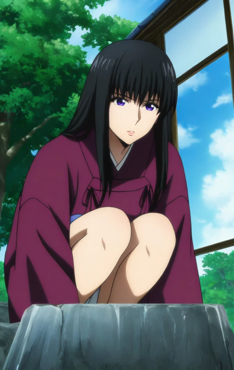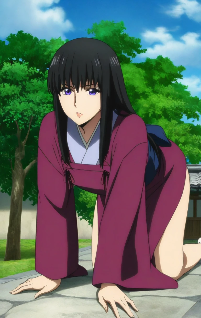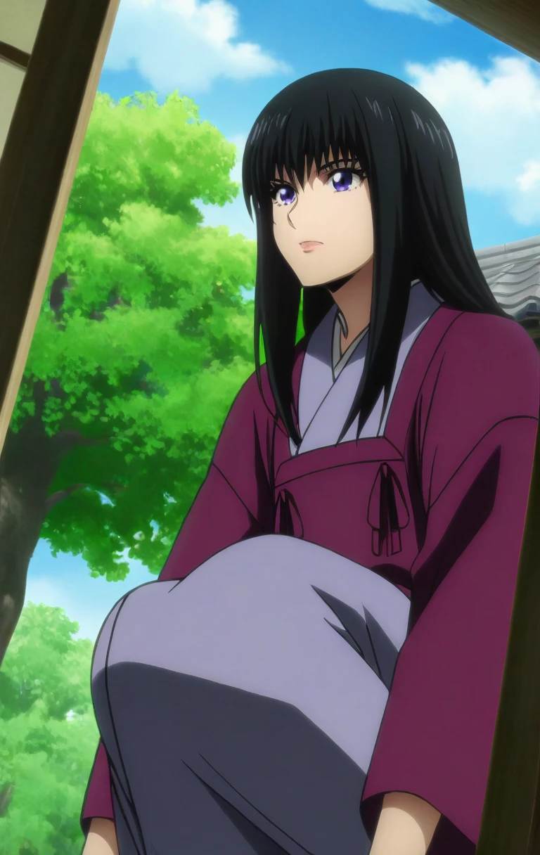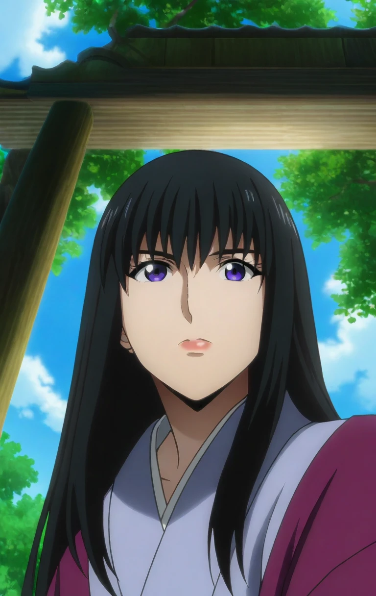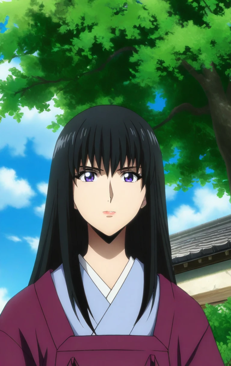 r0n1u1n, 1girl, solo, long hair, black hair, purple eyes, japanese clothes,kimono,lips, anime coloring
