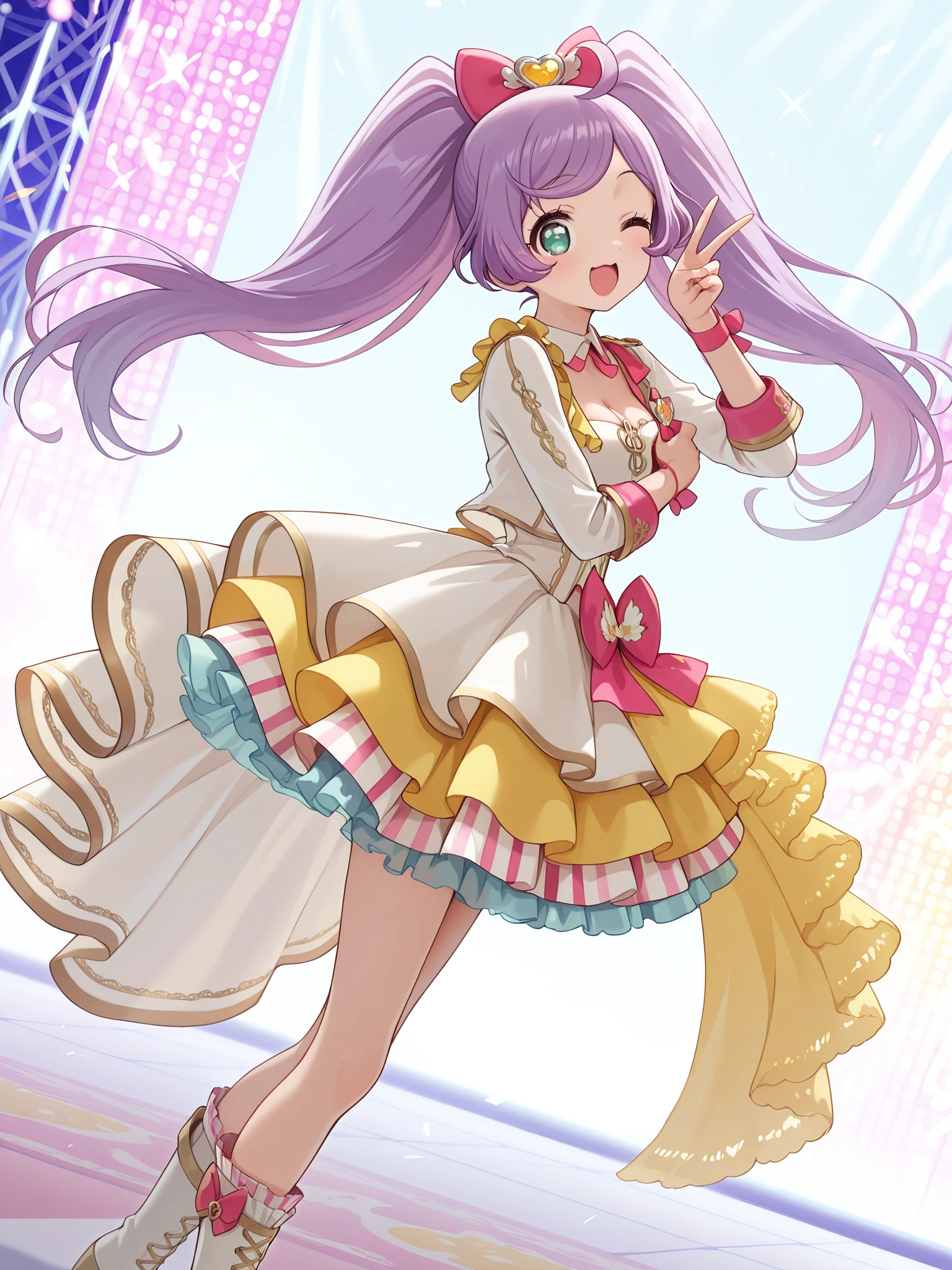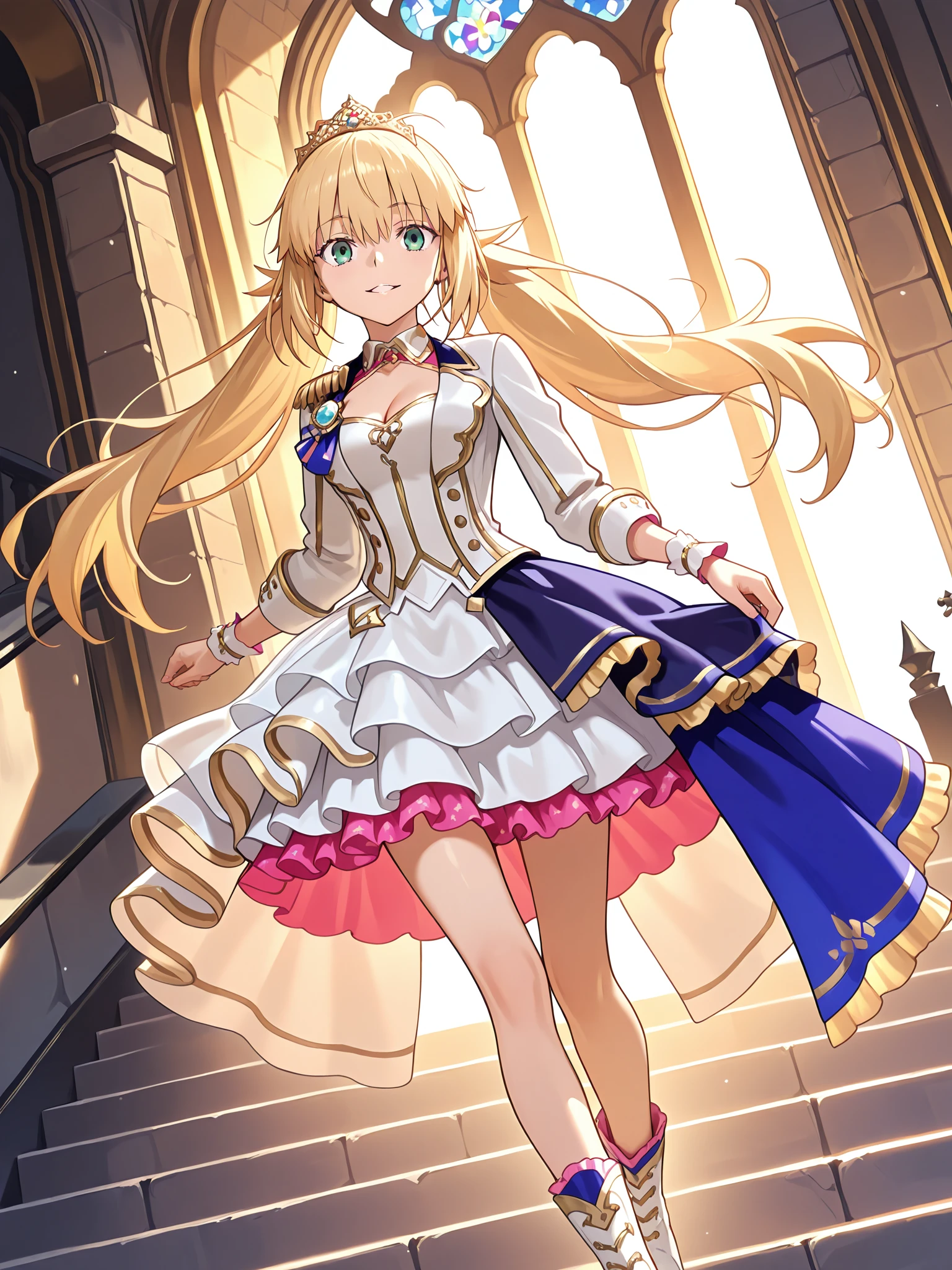 idol_dress_Cind, dress, brown eyes, layered dress, layered skirt, cleavage, frills, long sleeves, tiara, boots, white jacket,