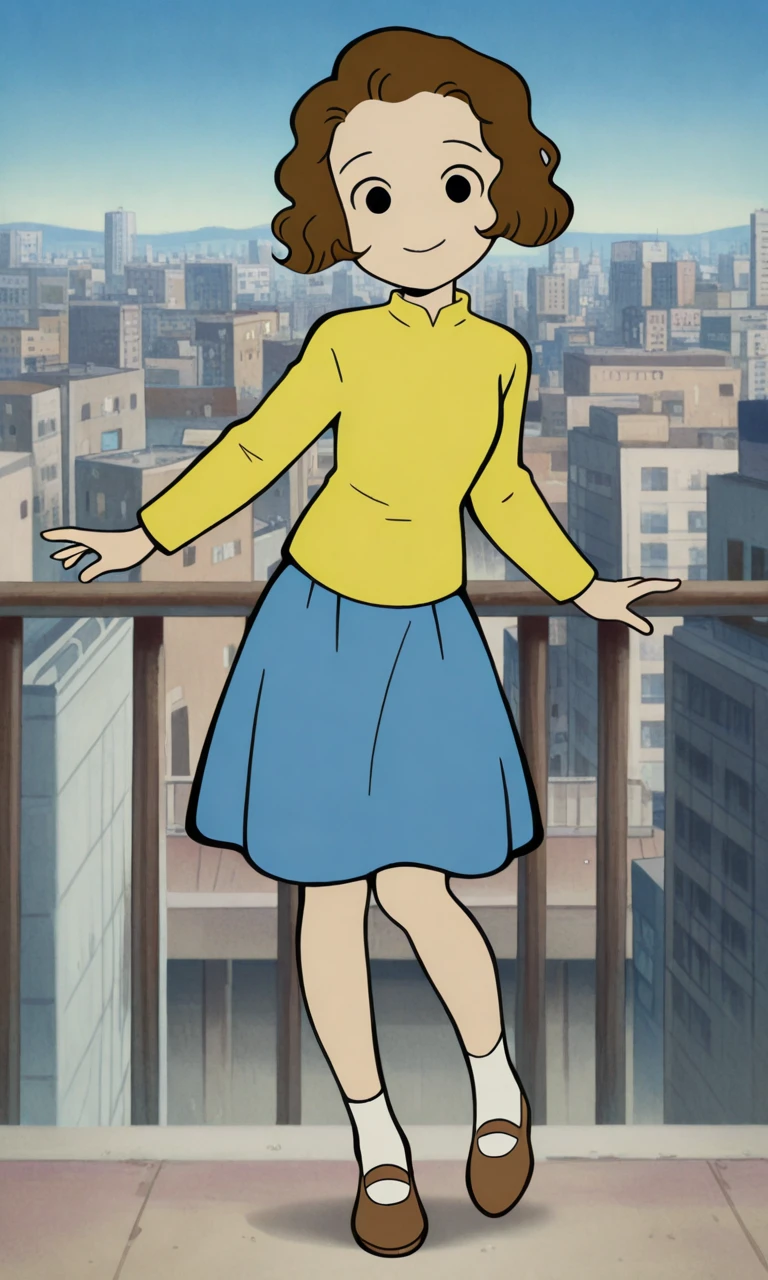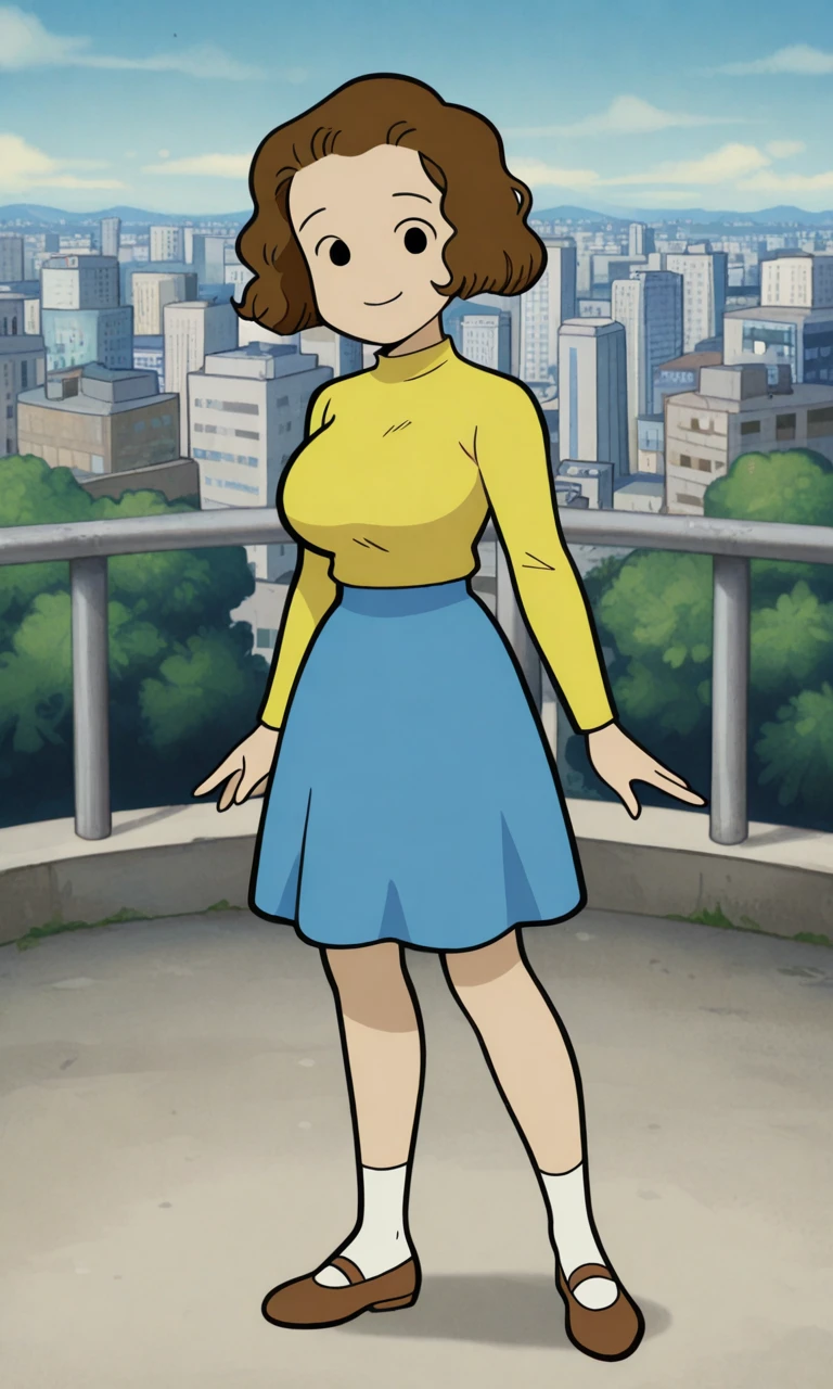 yellow long-sleeved shirt, blue skirt, white socks, brown flats
