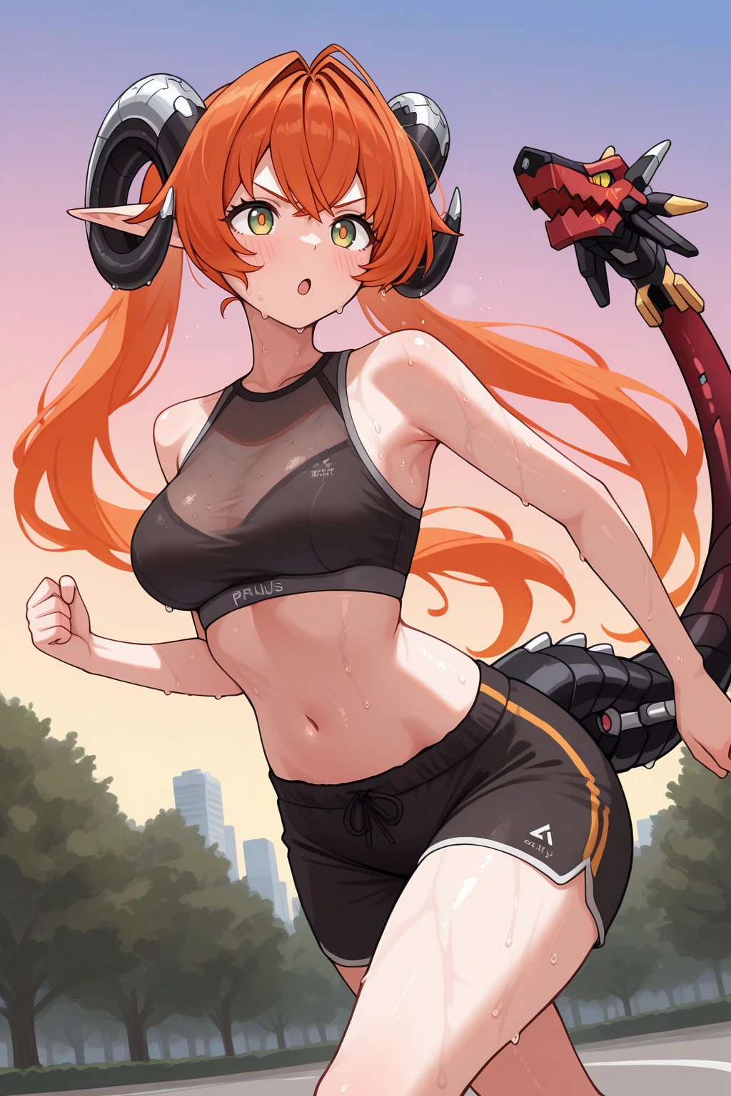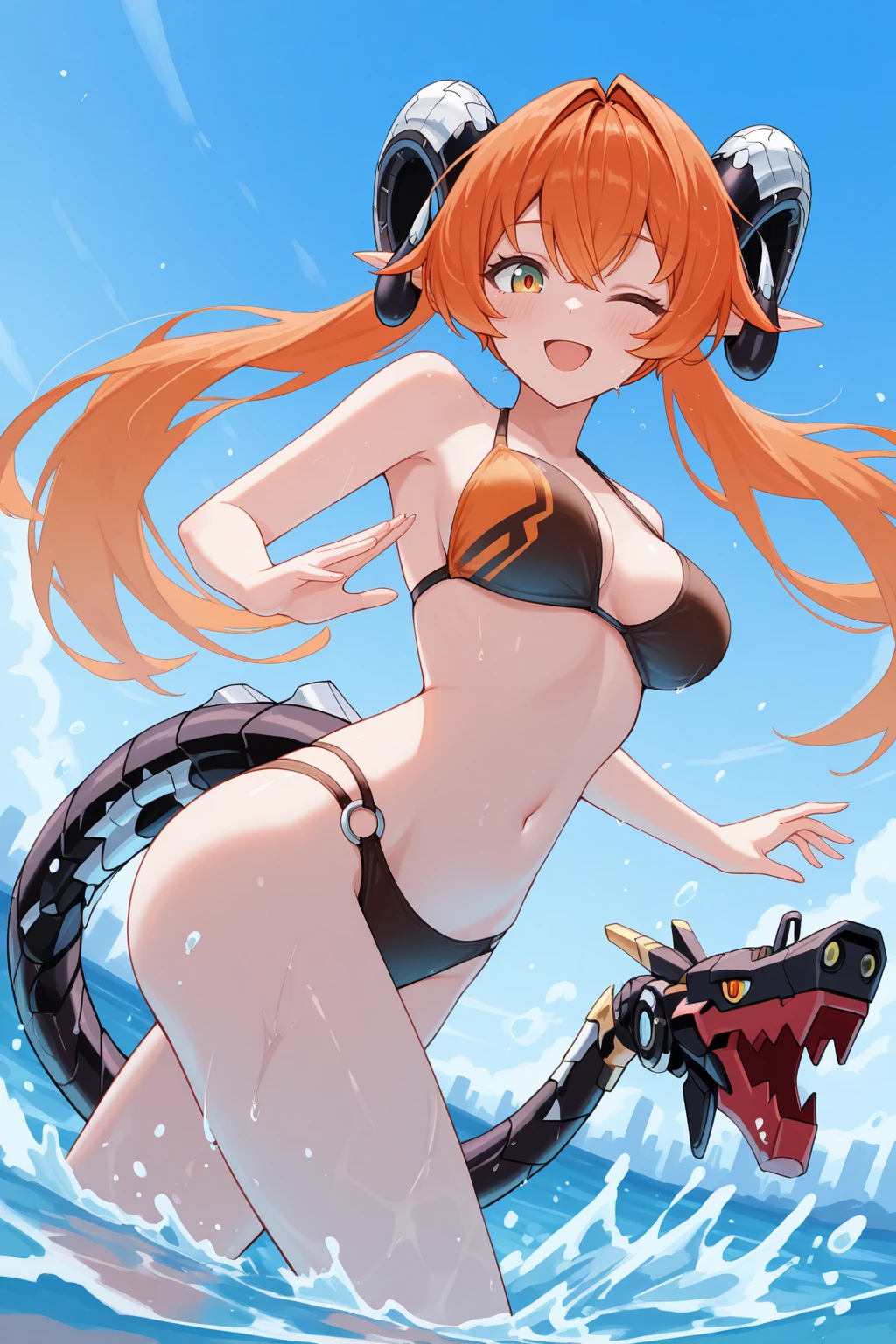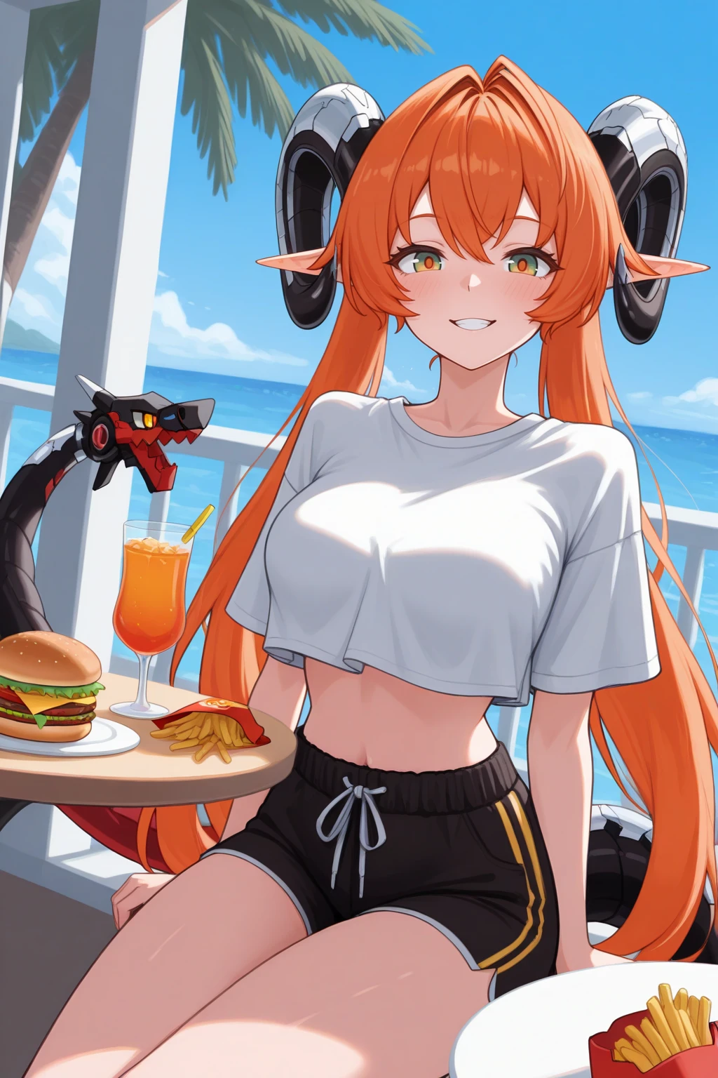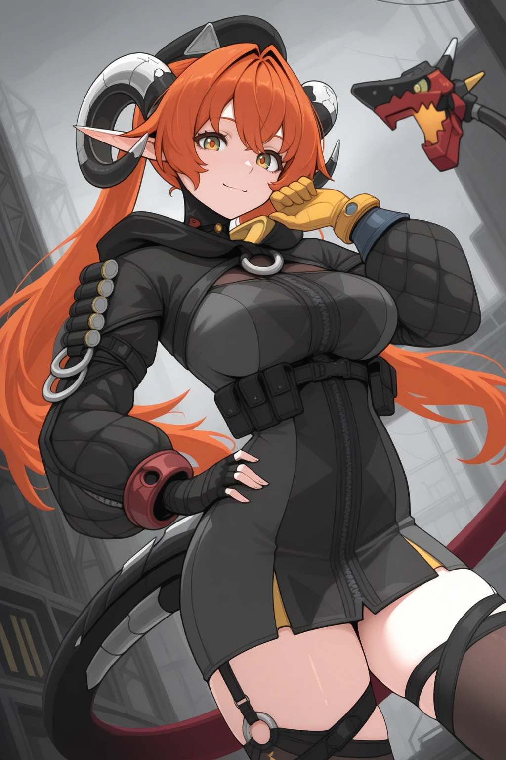 Appearance : 0rph3us, curled horns, mechanical tail, multicolored tail, black tail, red tail, pointy ears, large breasts, multicolored eyes, green eyes, orange eyes, yellow eyes, orange hair, hair between eyes, hair intakes, very long hair, twintails